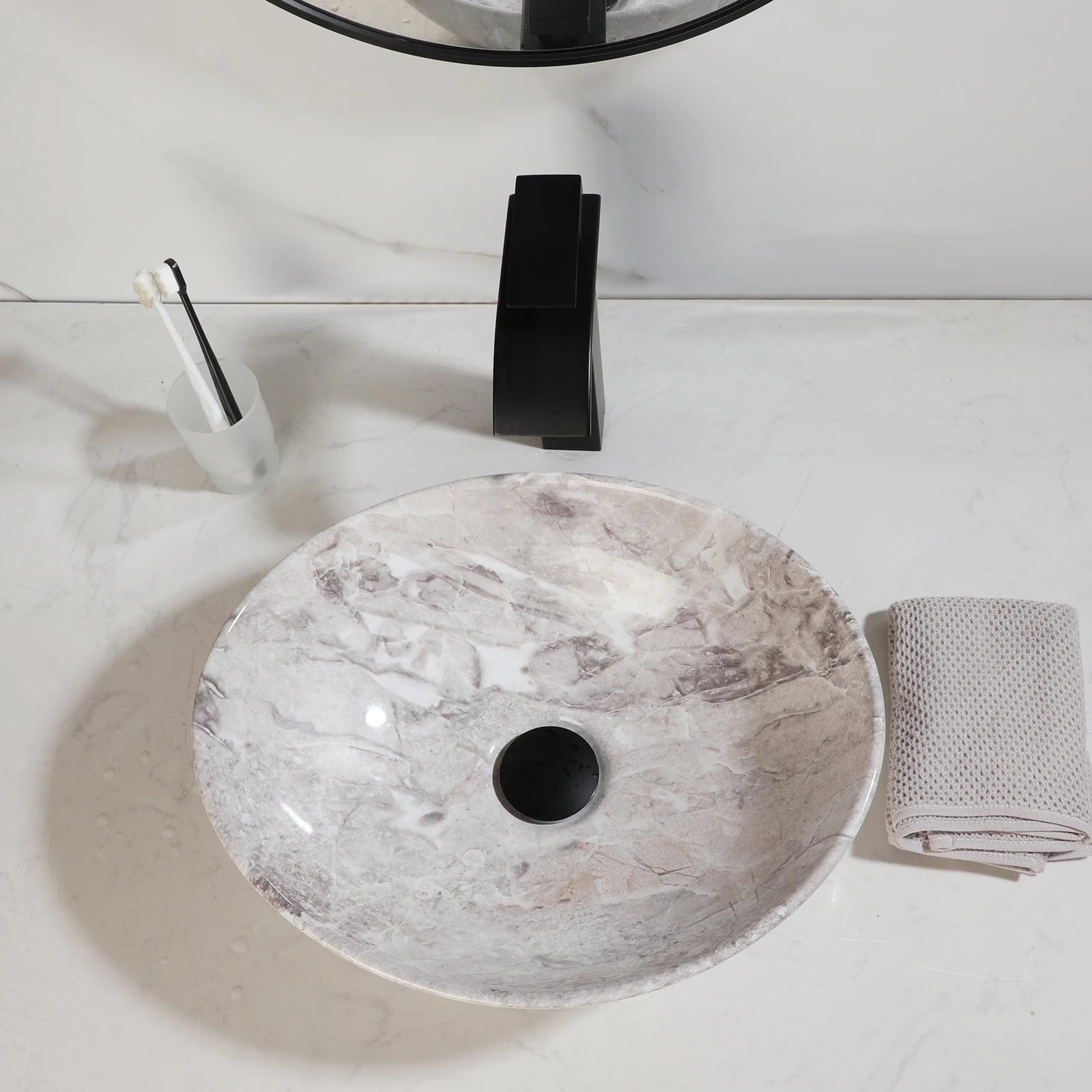 KEMAIDI Ovales Waschbecken mit Wasserhahn, weiße Marmorierung, Badezimmer-Waschbecken über der Theke, Keramik-Waschbecken für Badezimmermischer