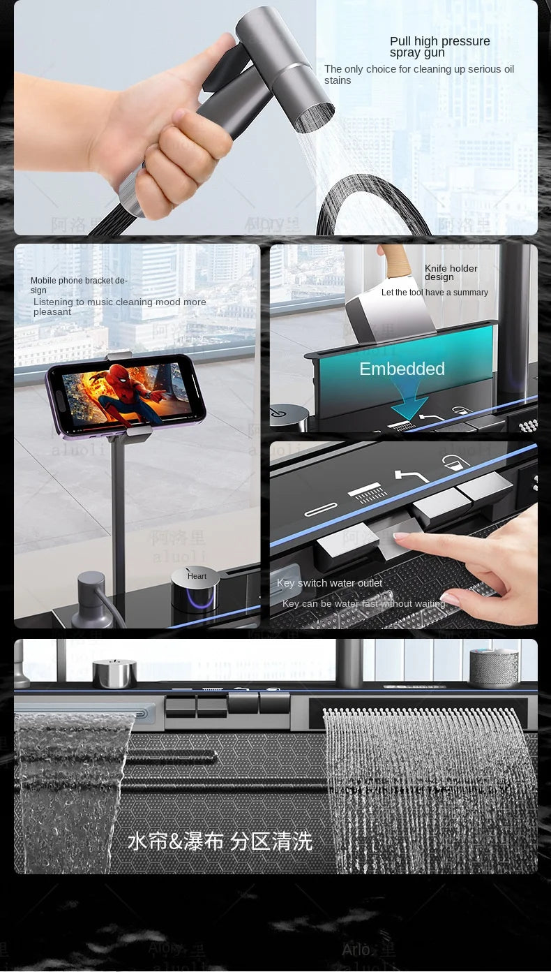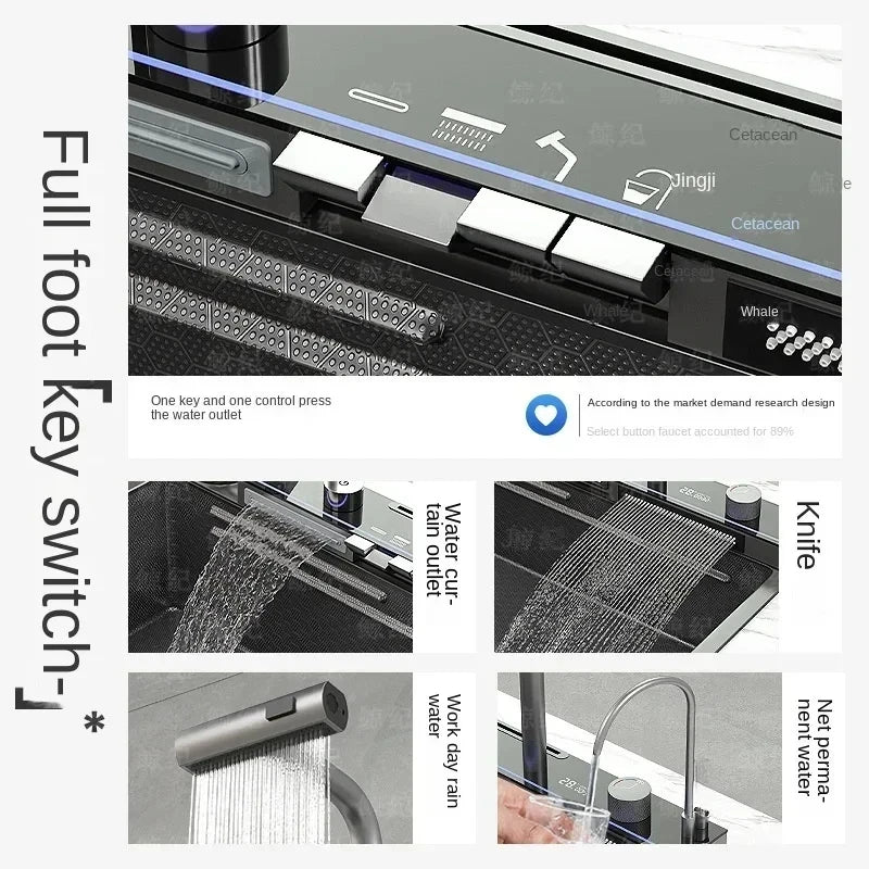 Kitchen 304 Stainless Steel Waterfall Sink, Large Single Slot, Digital Display Embossed Washing Basin Household Dishwashing Sink