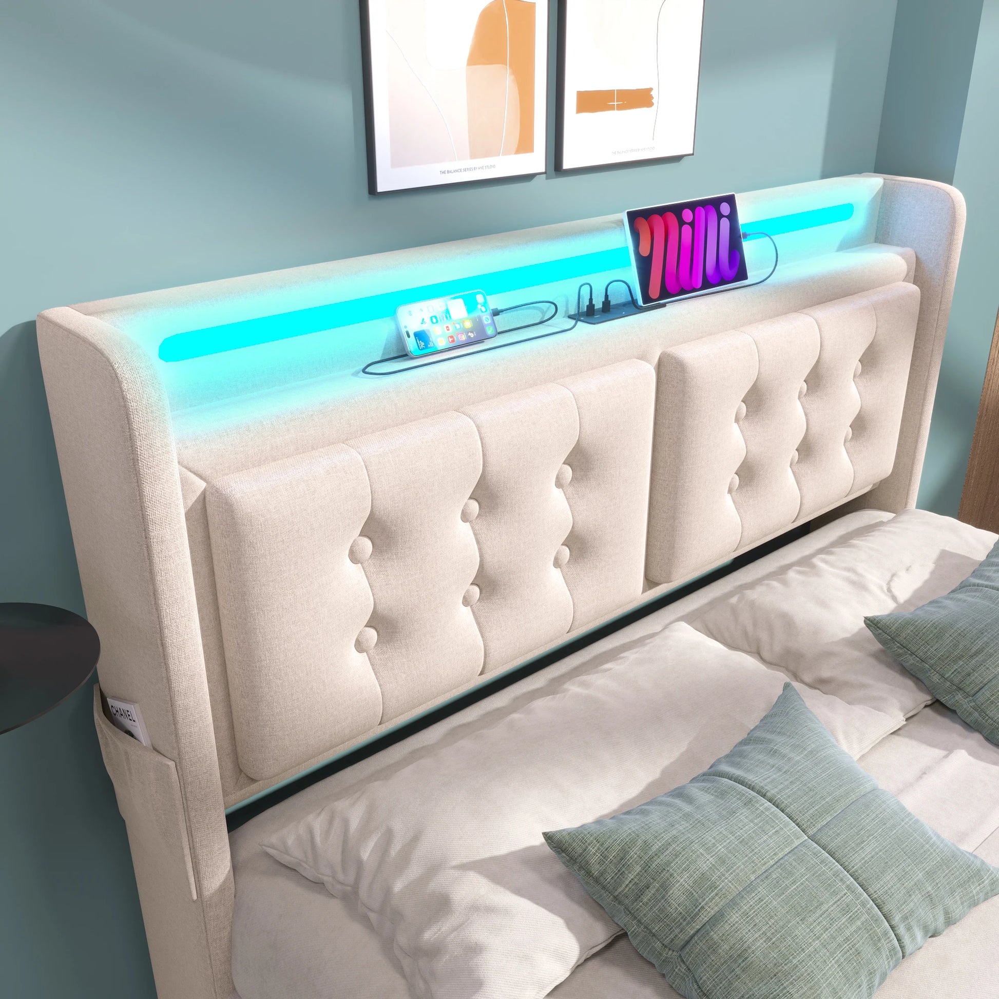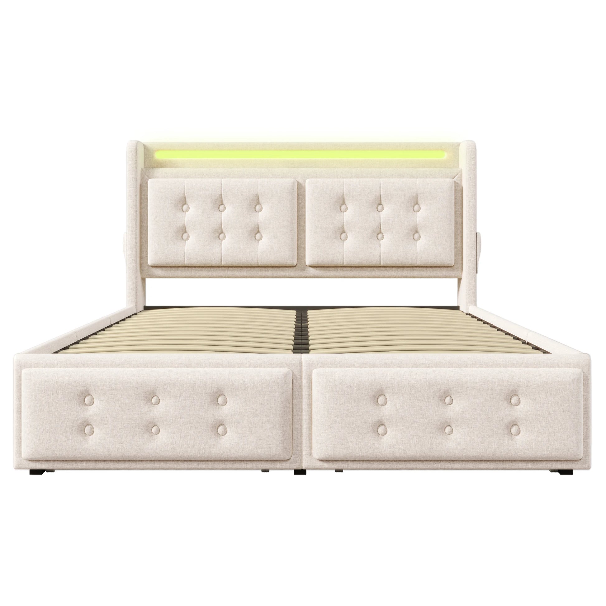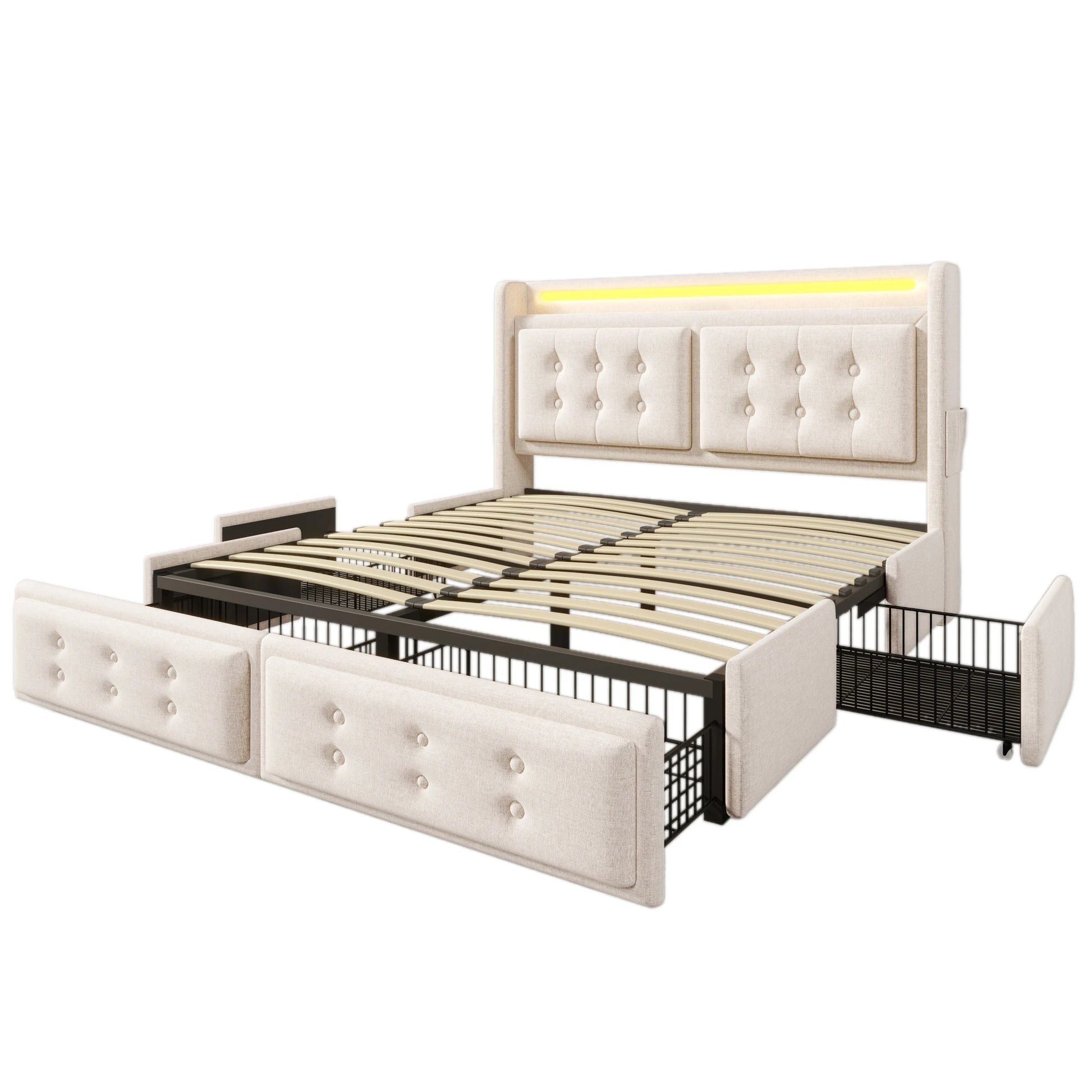 KOMHTOM Doppelbett Baumwolle - LED-Kopfteil, USB C Ladefunktion, 4 Schubladen, ohne Matratze