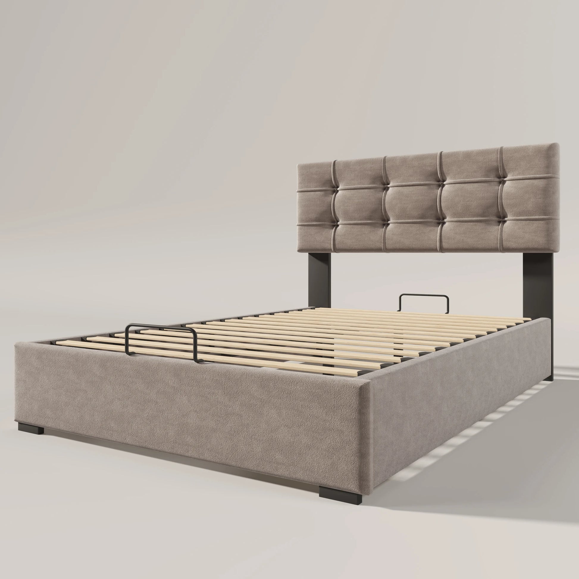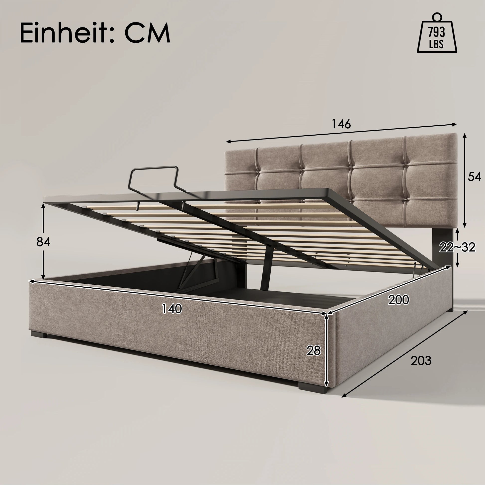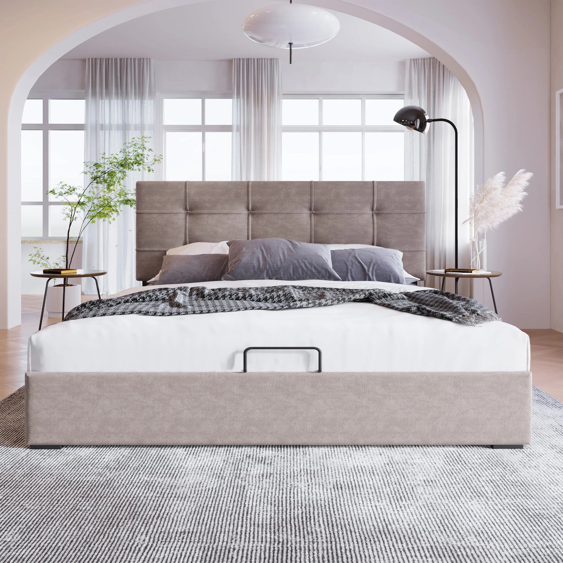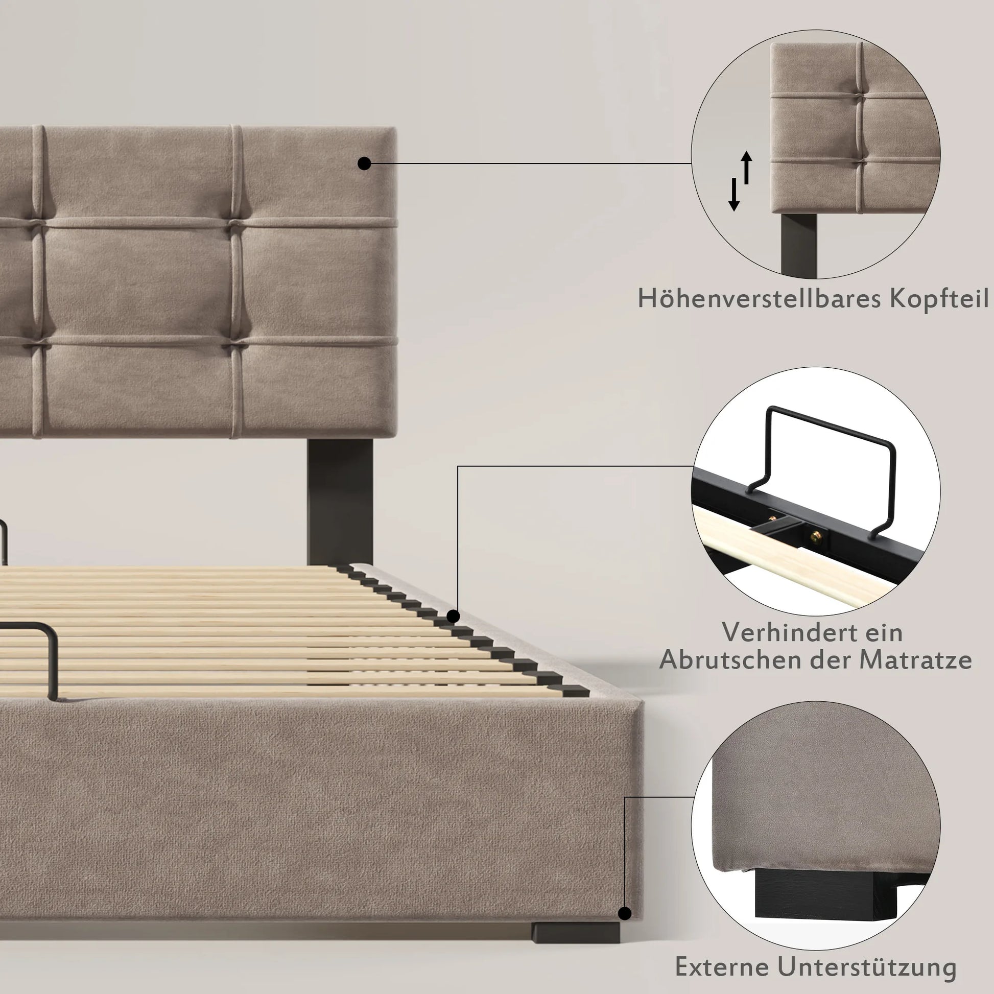 KOMHTOM Hydraulisch Polsterbett Hellgrau - Verstellbares Kopfteil, Metallrahmen-Lattenrost, mit Stauraum, Samtbezug