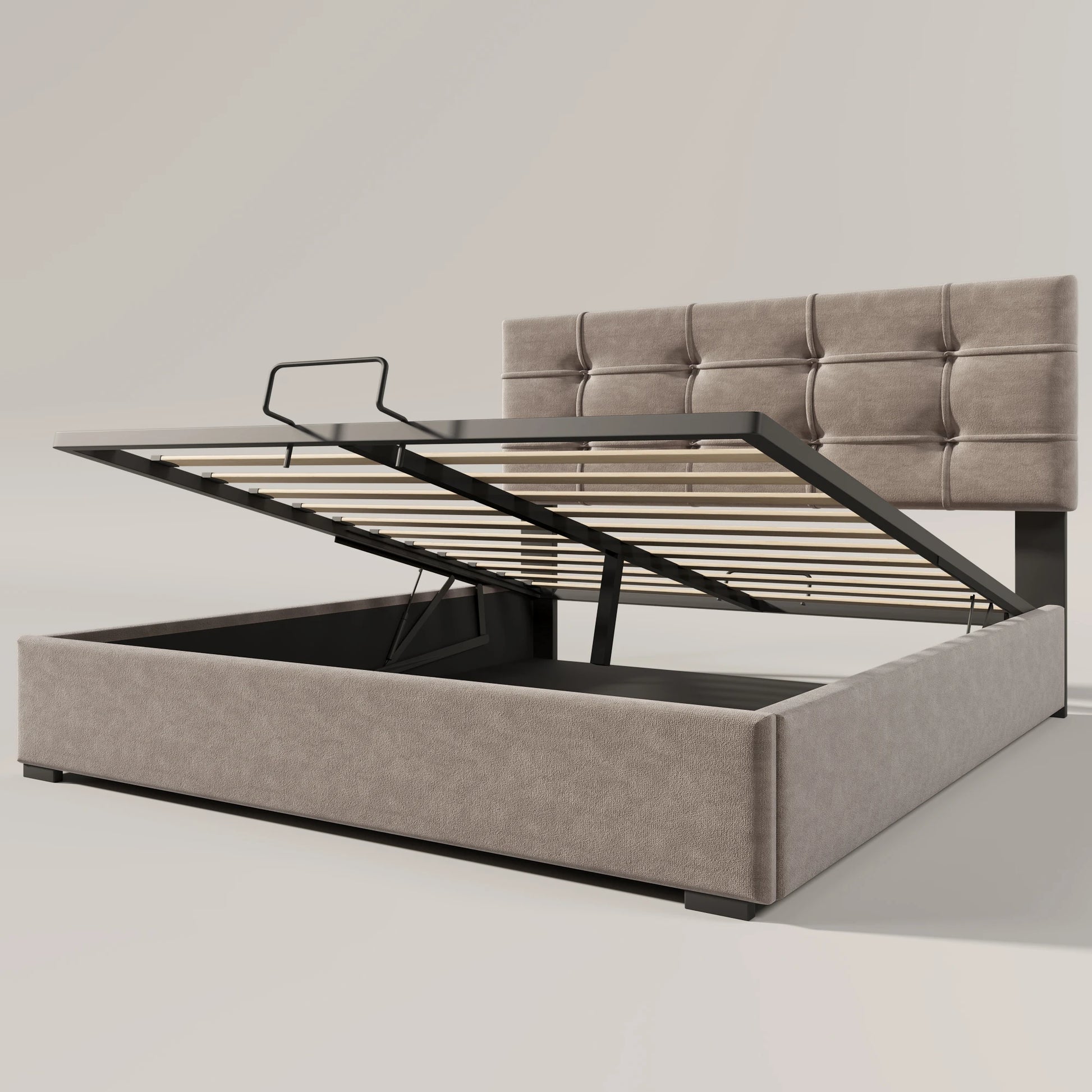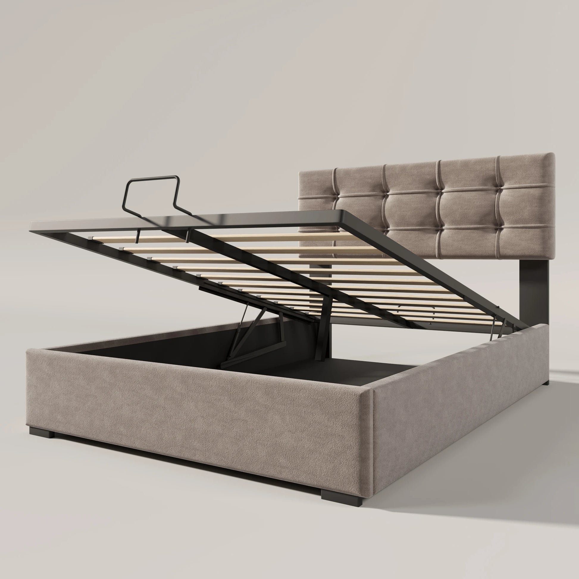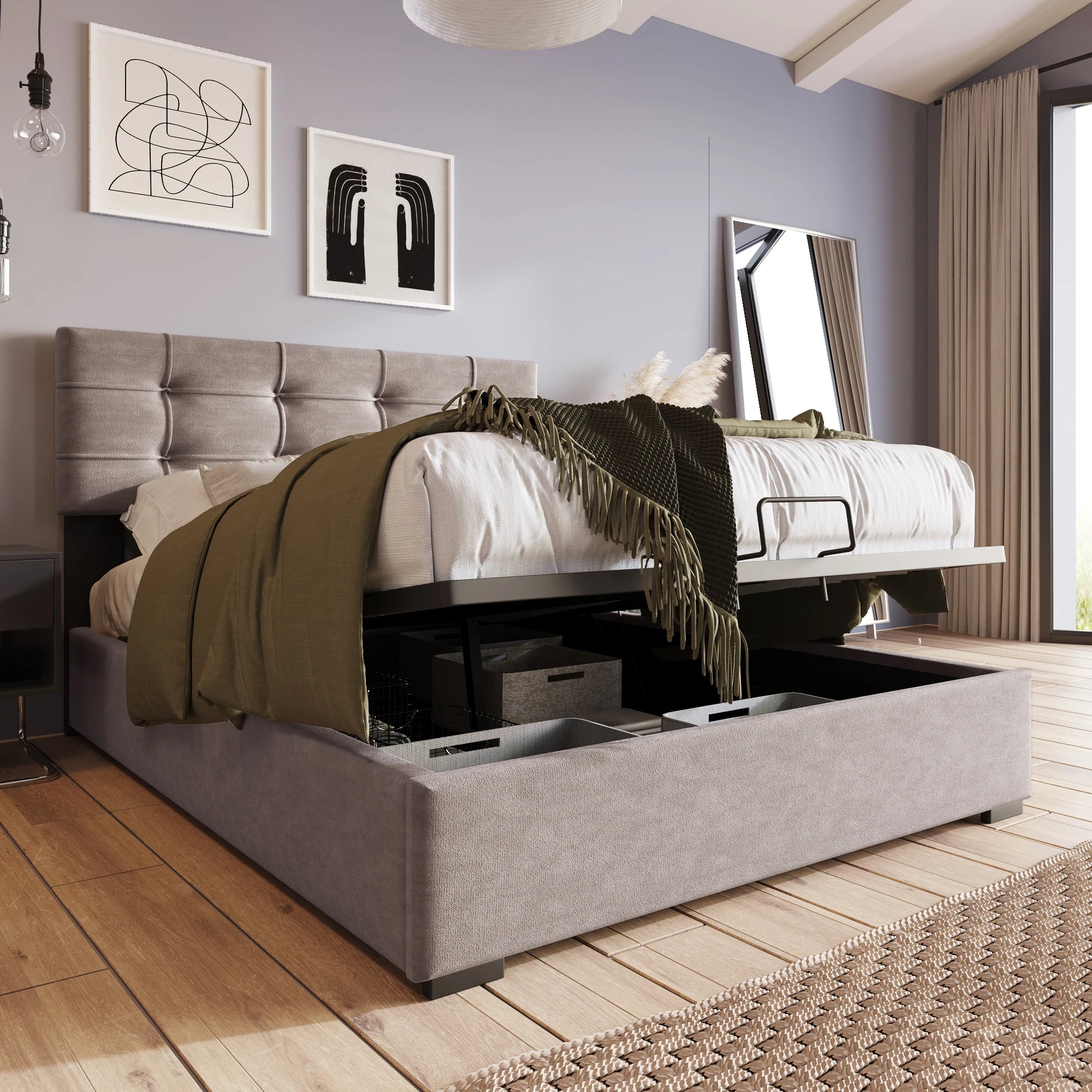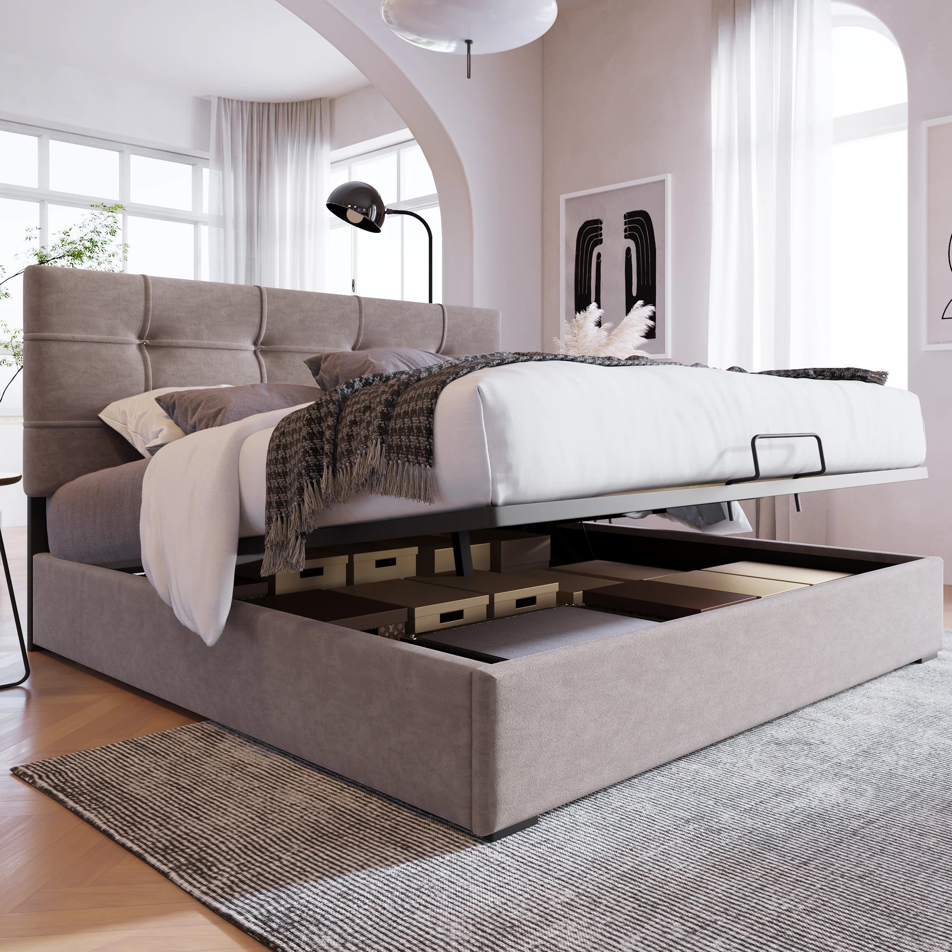 KOMHTOM Hydraulisch Polsterbett Hellgrau - Verstellbares Kopfteil, Metallrahmen-Lattenrost, mit Stauraum, Samtbezug