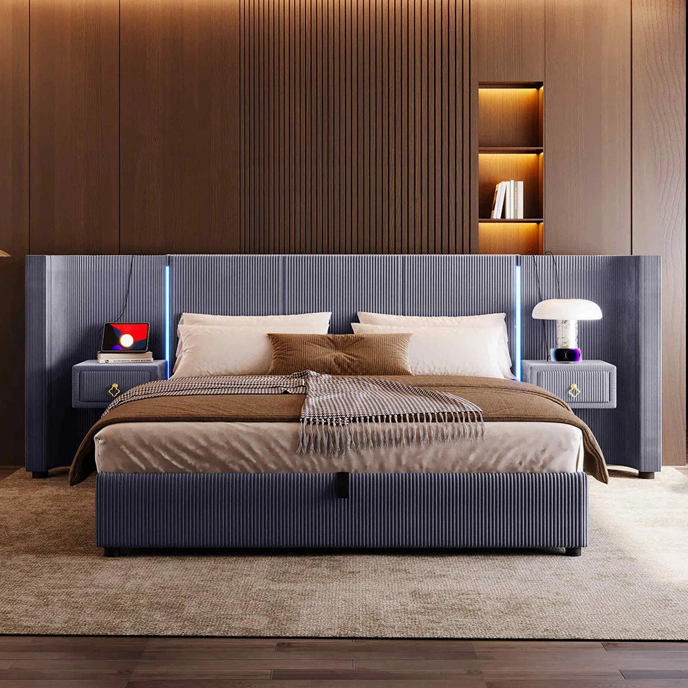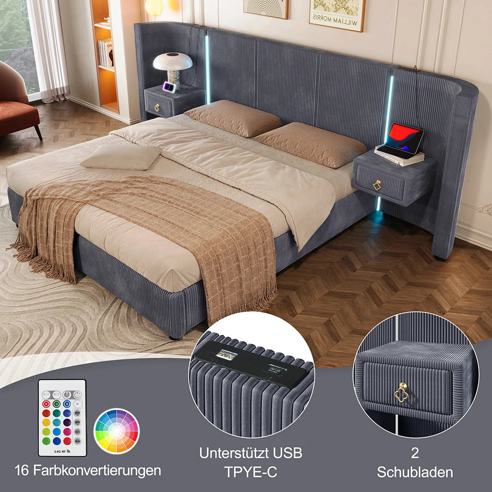 KOMHTOM Polsterbett 180x200cm, Samt mit, LED-Leiste, hydraulischem Stauraum, 2 Schubladen und USB+TYPE-C Anschluss