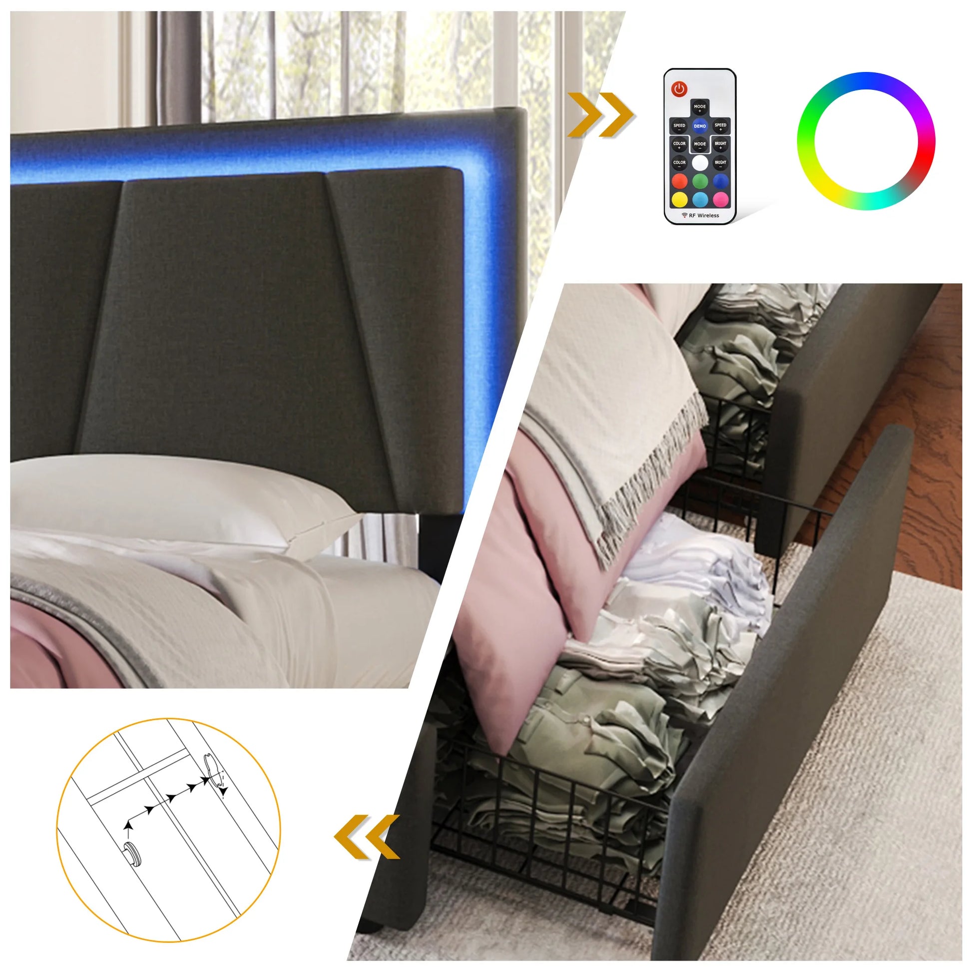 KOMHTOM Polsterbett Einzelbett 90x200 cm, LED-Beleuchtung, 2 Schubladen, höhenverstellbares Kopfteil, ohne Matratze