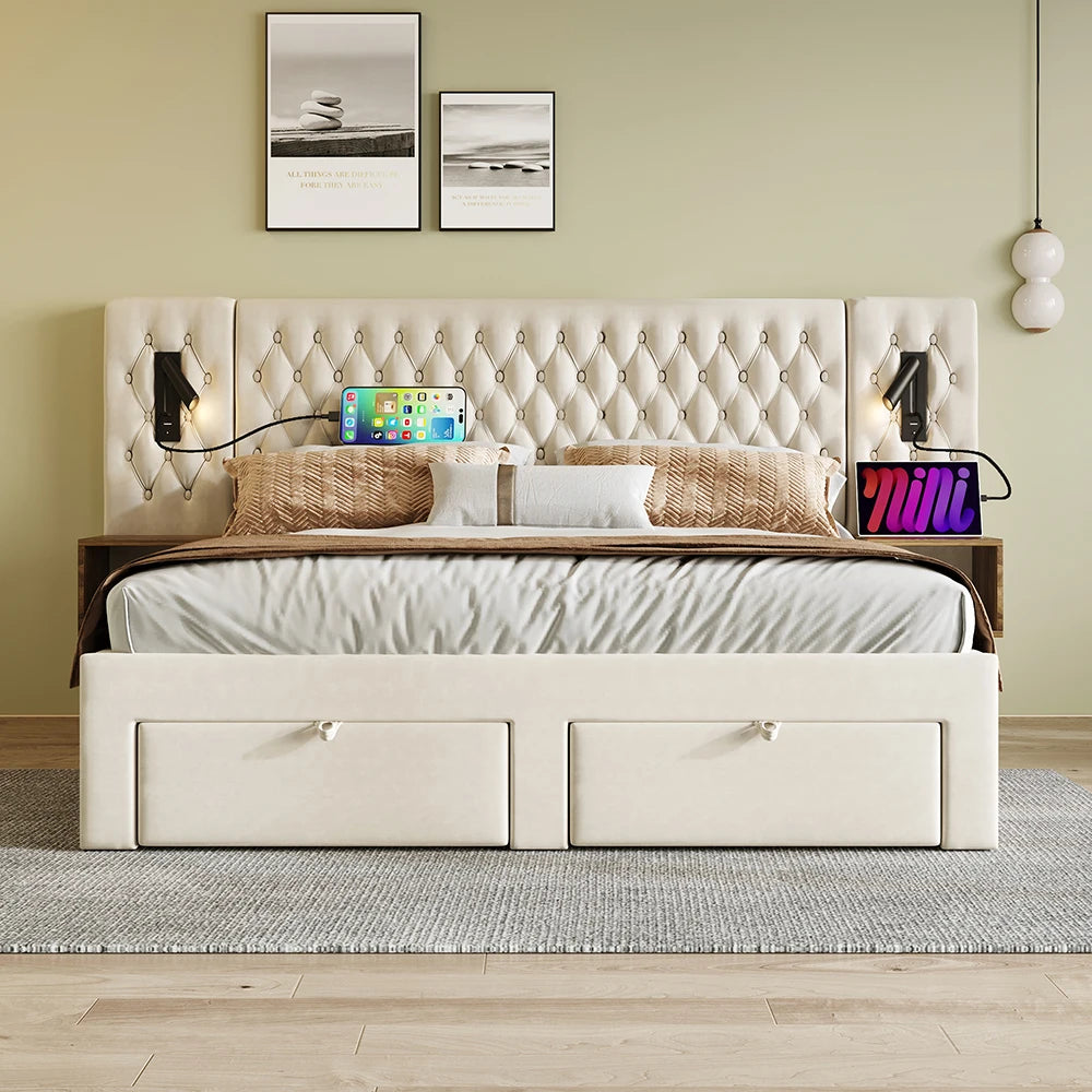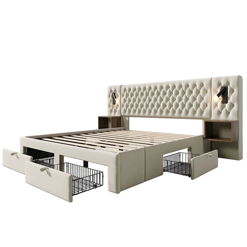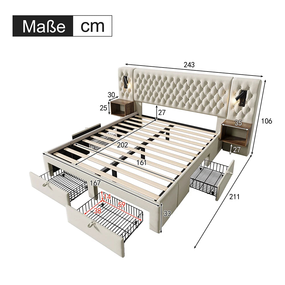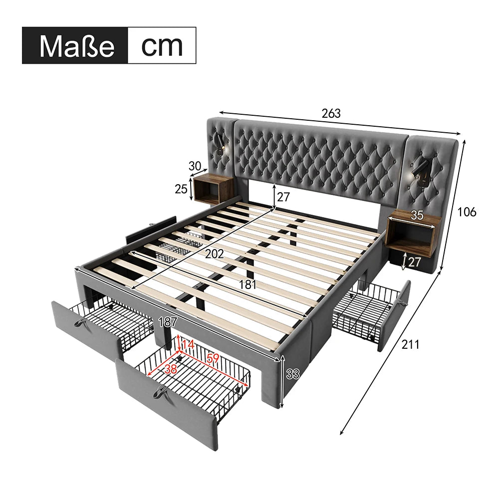 KOMHTOM Polsterbett mit 2 Nachttischen und 4 Schubladen, Kopfteil Leselicht mit USB-Ladefunktion, Samt (Ohne Matratze)