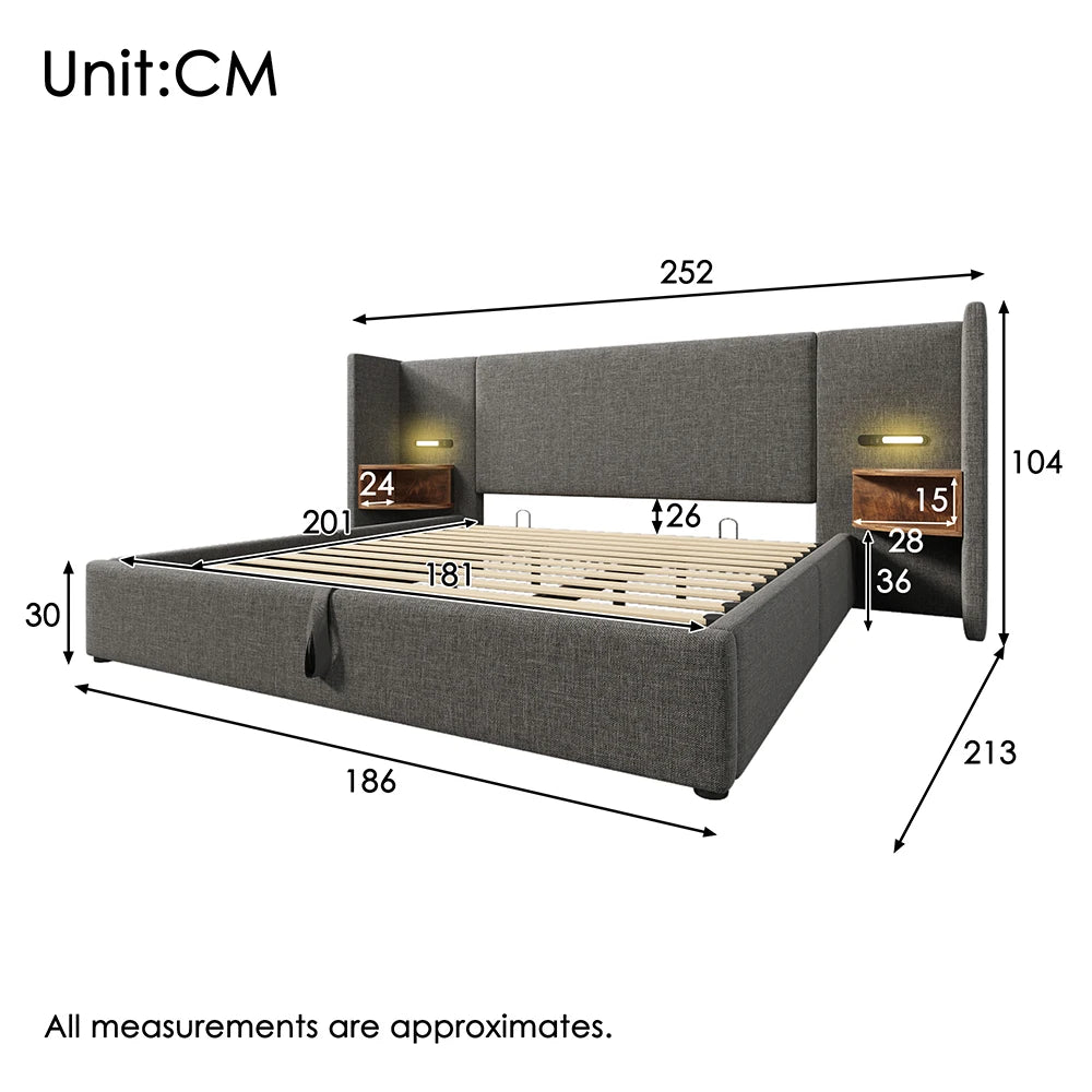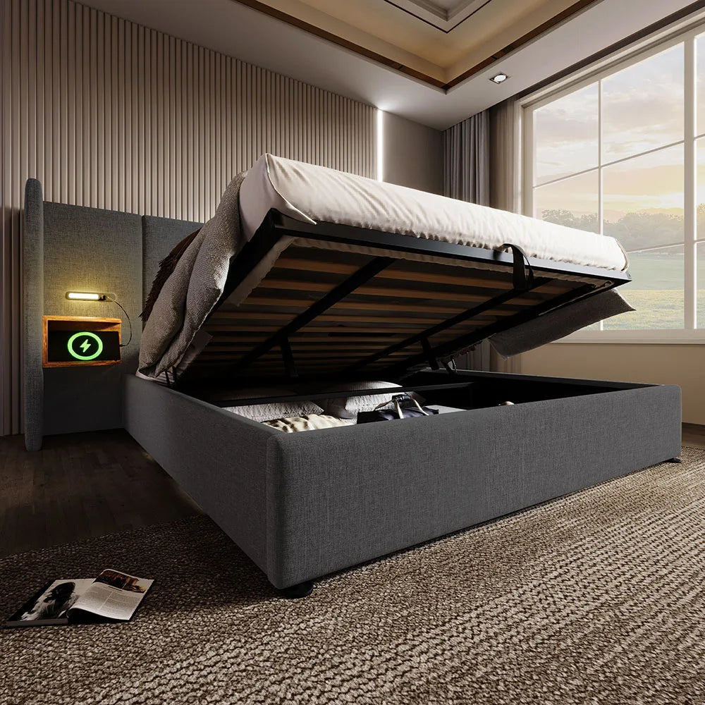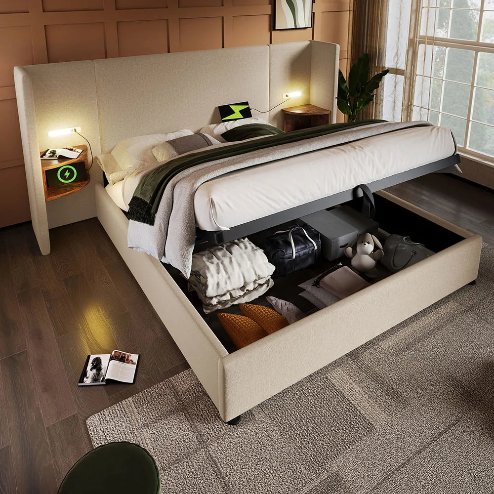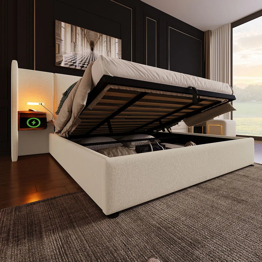 KOMHTOM Polsterbett mit Nachttisch, Leselampe und USB Type-C Ladefunktion, Leinen (Ohne Matratze)