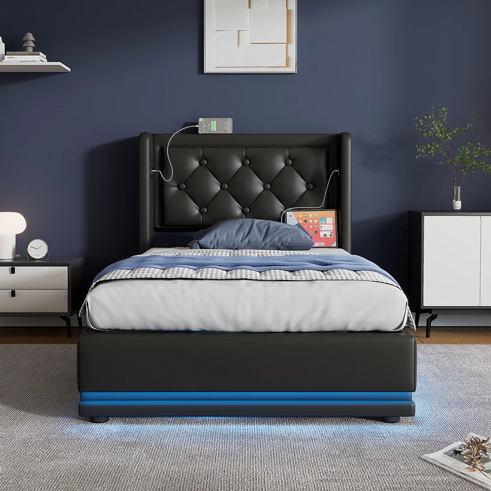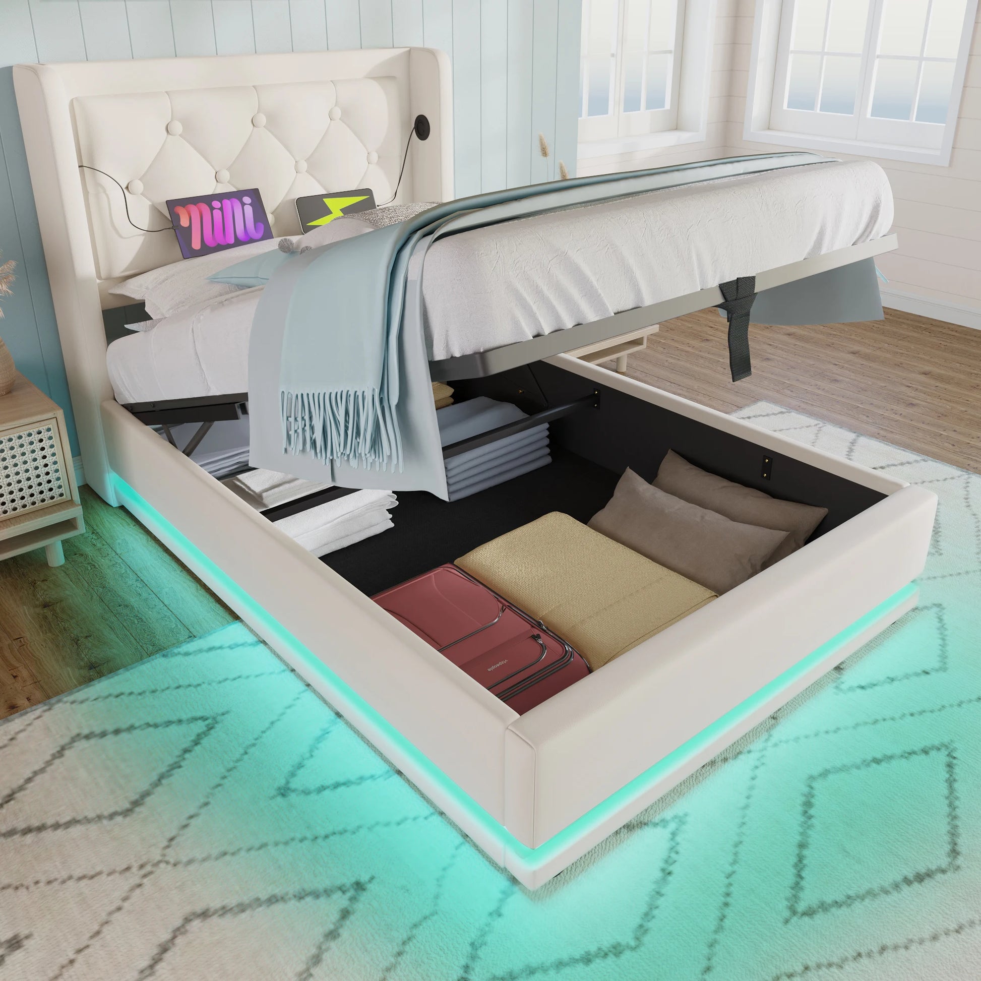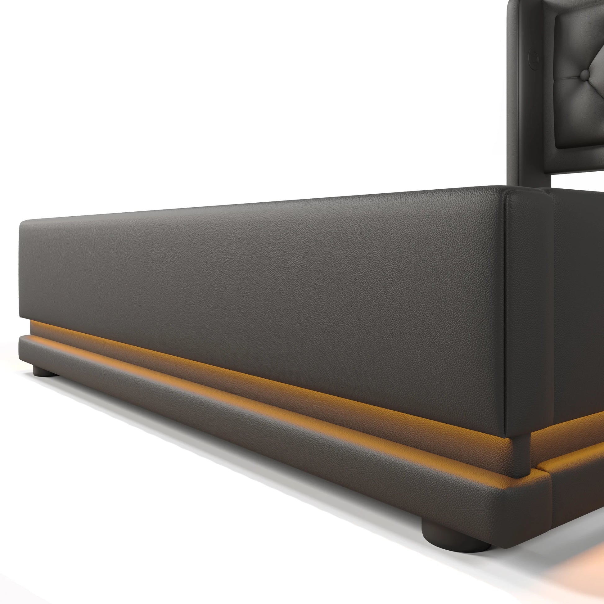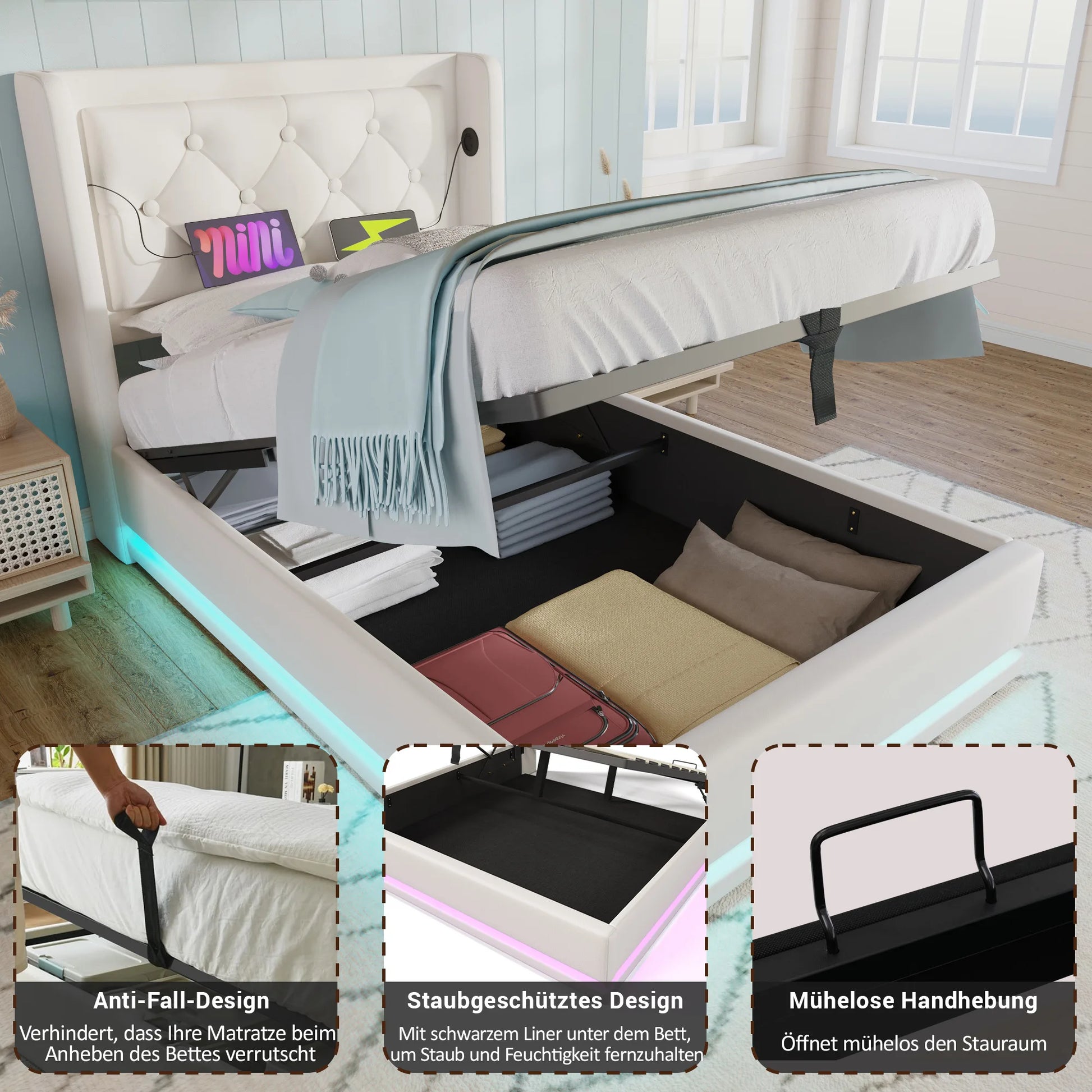 KOMHTOM PU-Material Hydraulisches Stauraumbett, mit USB Typ-C Ladefunktion, 3-seitige LED-Funktion, ohne Matratze