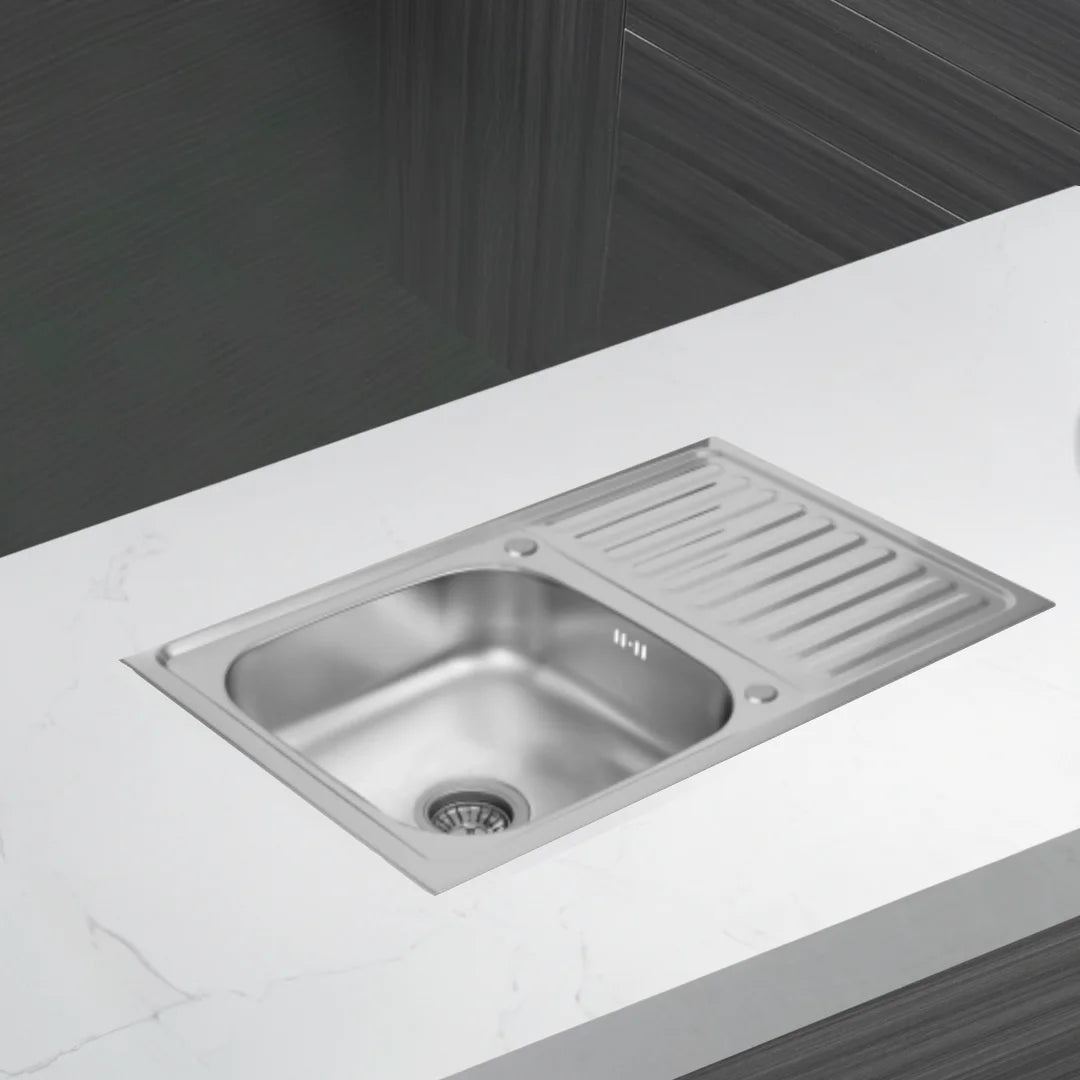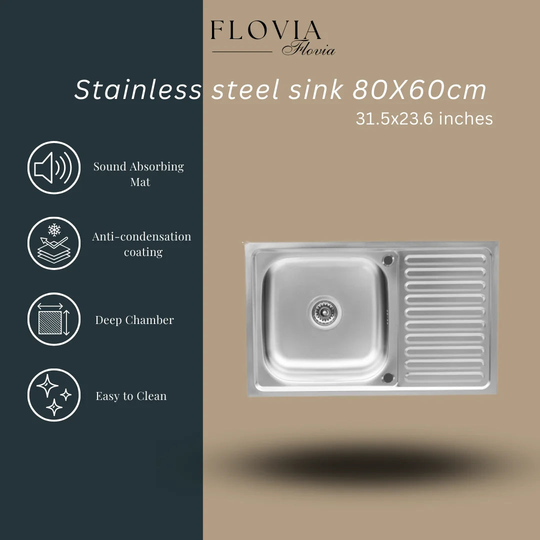 Küchenspüle aus Edelstahl, 80 x 60 cm, mit Abtropffläche, Einzelschüssel, Wasserhahnloch, umschaltbar auf der Oberseite