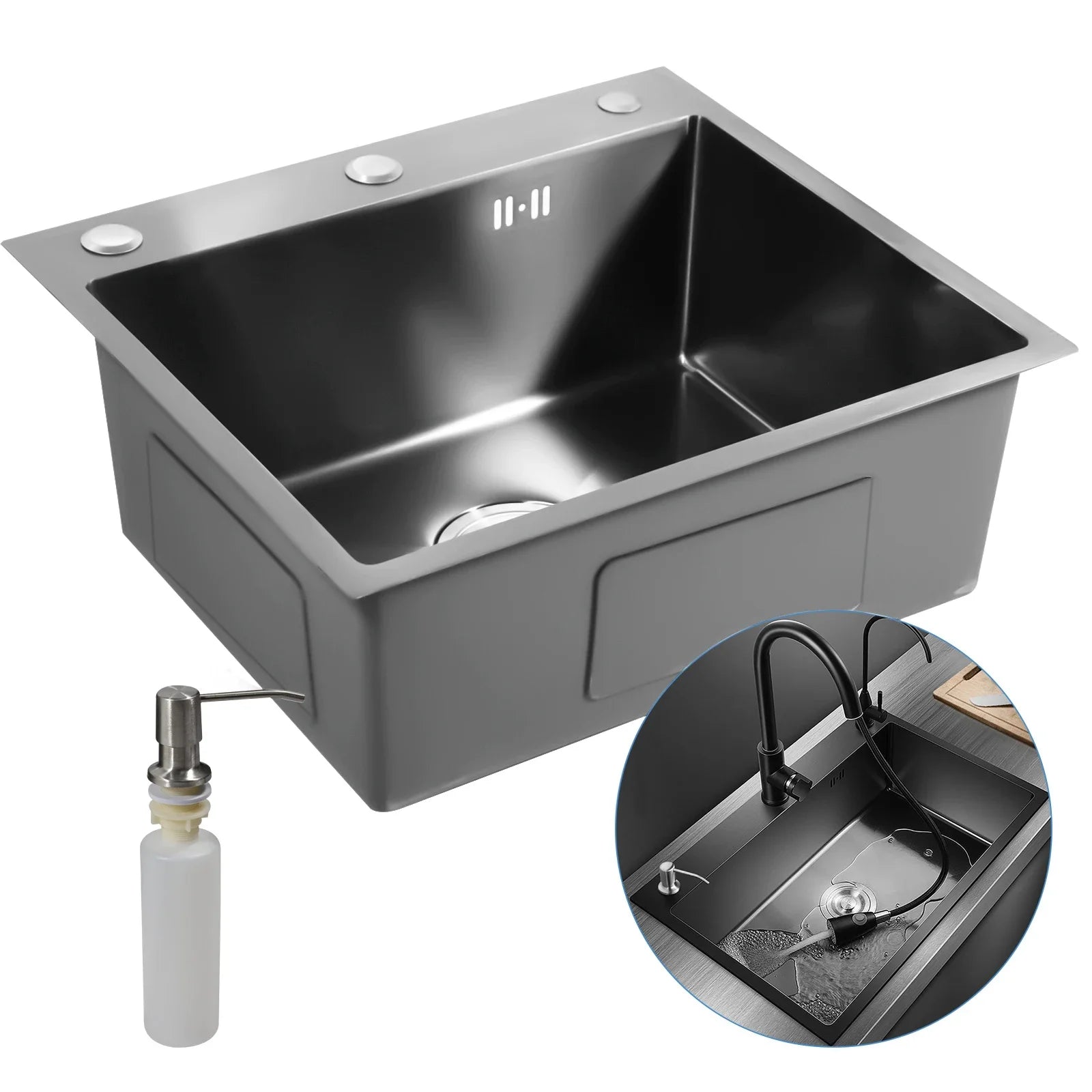 Küchenspüle, rechteckige Spüle aus schwarzem Edelstahl, integriertes Spülbecken mit Küchenseifenspender
