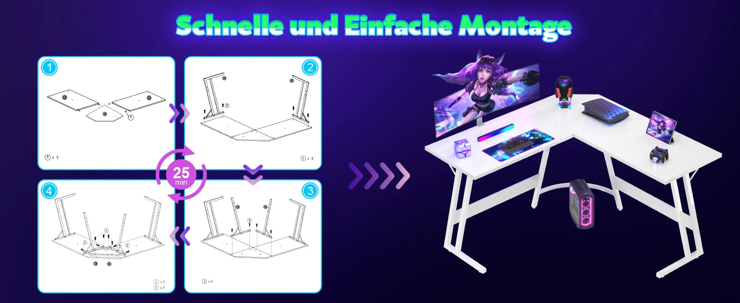 L-Form Gaming-Schreibtisch mit Monitorständer, großer PC-Computertisch für Gamer, Eckschreibtisch, Kohlefase