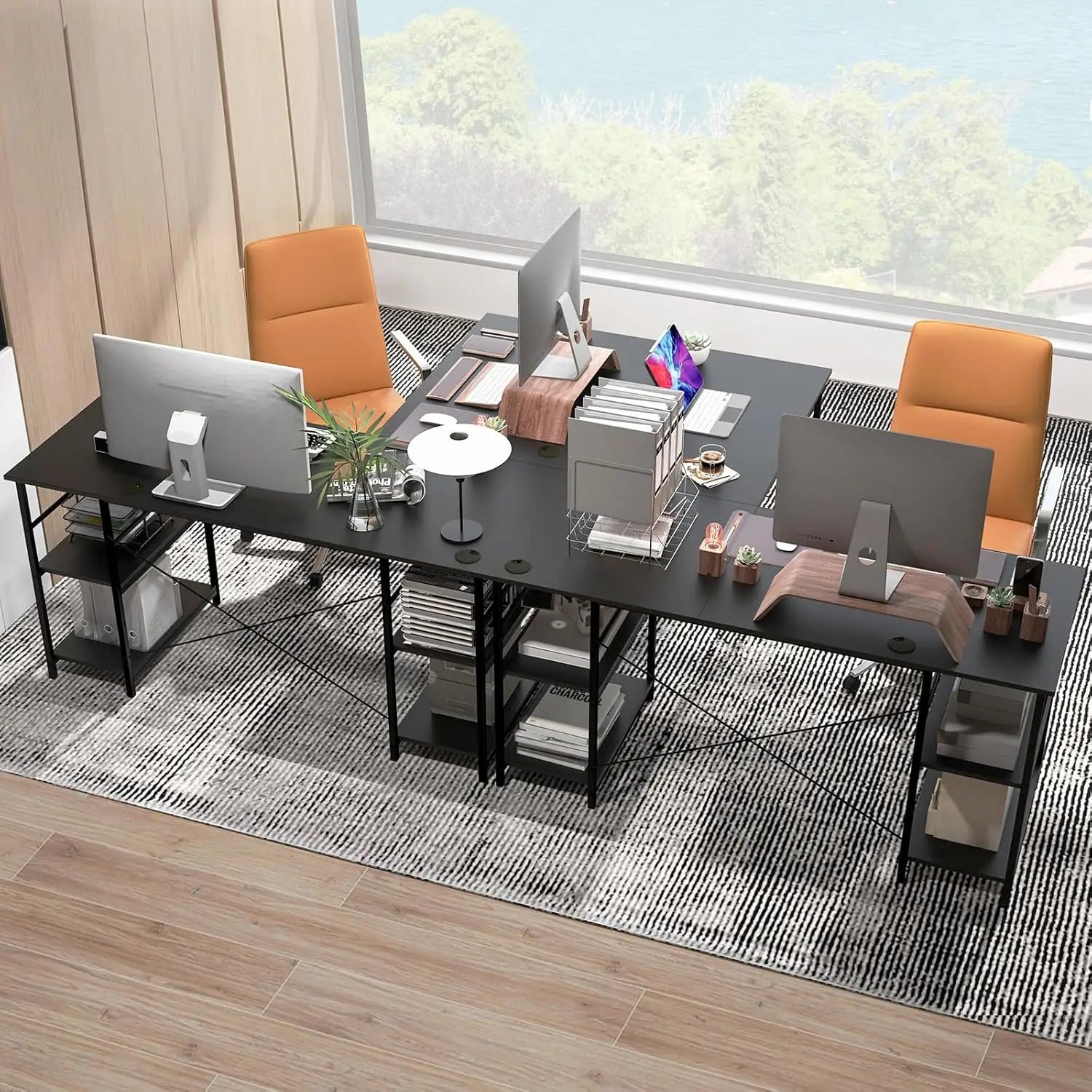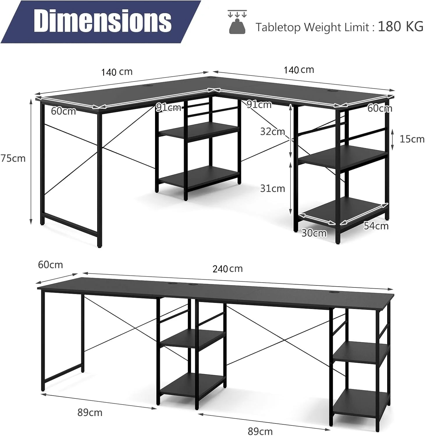 L-förmiger Schreibtisch Computertisch mit Regal, großer Arbeitsplatz, Home Office Gaming Tisch, höhenverstellbar, Schwarz