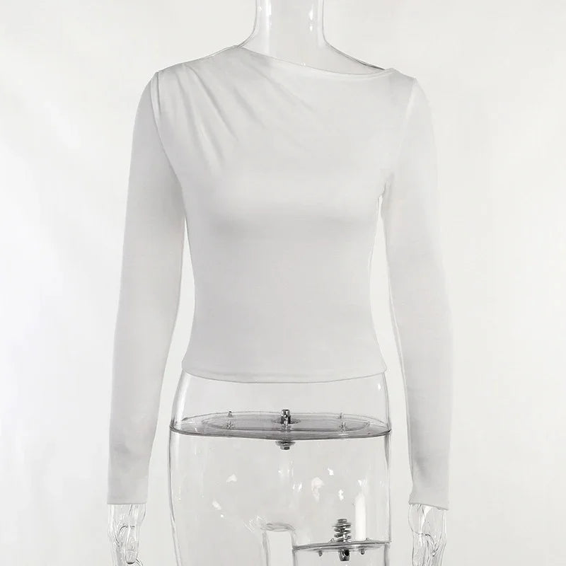 Langarm Top Weiße T-Shirts Frauen Basic Crop Top Herbst Pullover Solide Skew Neck T Shirt Streetwear Basic Schwarz Y2K Tees
