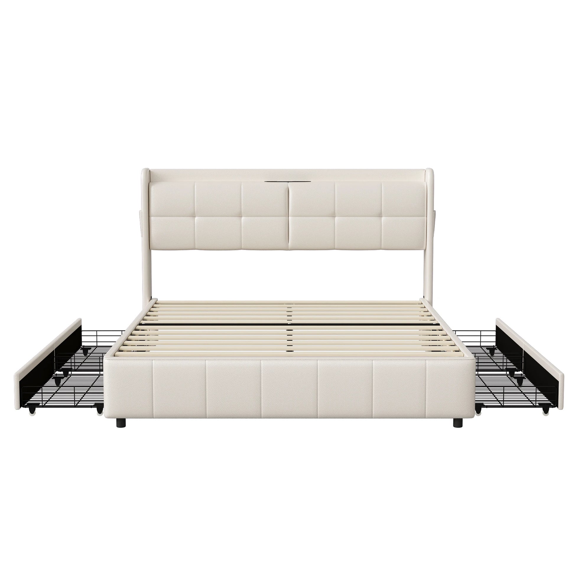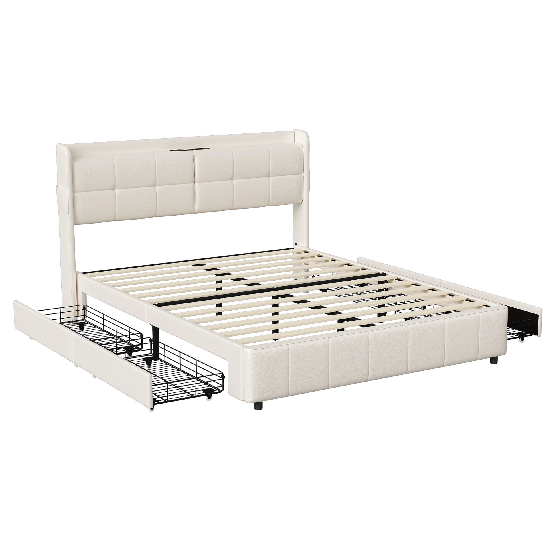 Lazyspace 140 x 200 cm Doppelbett mit 4 Schubladen, weiß gepolstertes Bett, Kopfteil mit Stauraum, USB, PU-Leder, keine Matratze