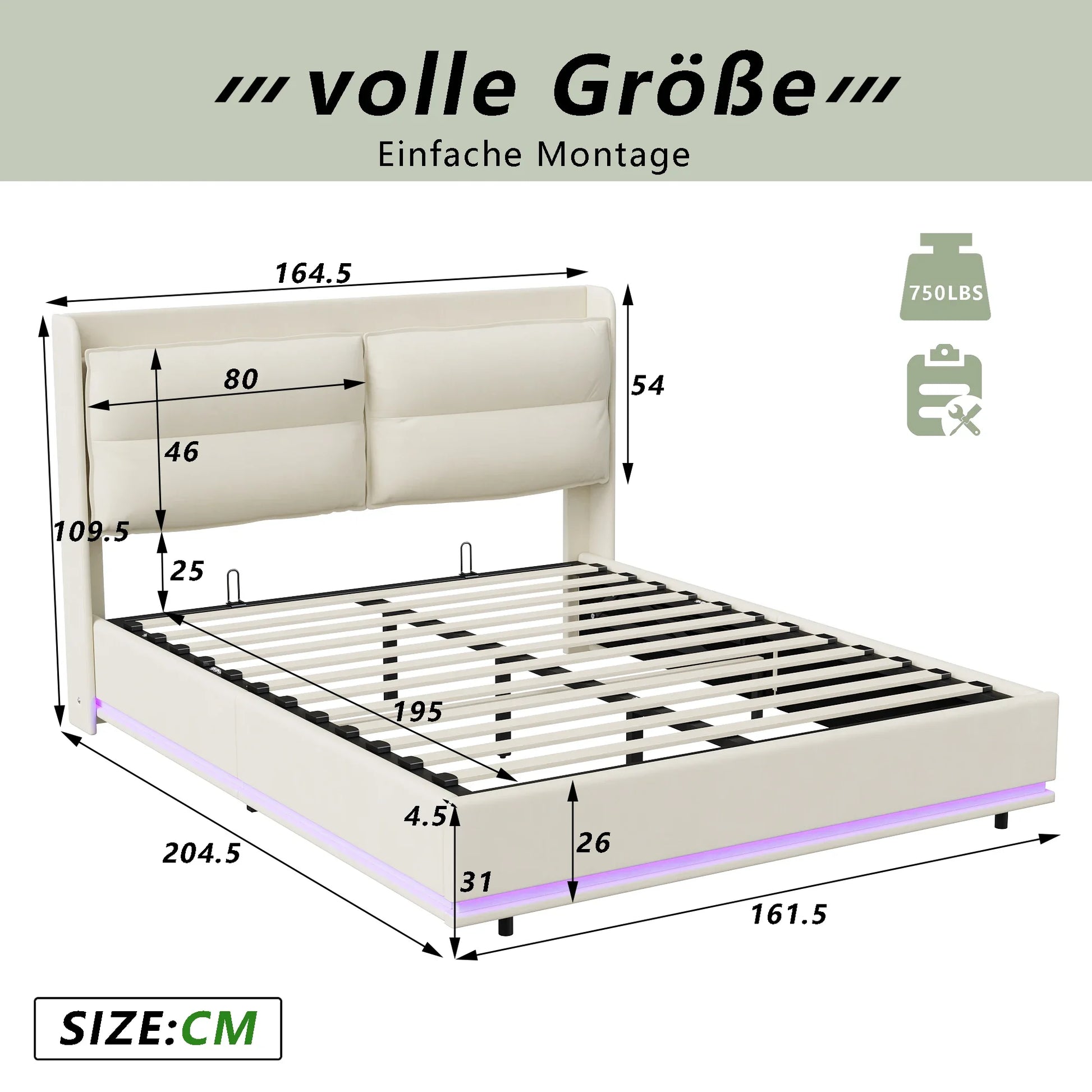 Lazyspace gepolstertes Doppelbett mit LED-Licht, Bettgestell 160 x 200 cm, Druckbett mit Lattenrost aus Holz, ohne Matratze