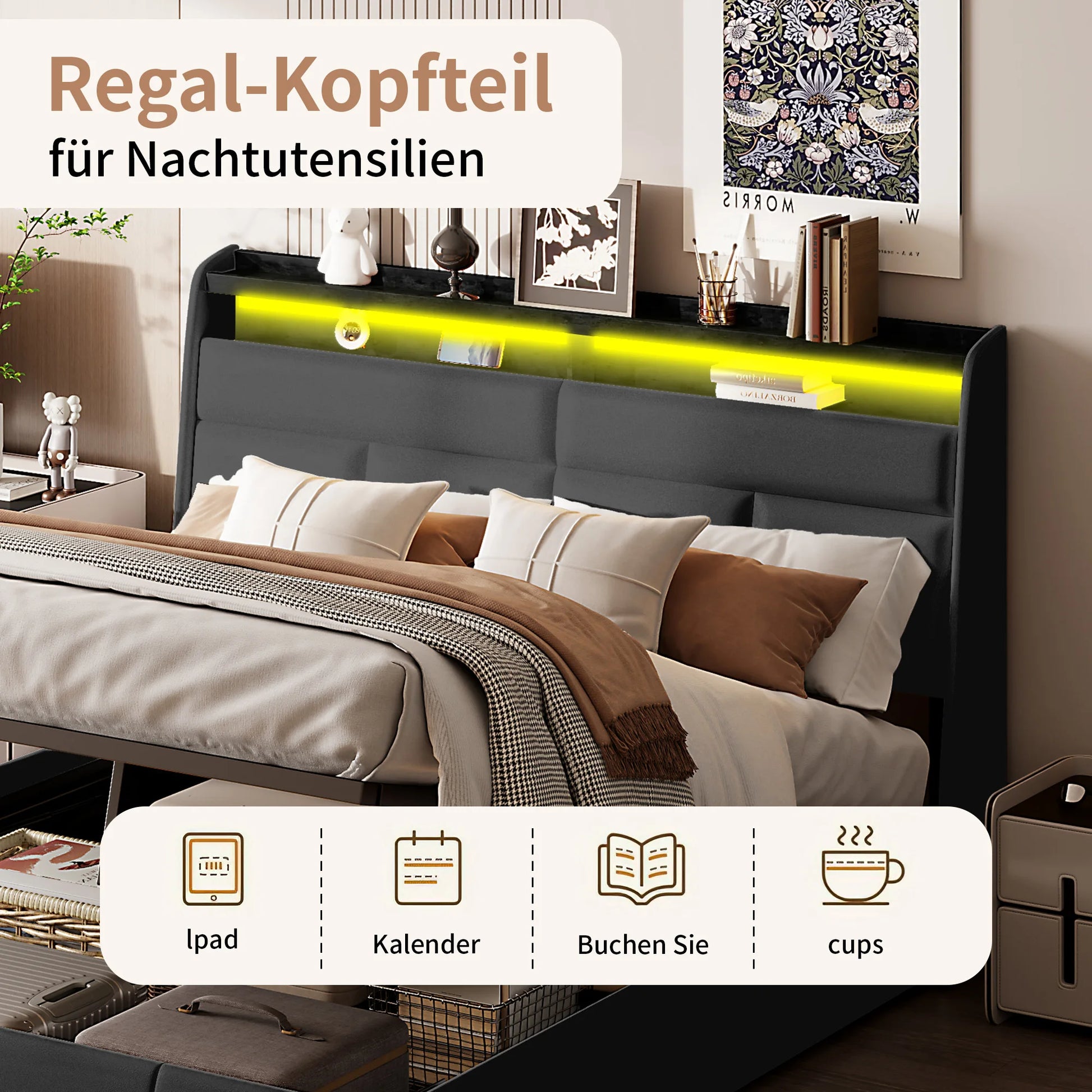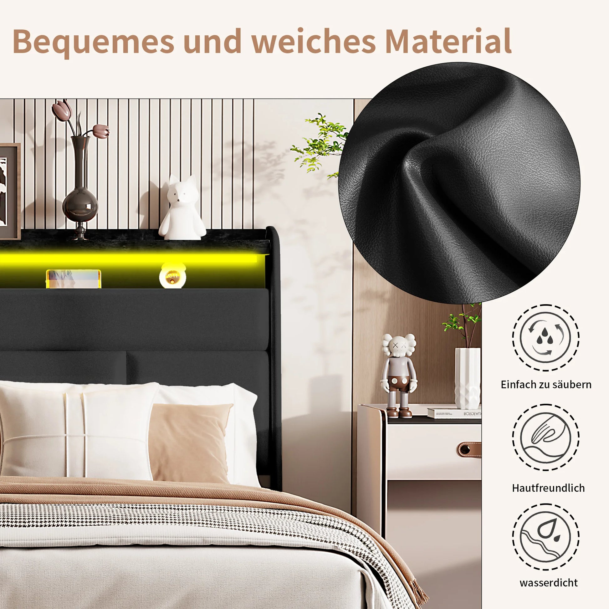 Lazyspace hydraulische Doppelbetten, modernes PU-Bettgestell mit Stauraum, gepolsterte Betten mit LED-Leuchten, Schlafzimmermöbel für Zuhause
