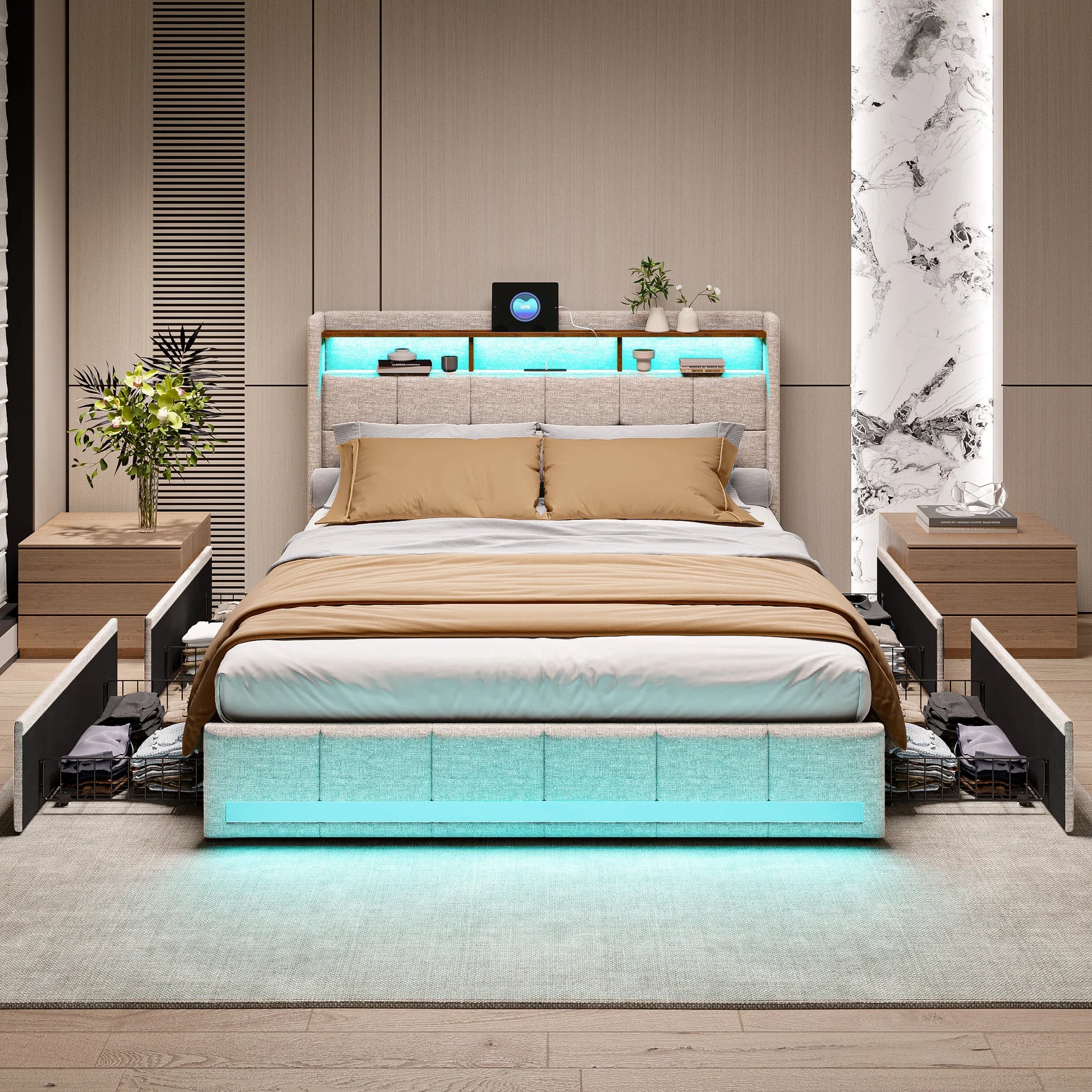 Lazyspace Leinen-Polsterbett, Bettrahmen mit Stauraum, 4 Schubladen, LED-Lichtleiste und USB-Aufladung vom Typ C