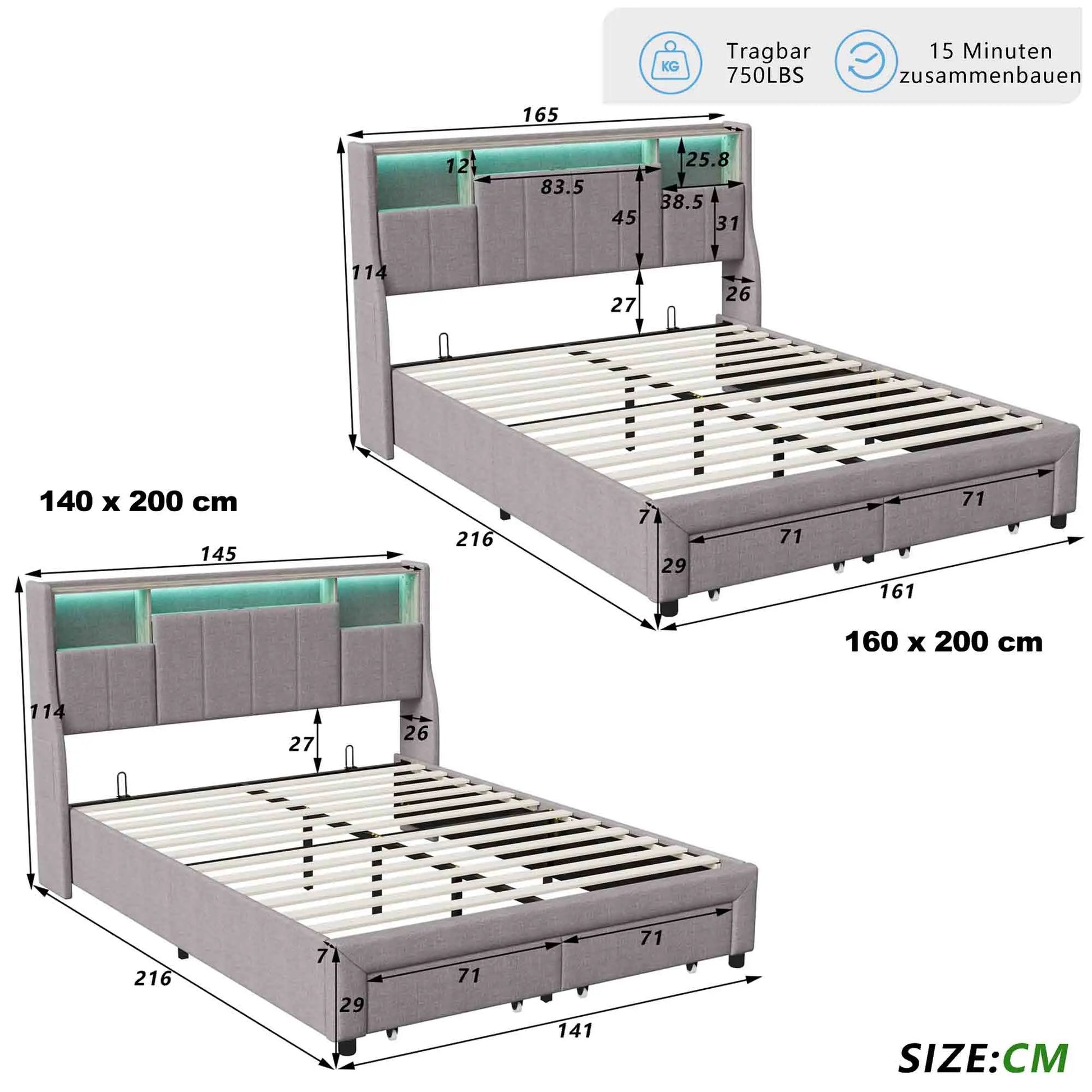 Lazyspace Leinen-Polsterbett, Doppelbettgestell mit Stauraum, Kopfteil und 2 Schubladen, 140/160 x 200 cm, Grau