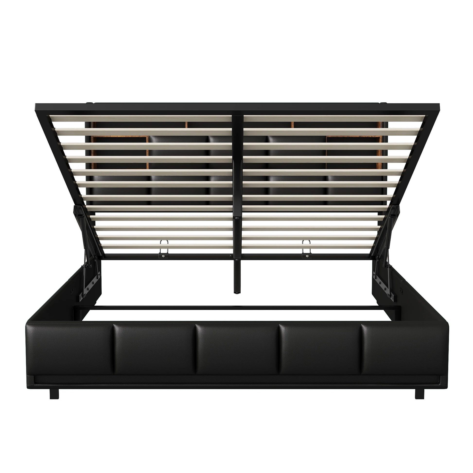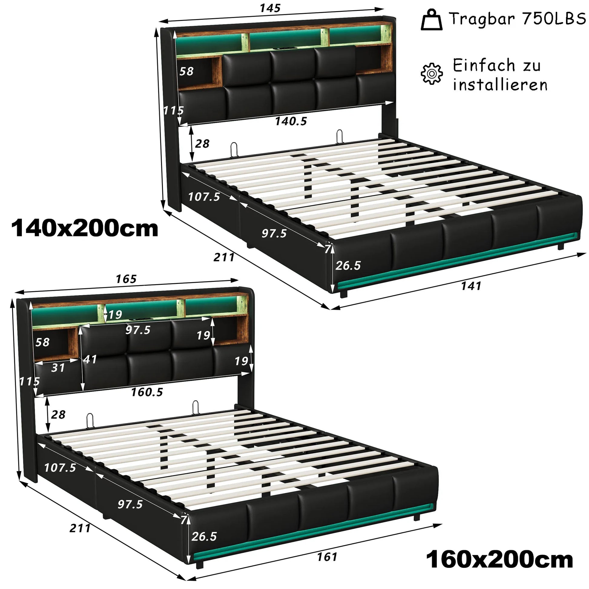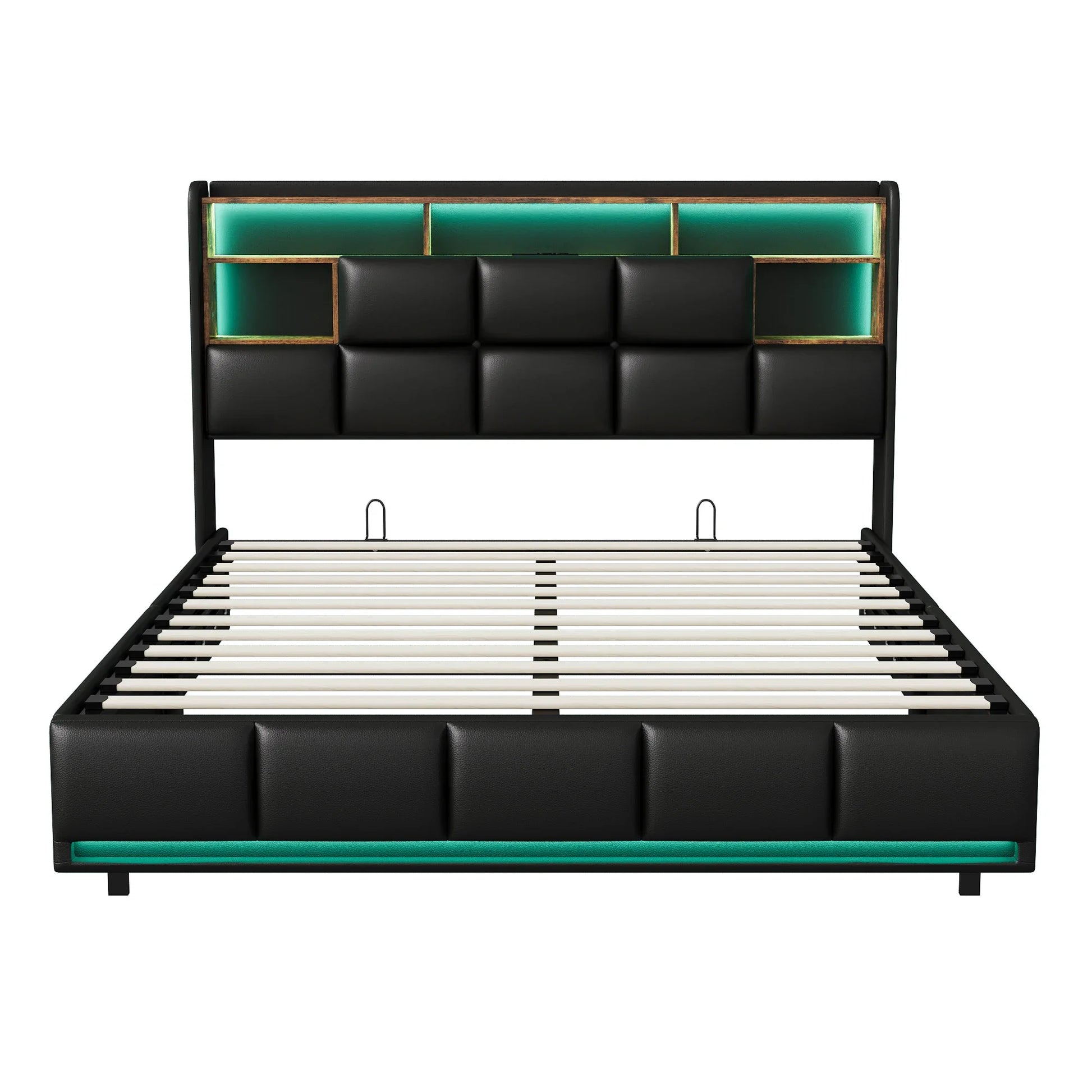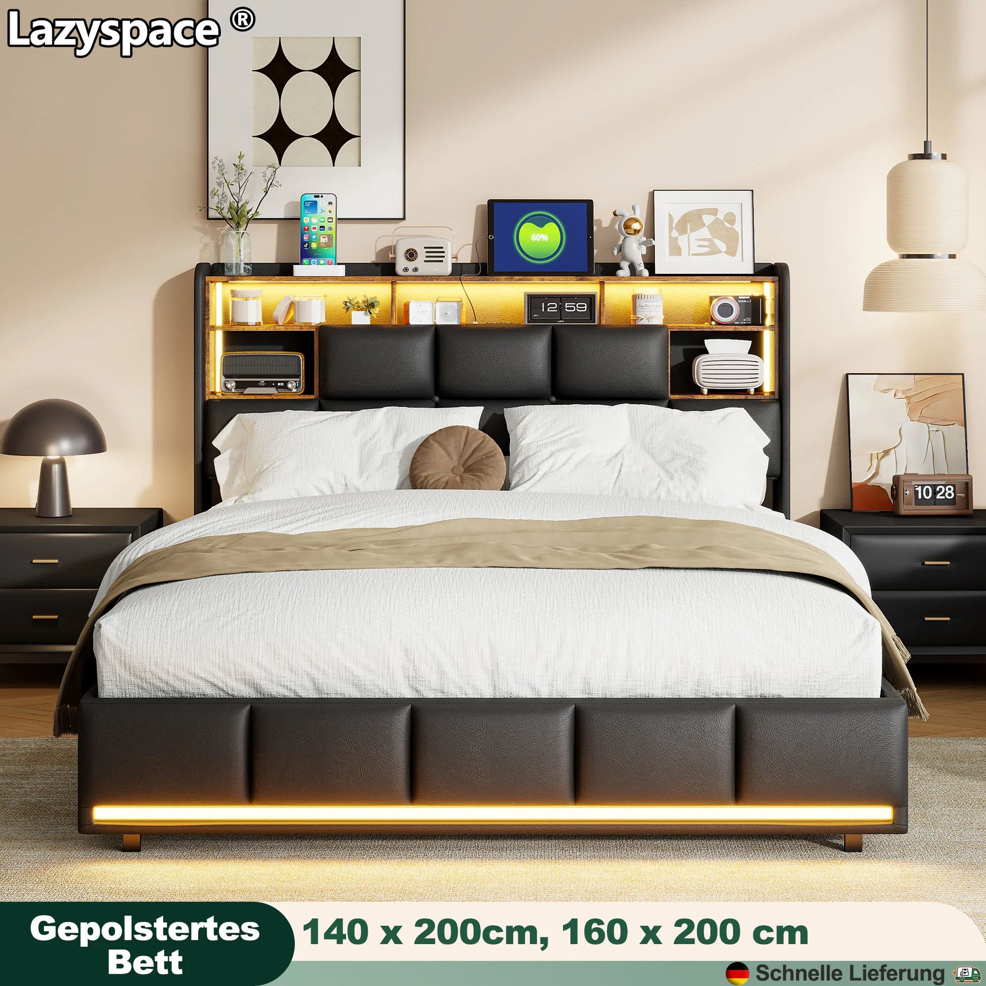 Lazyspace Modernes PU-Polsterbett, Doppelbettgestell, hydraulisches Bett mit Stauraum, Kopfteil mit LED-Licht und Ablagefach