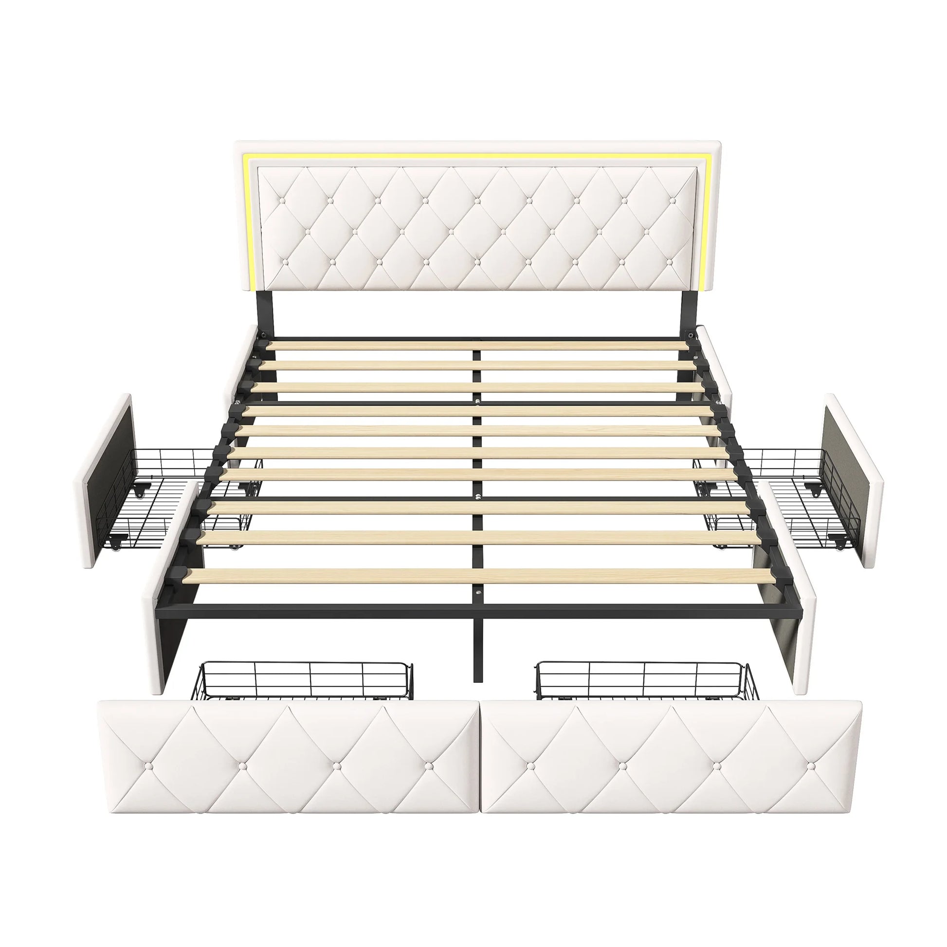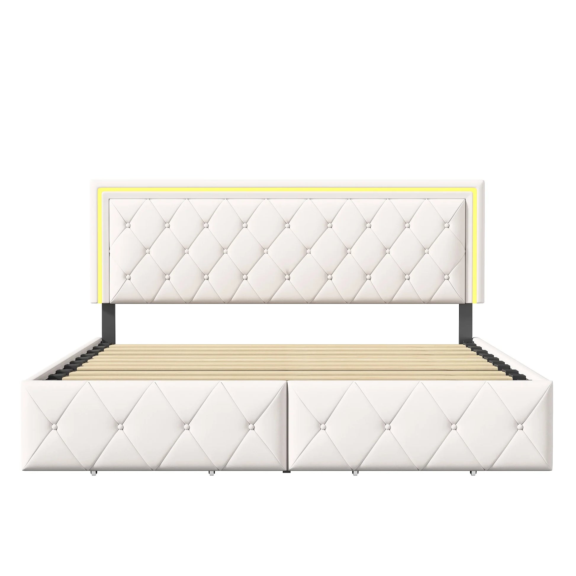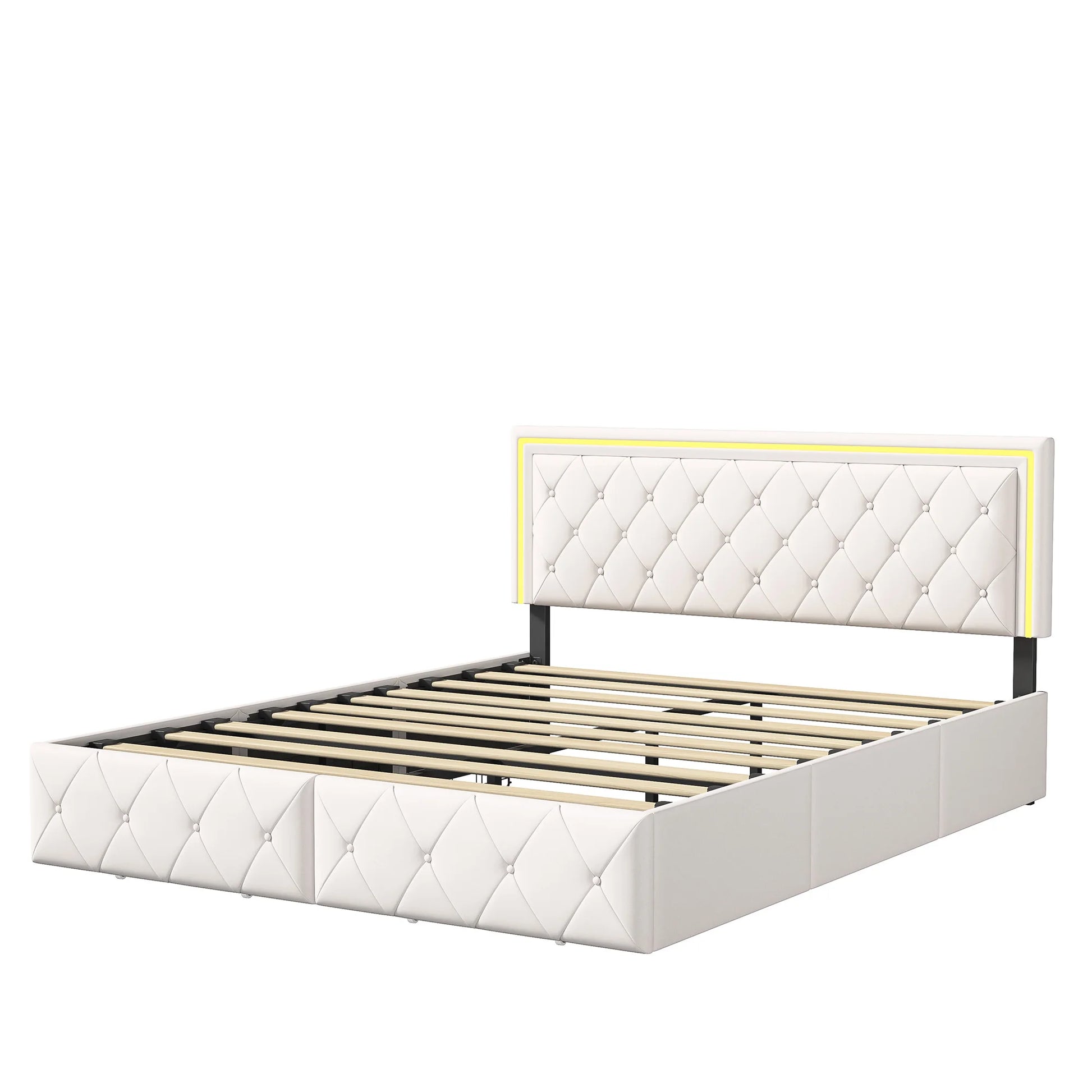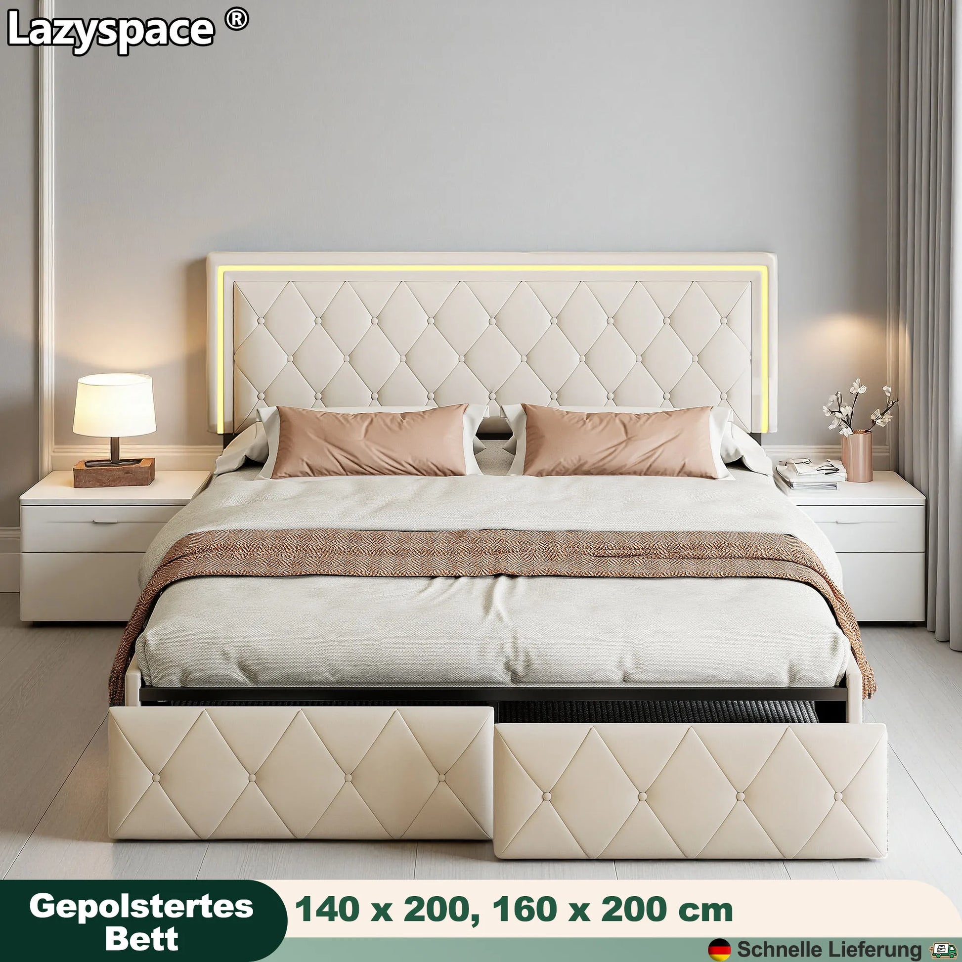 Lazyspace PU-Polsterbett, weißes Einzel- und Doppelbett mit Lattenrost, Holz, mit 4 Schubladen und LED-Kopfteil