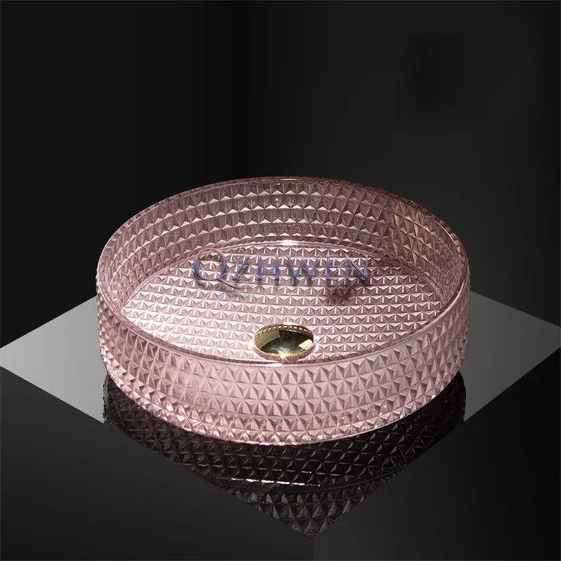 Luxuriöses Waschbecken aus Kristallglas, Badezimmer-Waschbecken, rosa Arbeitsplatte, Kunstbecken, rundes Mini-Schüsselbecken, Waschraum-Waschbecken mit Wasserhähnen