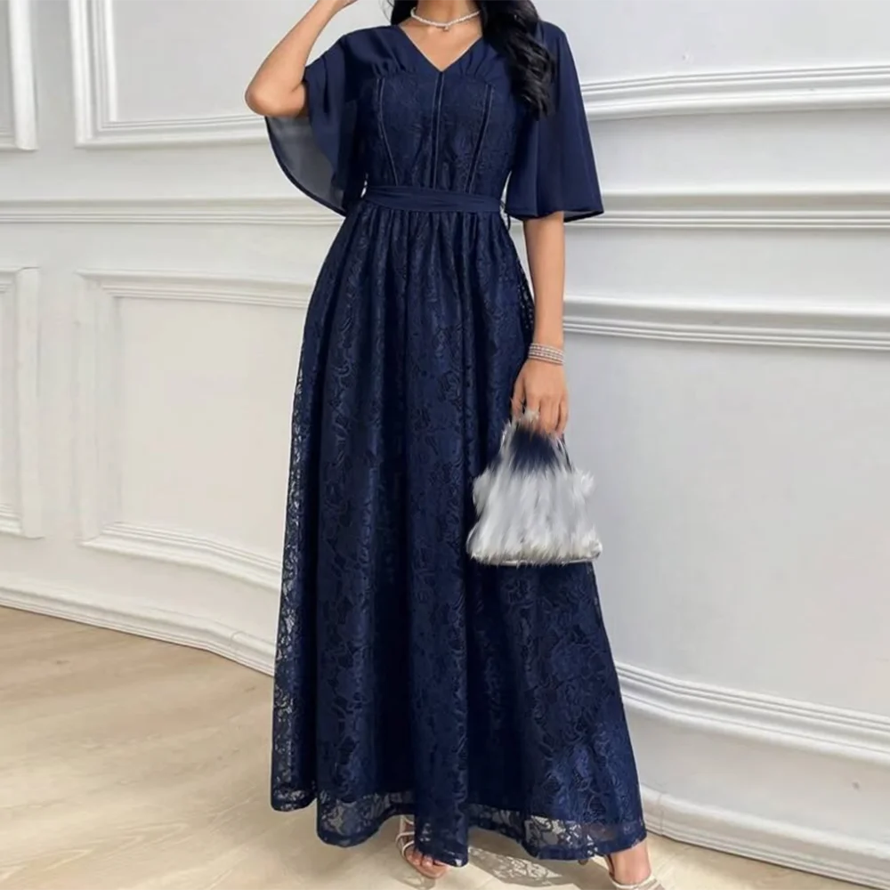 Maßgeschneiderte A-Linie-Abschlussballkleider, knöchellang, V-Ausschnitt, halbe Ärmel, Abendkleid, schlichtes, modisches, mit Spitze drapiertes, rückenfreies Partykleid