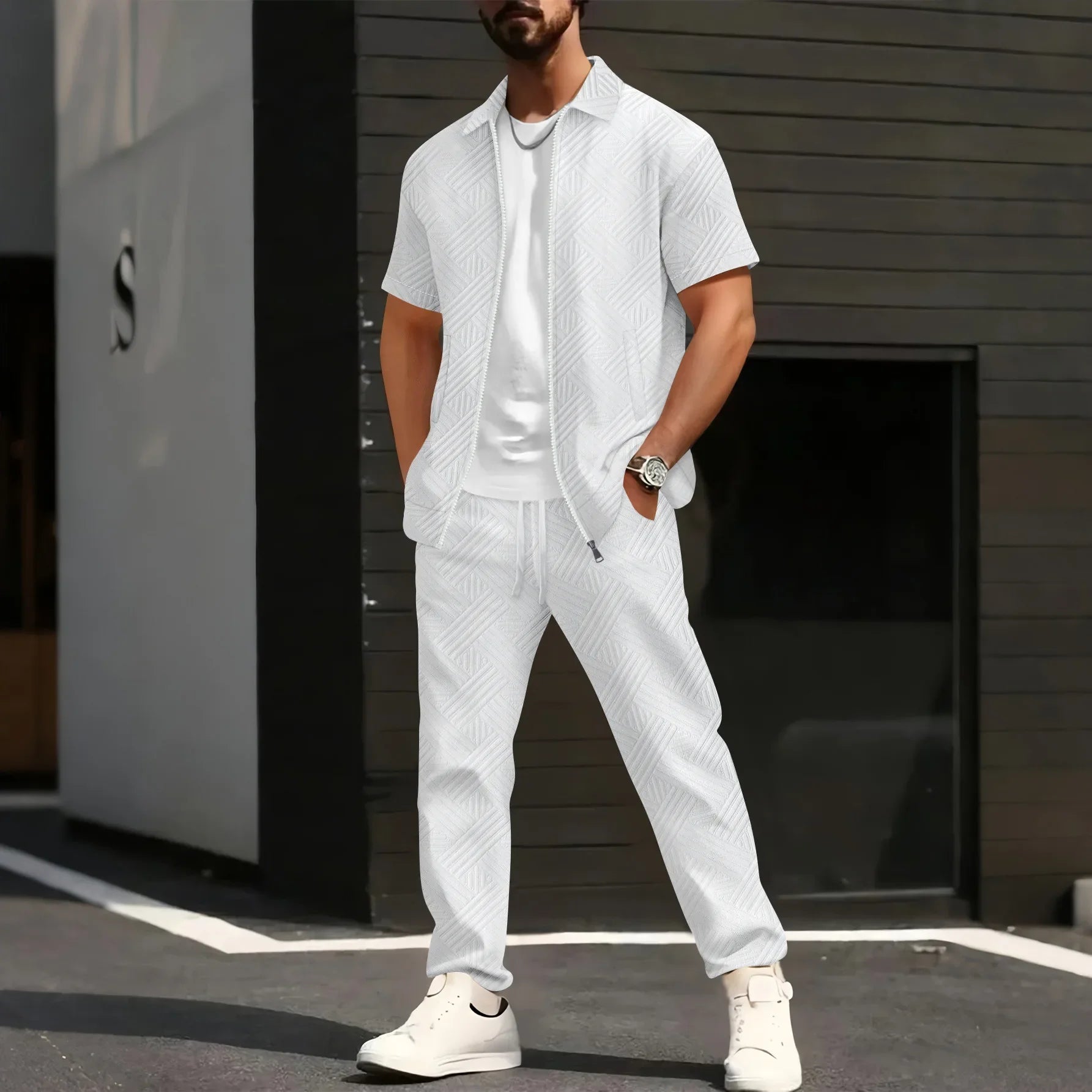 Men's Summer New Style Solid Color Knitted Short Sleeve Cardigan with Long Pants Casual Set Sporty Look from Mainland China