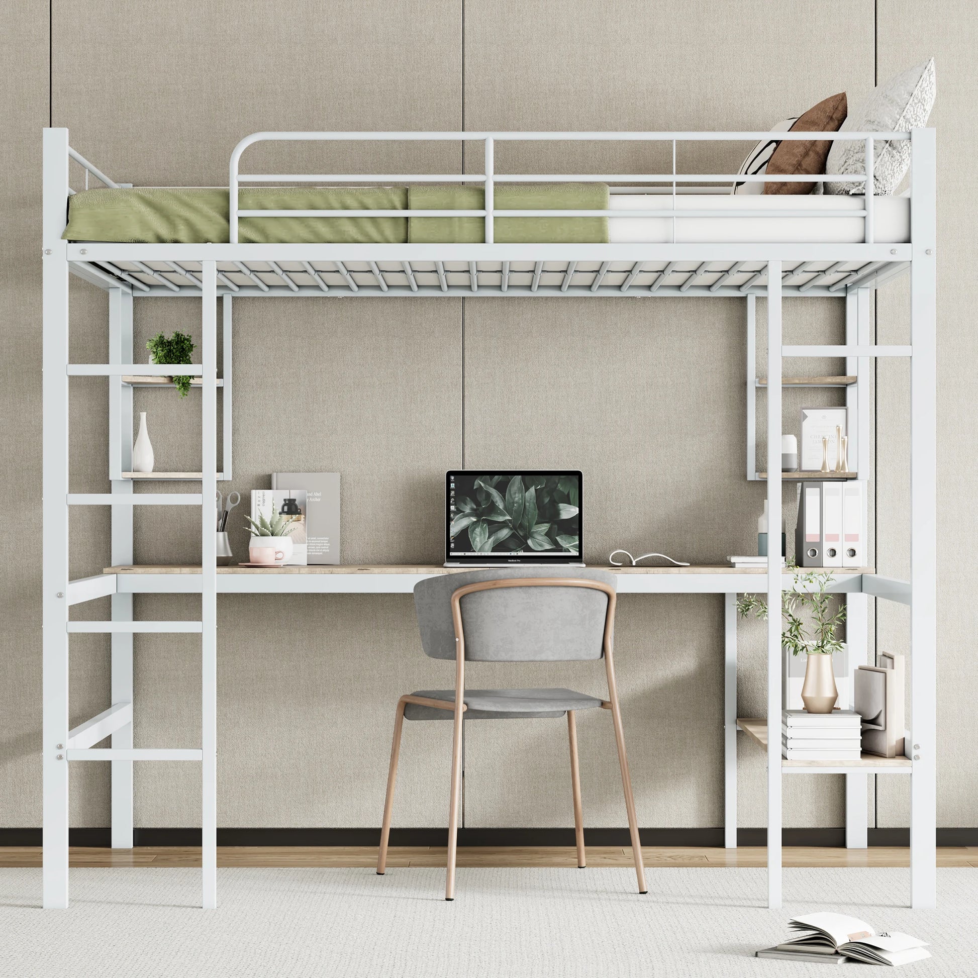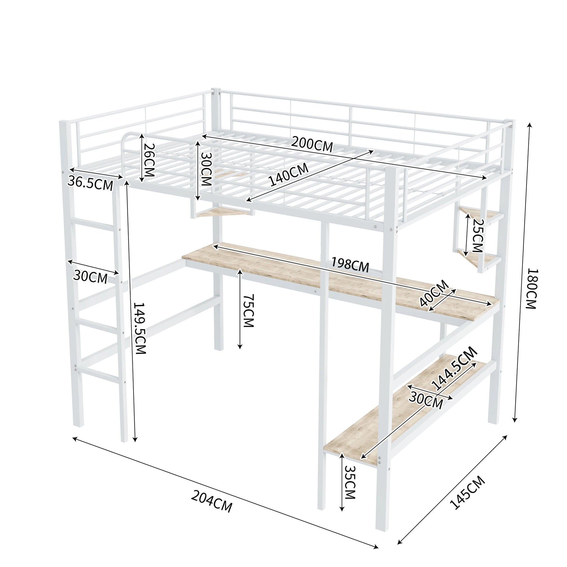 Merax Hochbett 140x200 cm Metallbett mit Schreibtisch und Regal für Kinder Jugendliche und Erwachsene Weiß