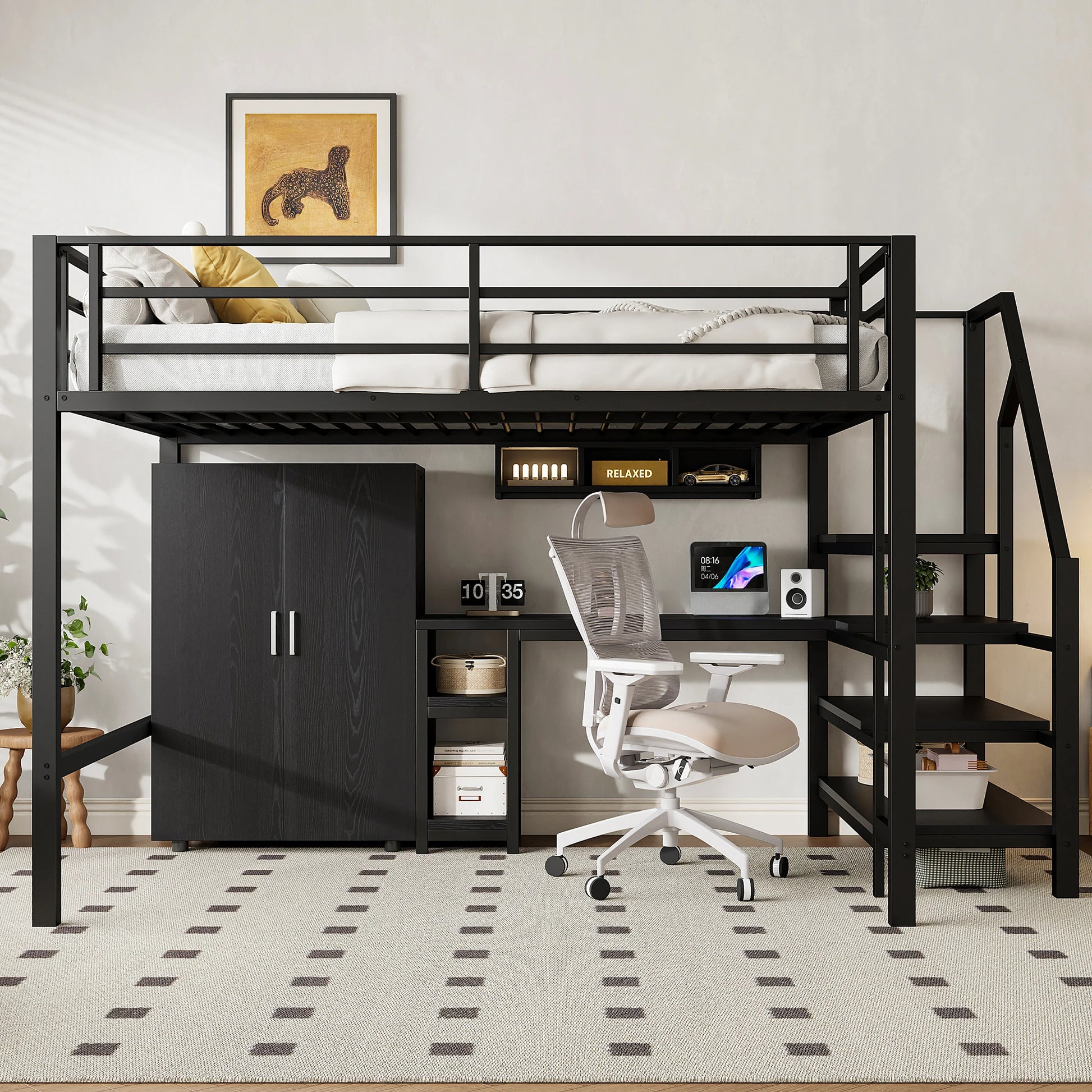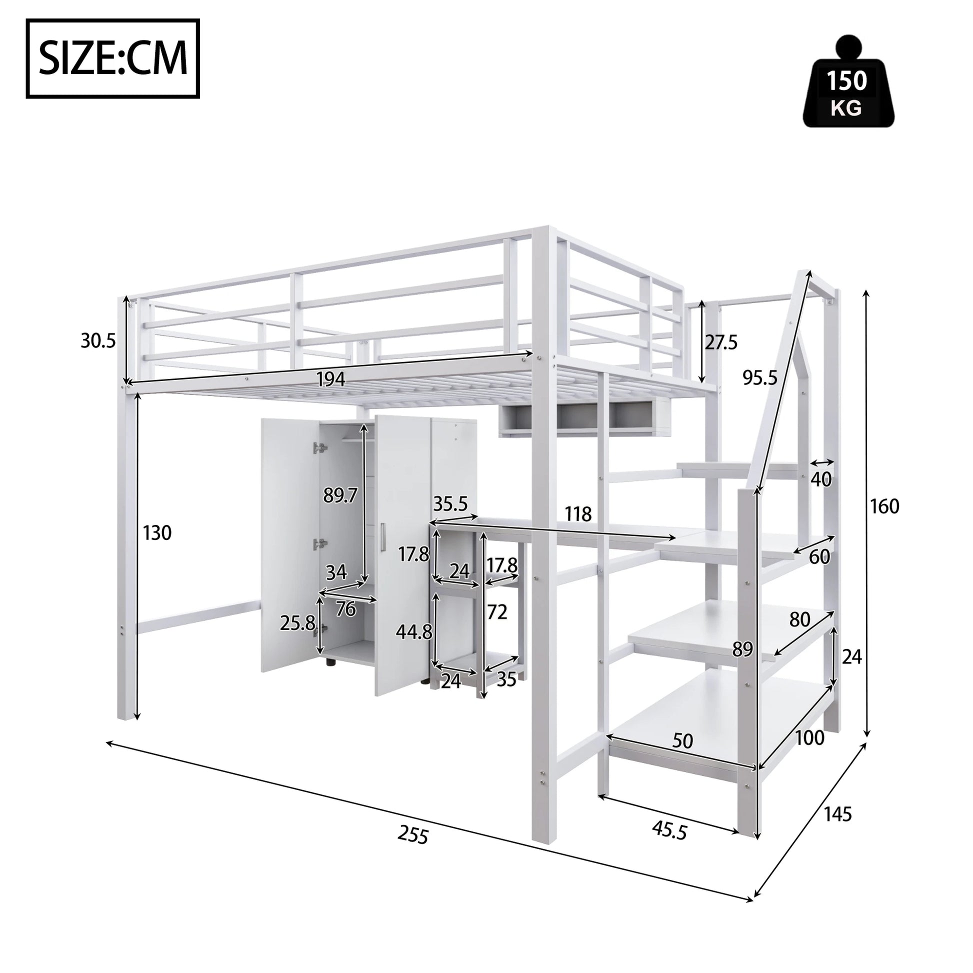 Merax Hochbett 140x200 cm mit Kleiderschrank Regalen Ablageleiter und Schreibtisch Weiß