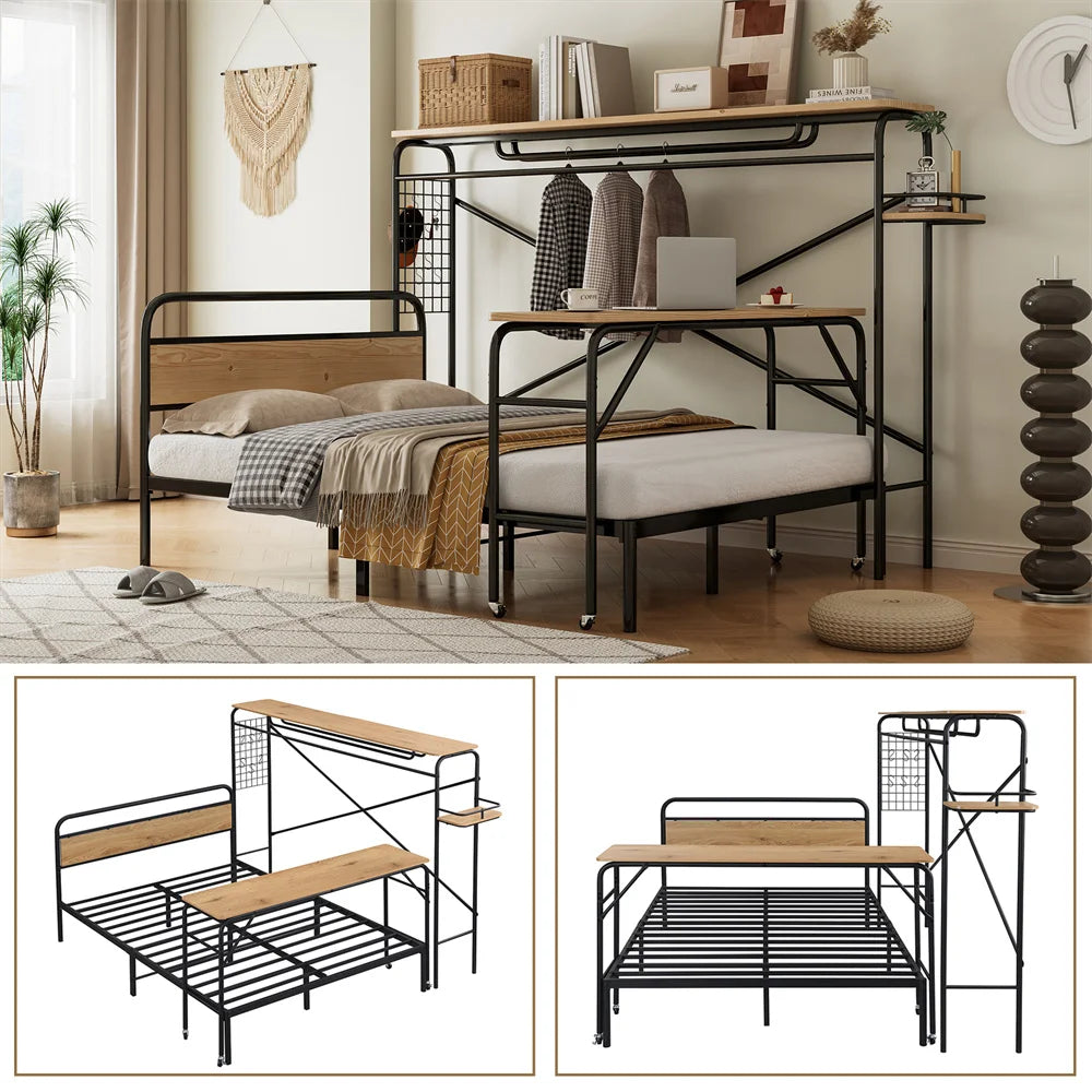 Metallbett 140x200cm, Flachbetten+Tisch mit Rädern+Vertikaler Garderobenständer, Schlafzimmermöbel, Metall+MDF, Schwarz + Natur