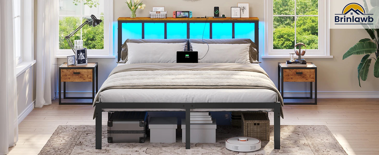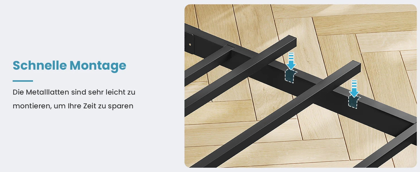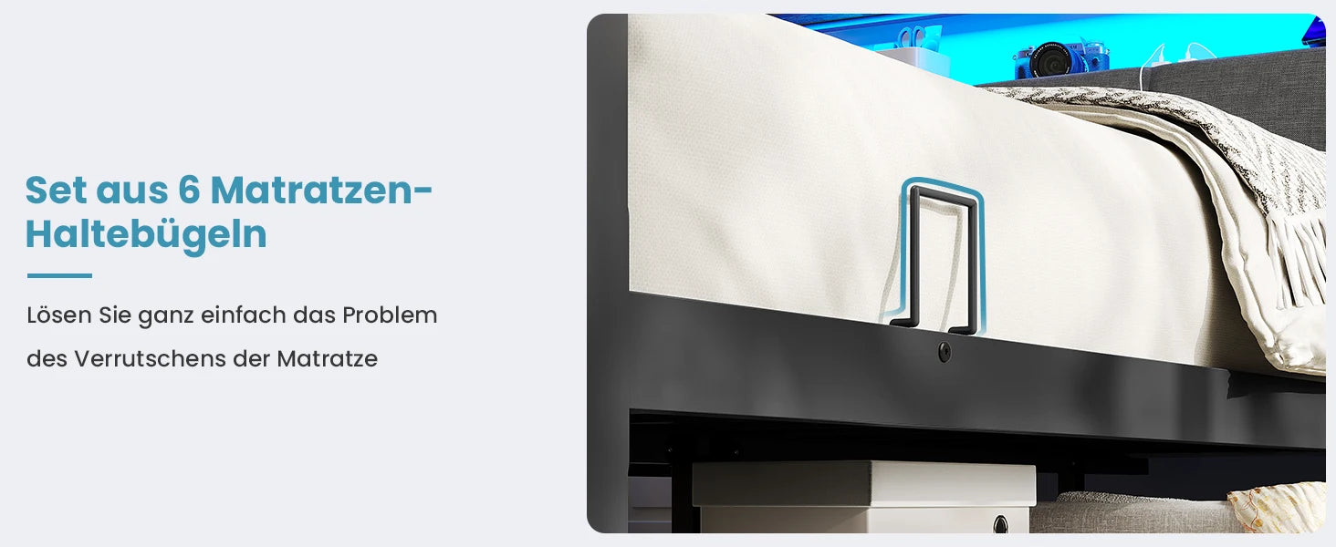 Metallbettgestell 140 x 200 cm mit LED-Beleuchtung, Kopfteil und Ladestation, integriertes Metallbett 140 x 200 mit Gitterbraten