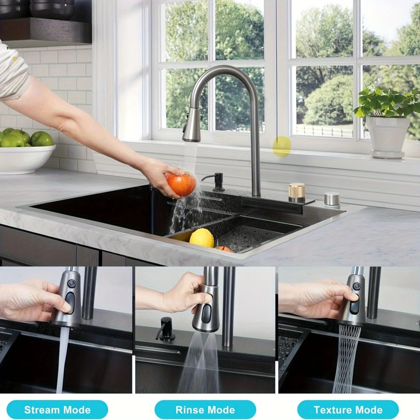 Multifunctional Stainless Steel Kitchen Sink – Double Basin Undermount with Waterfall Faucet, Drain Basket & Cutting Board