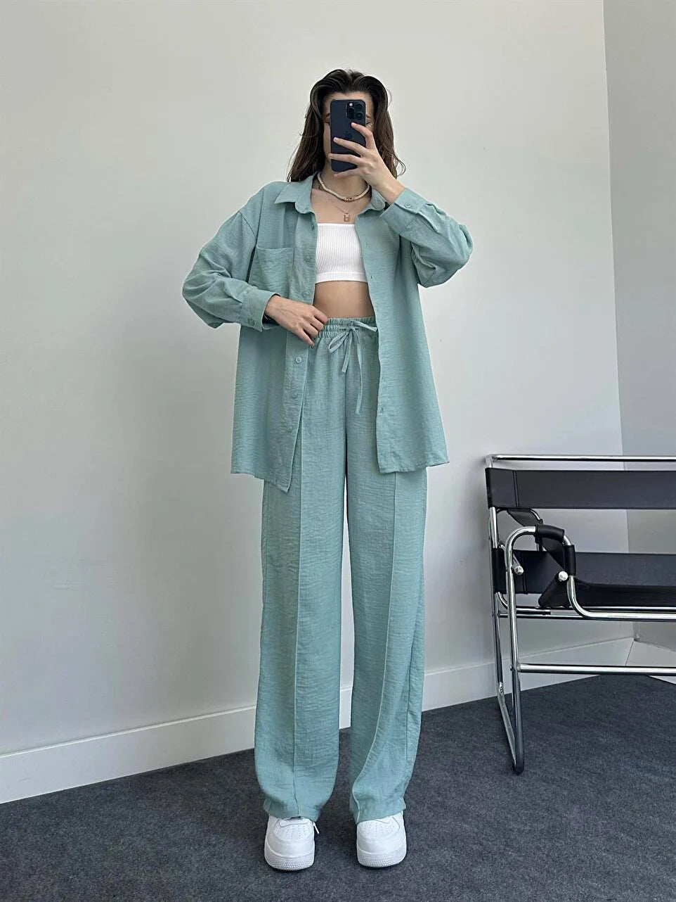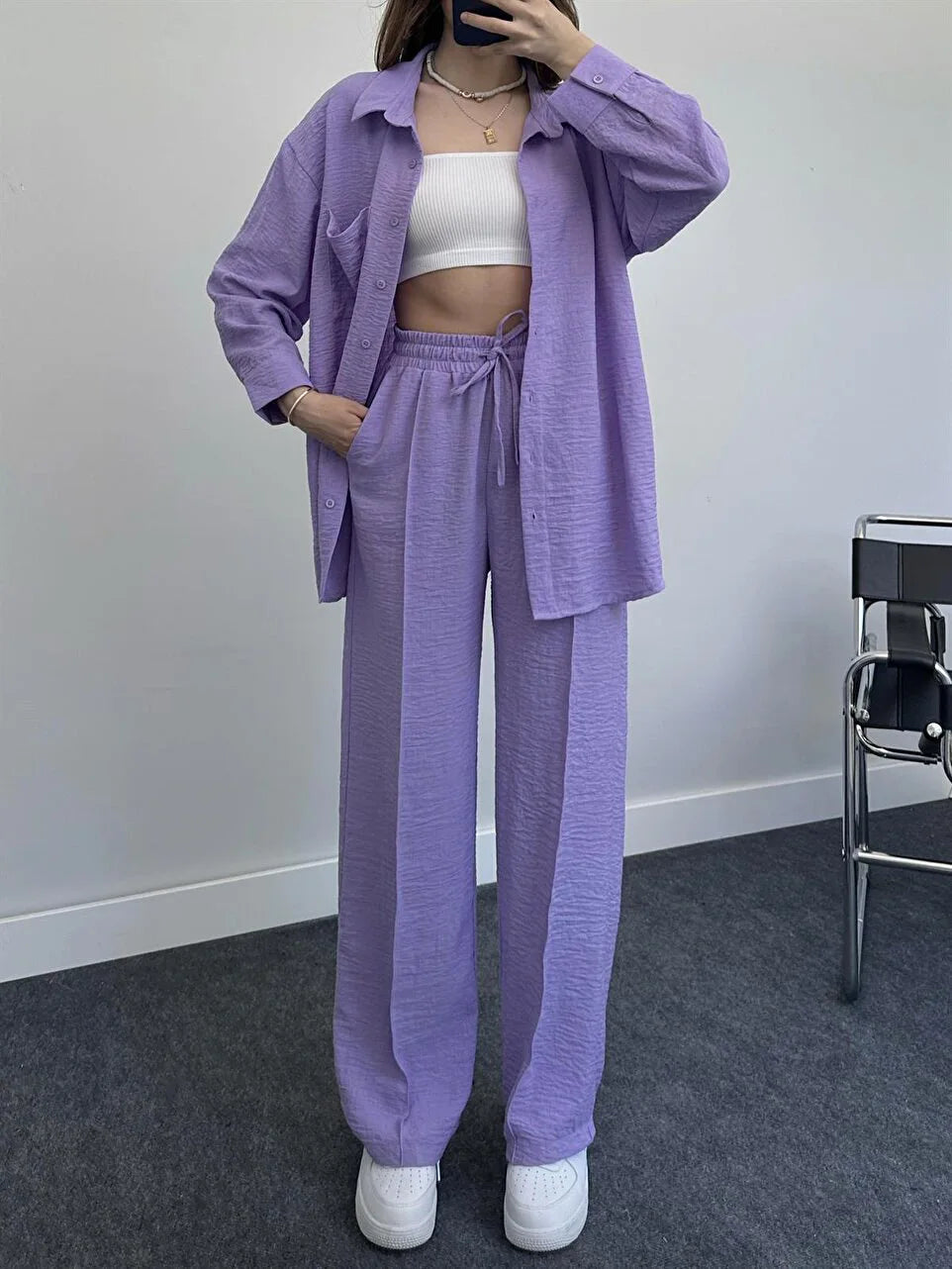 New Autumn Red Women Casual Two-piece Set, Features A Thin Long-sleeved Lapel Shirt Paired with Matching Drawstring Trousers.
