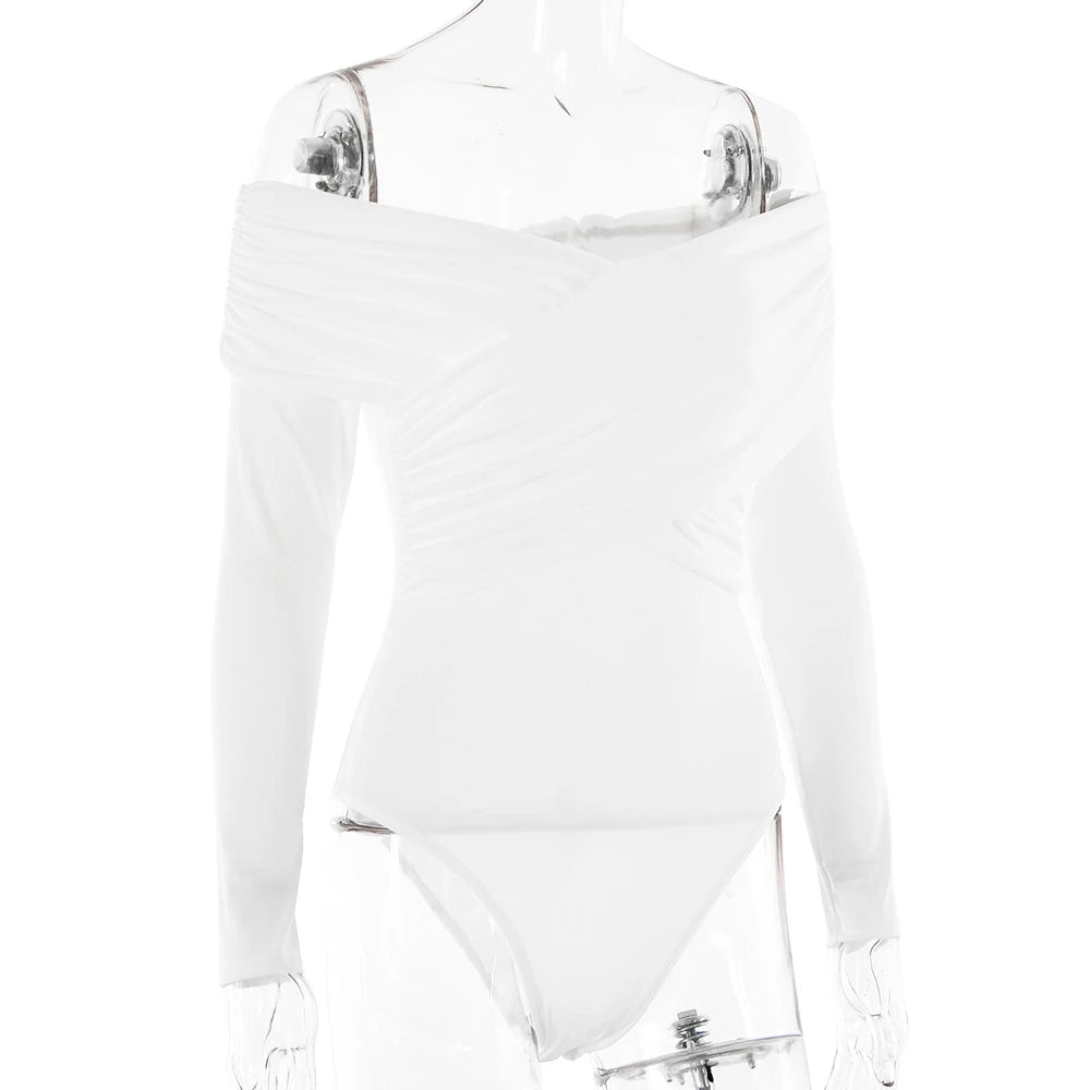 New Solid Sexy Off Shoulder Bodysuits Women Fashion Crossed Folds Skinny Rompers Long Sleeve Fashion Streetwear Autumn Bodysuits