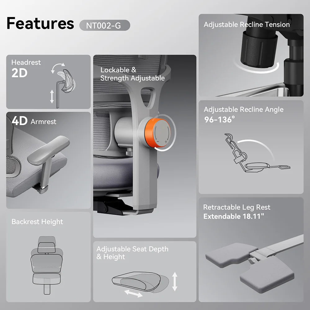 NEWTRAL NT002 Ergonomischer Stuhl, adaptive Untersetzer mit Fußstütze, 4 Rückenlehnen, verstellbare Rückenlehne, Armlehne, Kopfstütze