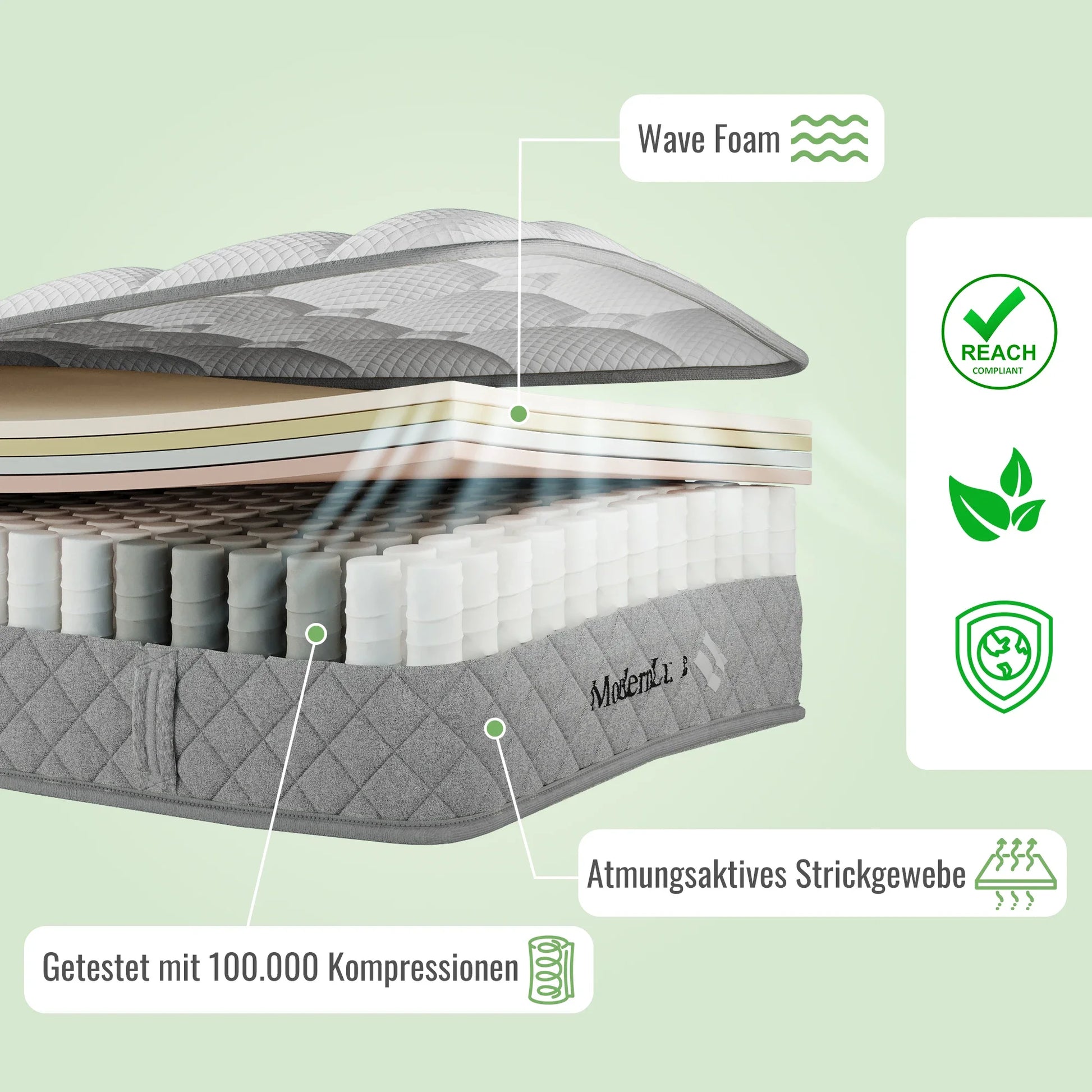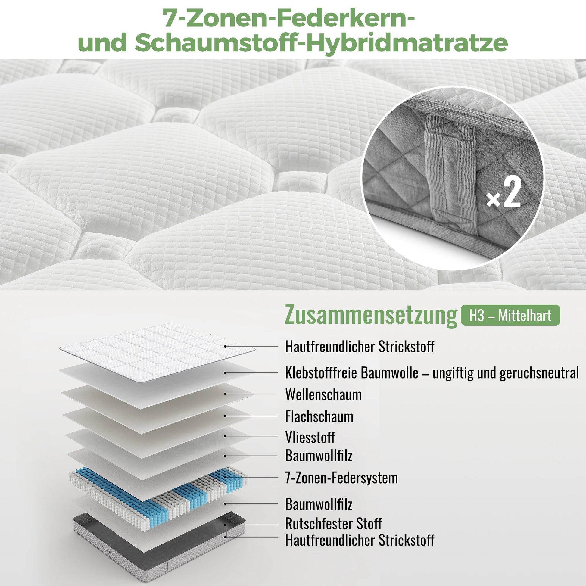 Orthopädische Kaltschaummatratze, 90 x 200 cm, mit 7-Zonen-Taschenfederkern, Festigkeitstufe H3 (mittelfest)