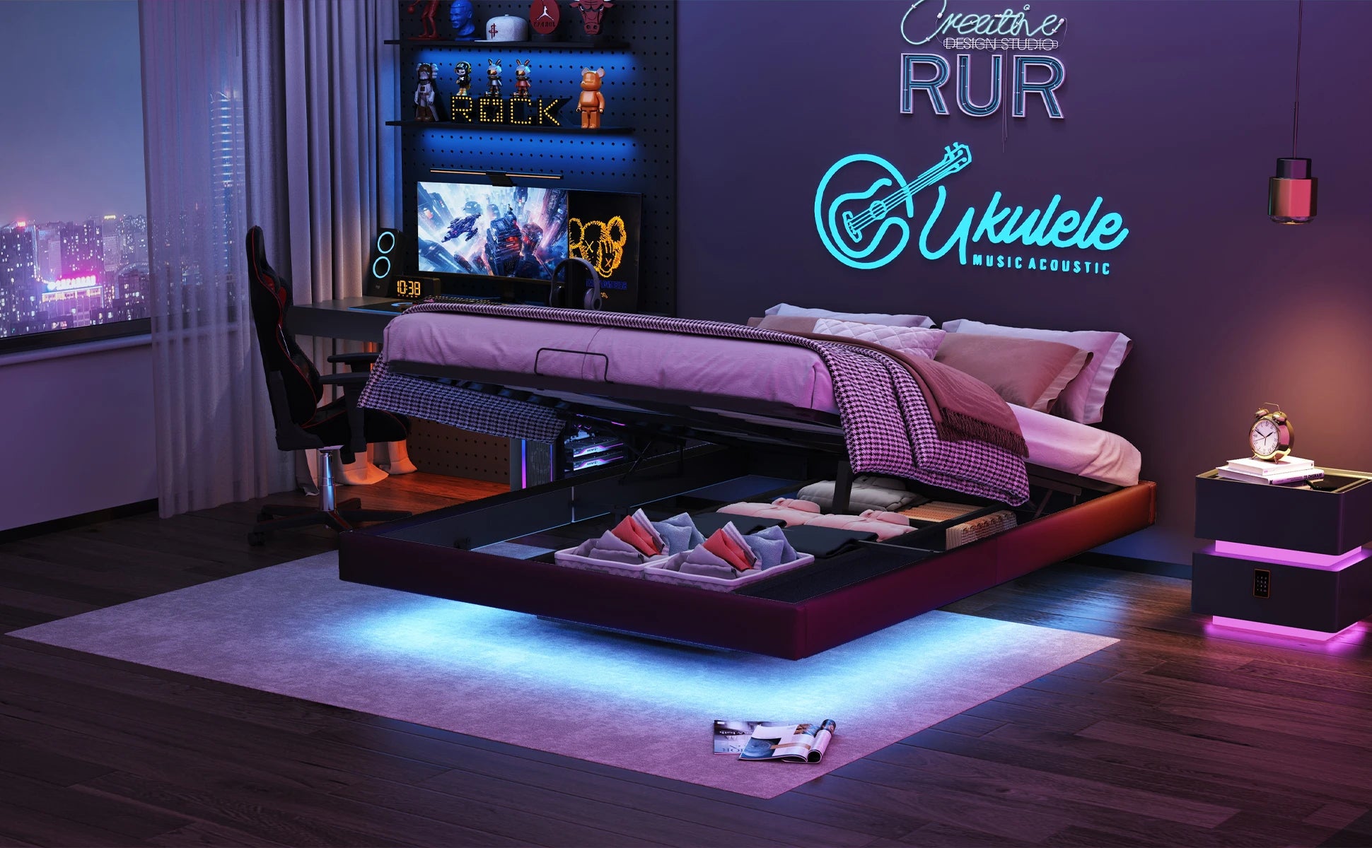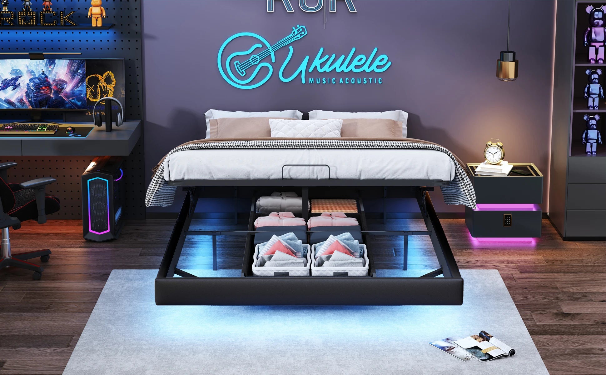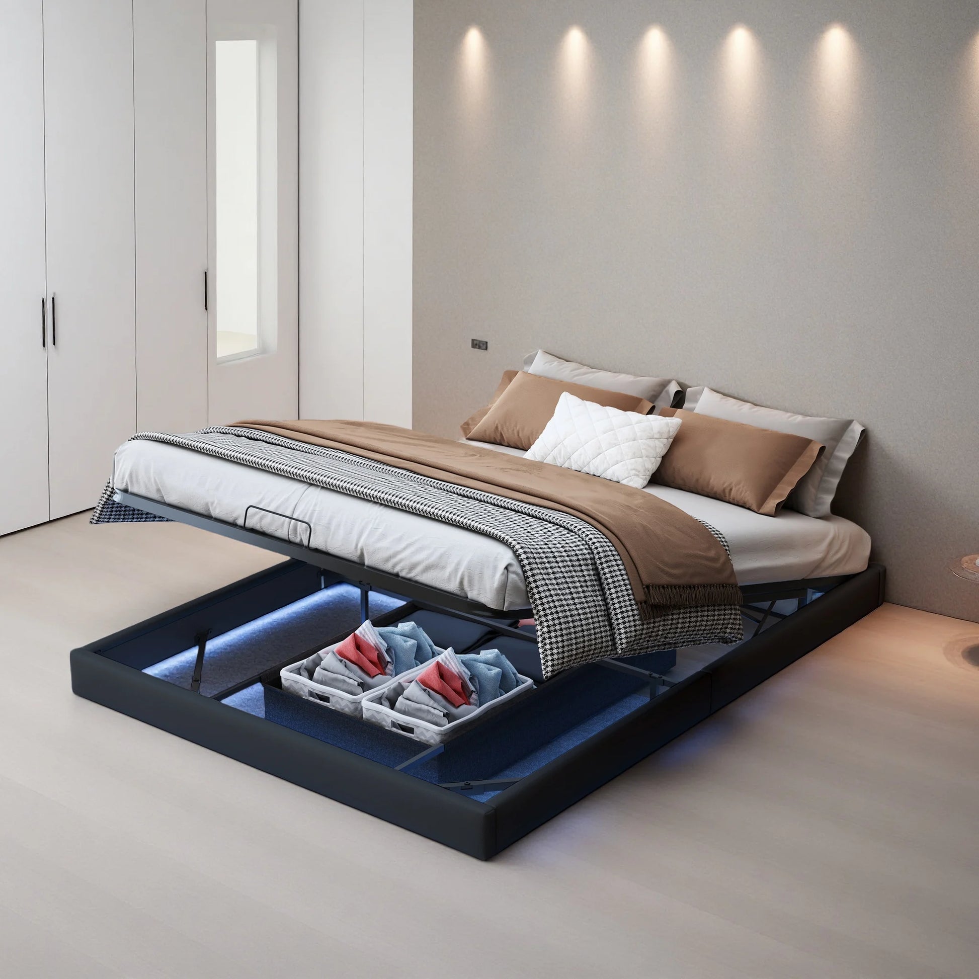 Polsterbett, 140 x 200 cm, mit Stauraum und Lattenrost, schwimmender Bettrahmen mit LED-Licht, Doppelbetten, hydraulische, PU