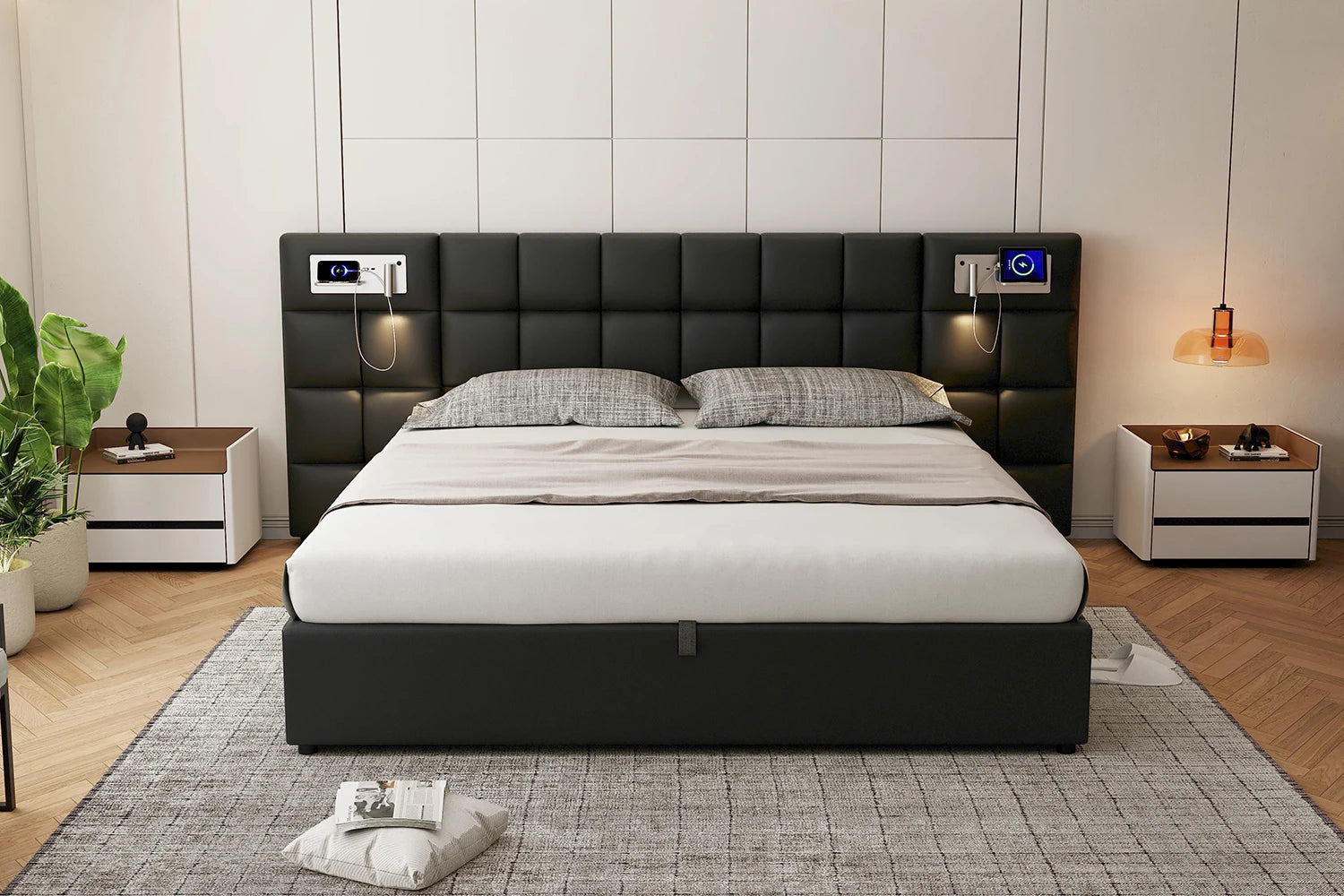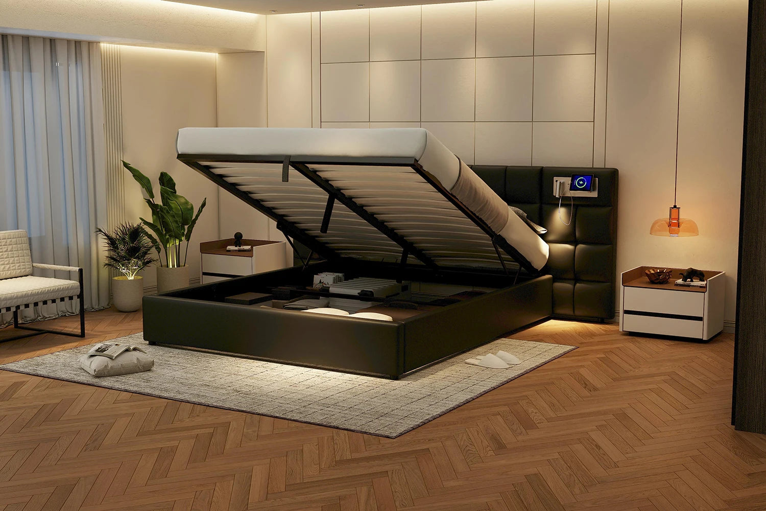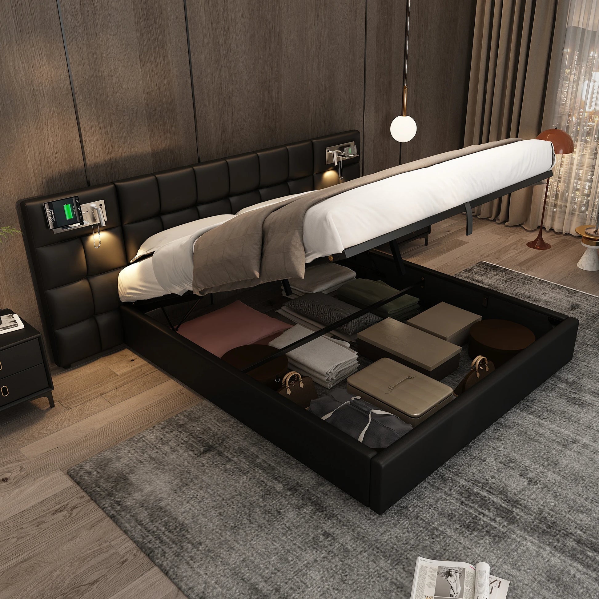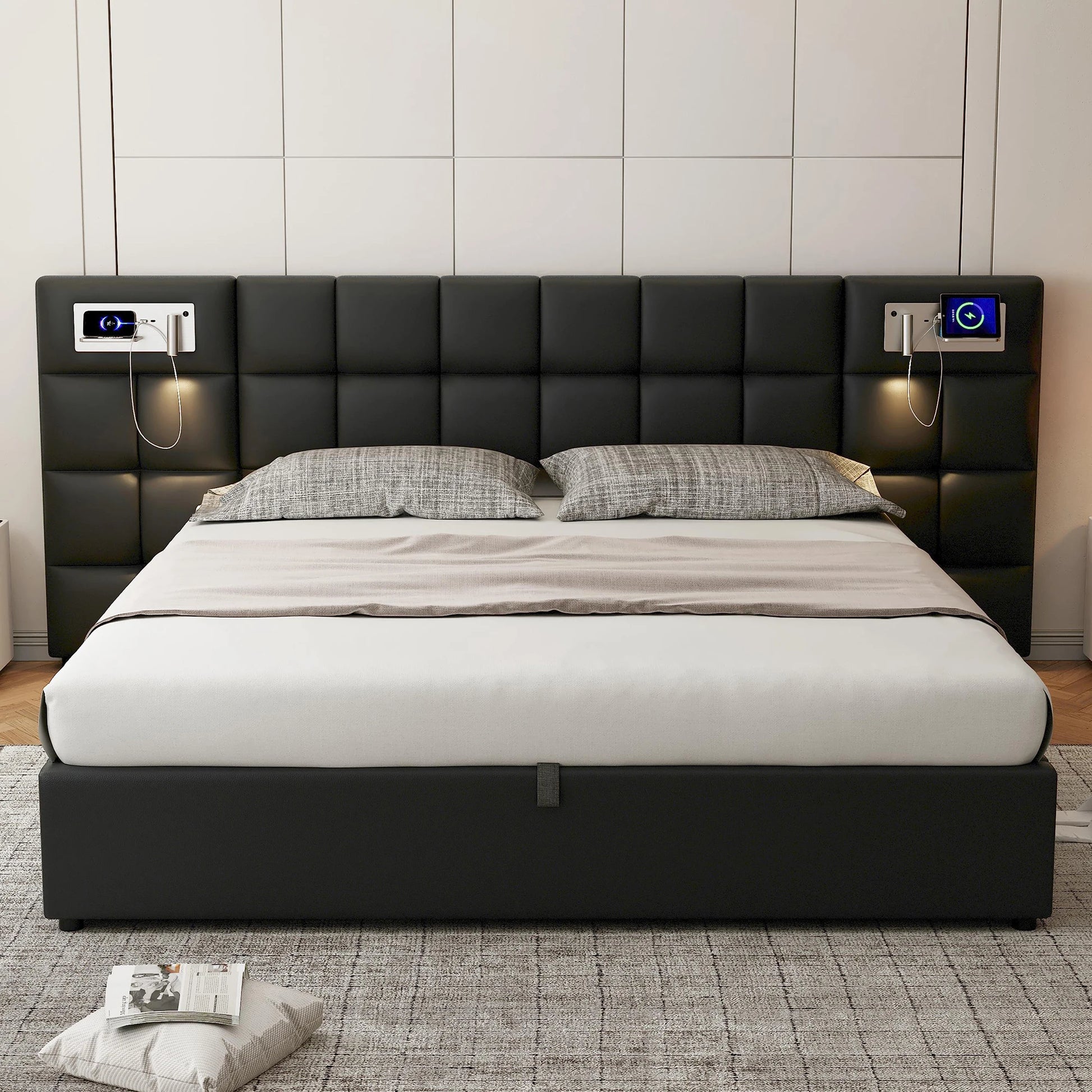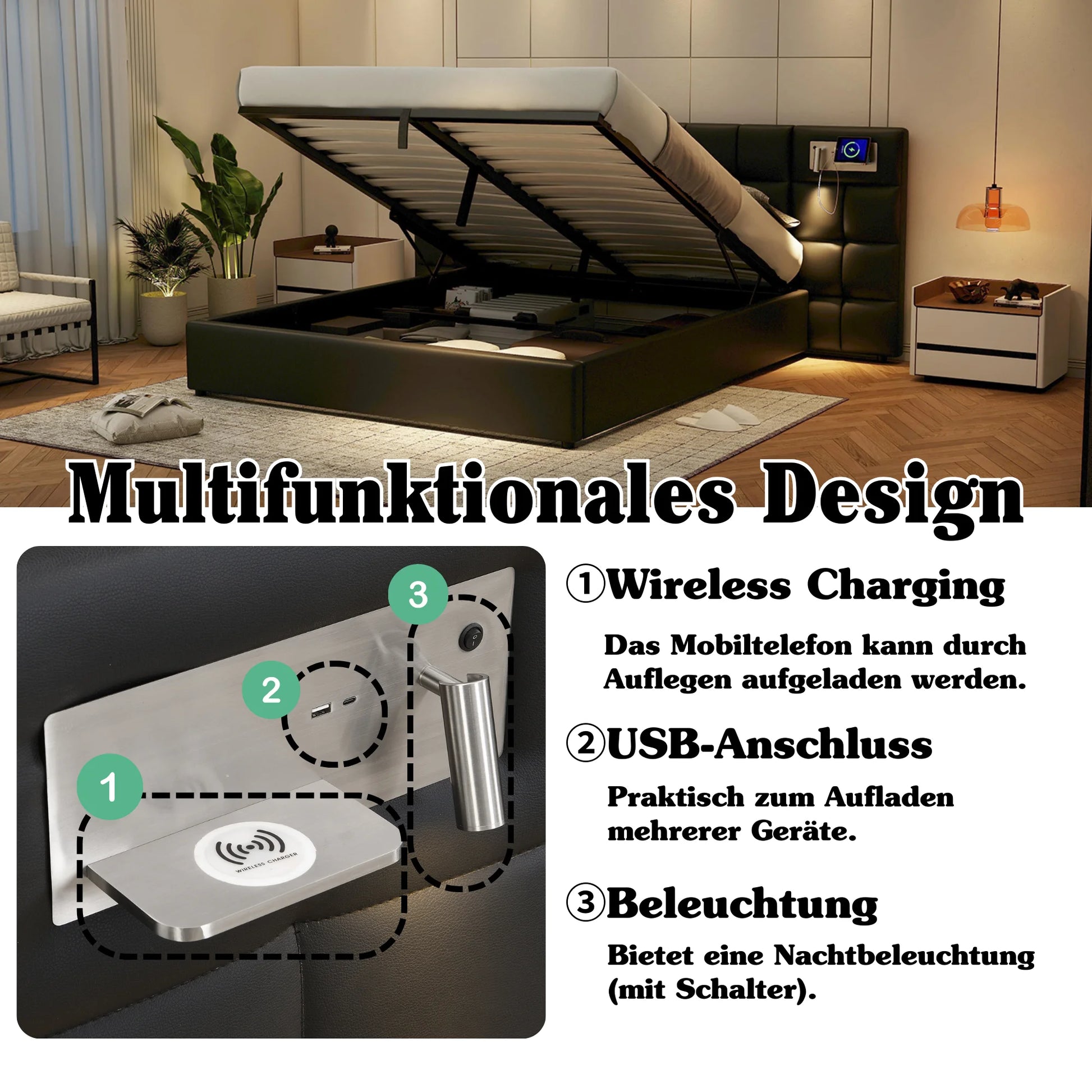 Polsterbett 180 x 200 cm, hydraulisches Bett, mit USB-Anschluss, kabelloses Laden und beleuchteter Lampe, mit Stauraum