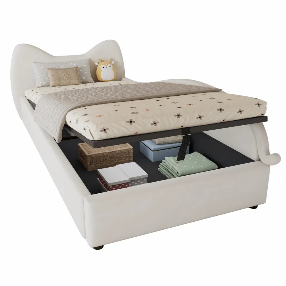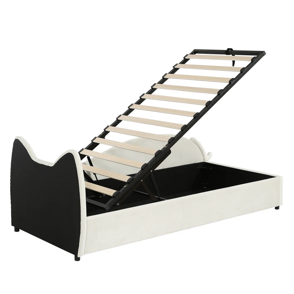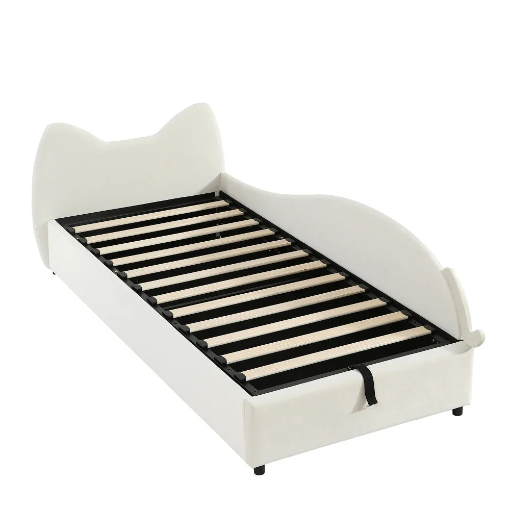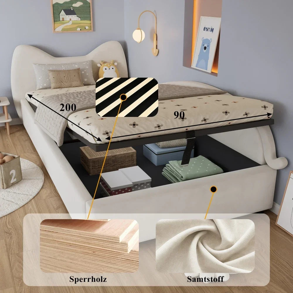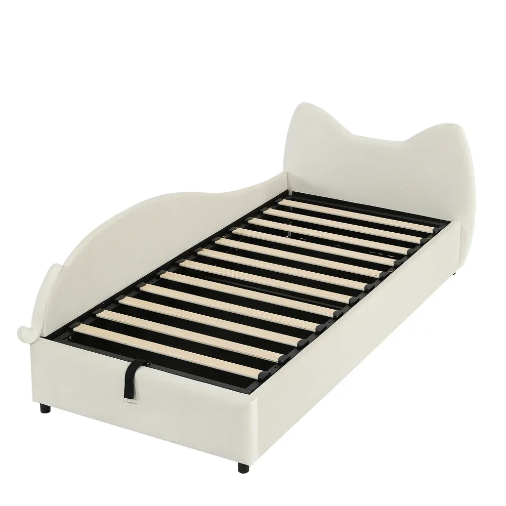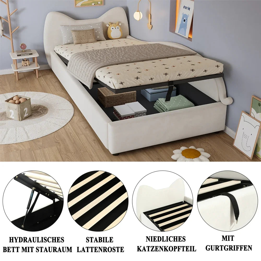 Polsterbett, Einzelbett, süßes Katzendesign, hydraulisches Bett mit Stauraum und Gürtelgriffen, stabiler Gitterrost, 90 x 200 cm