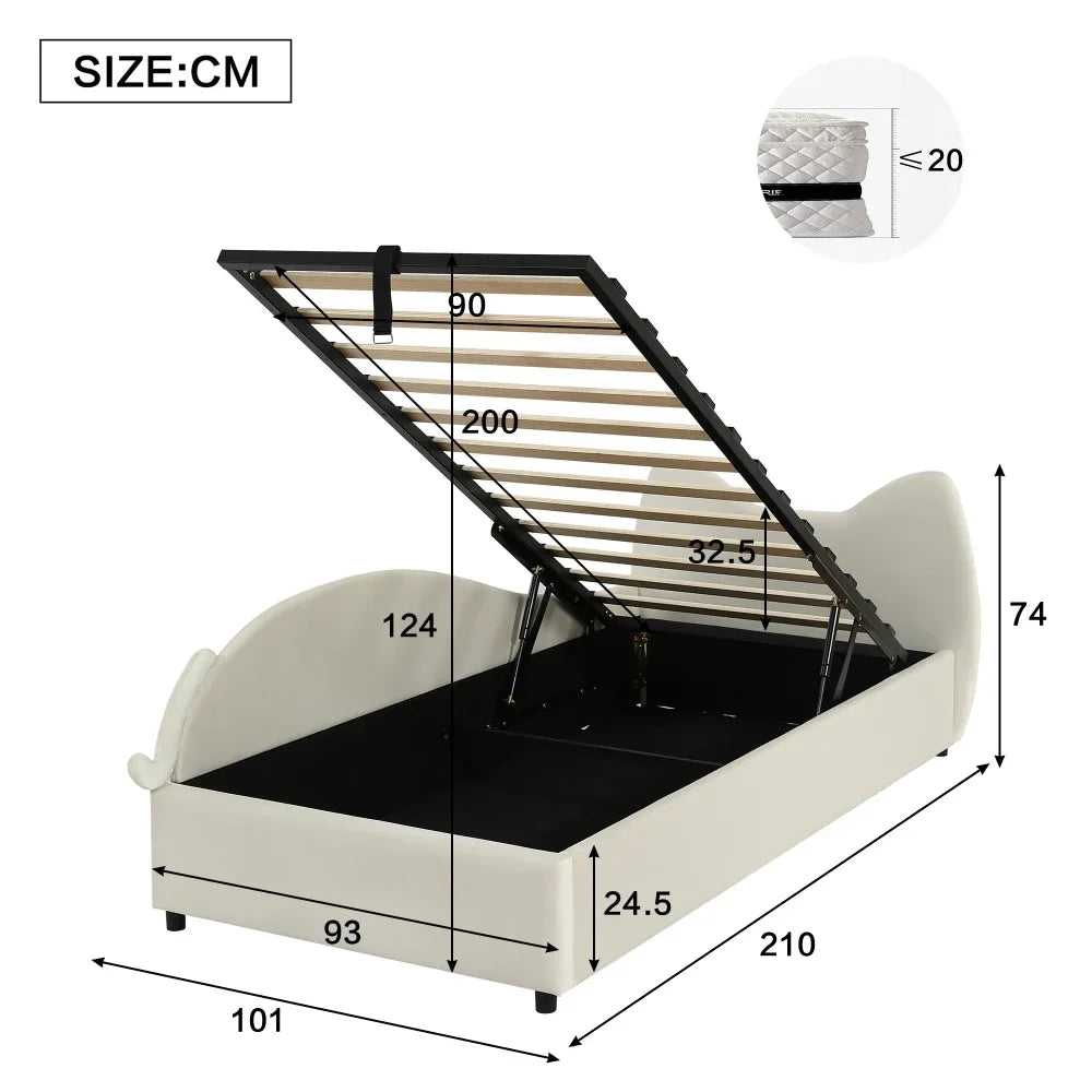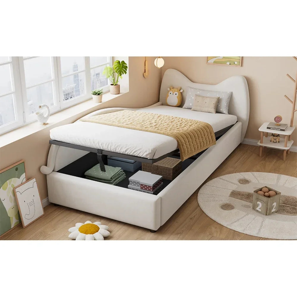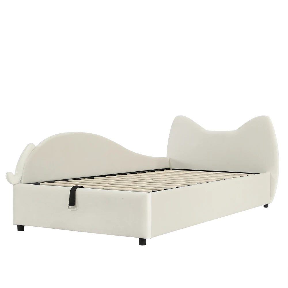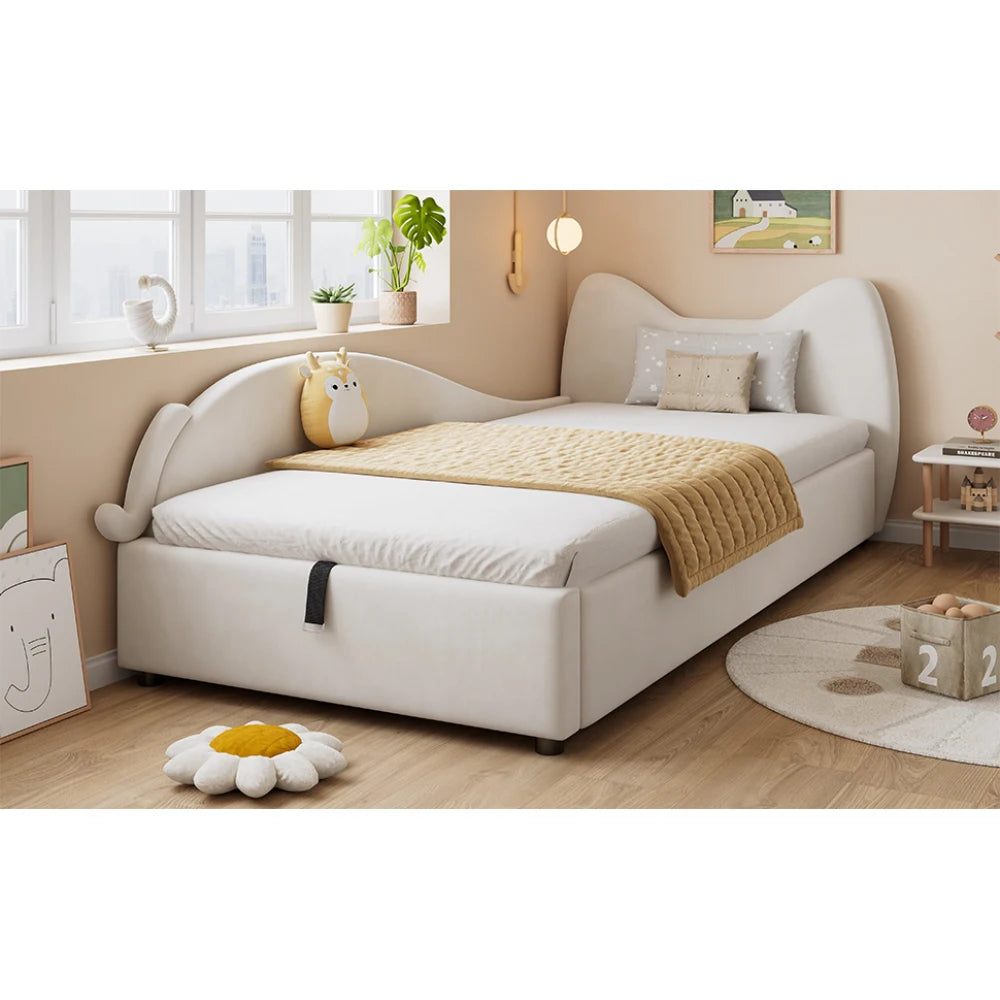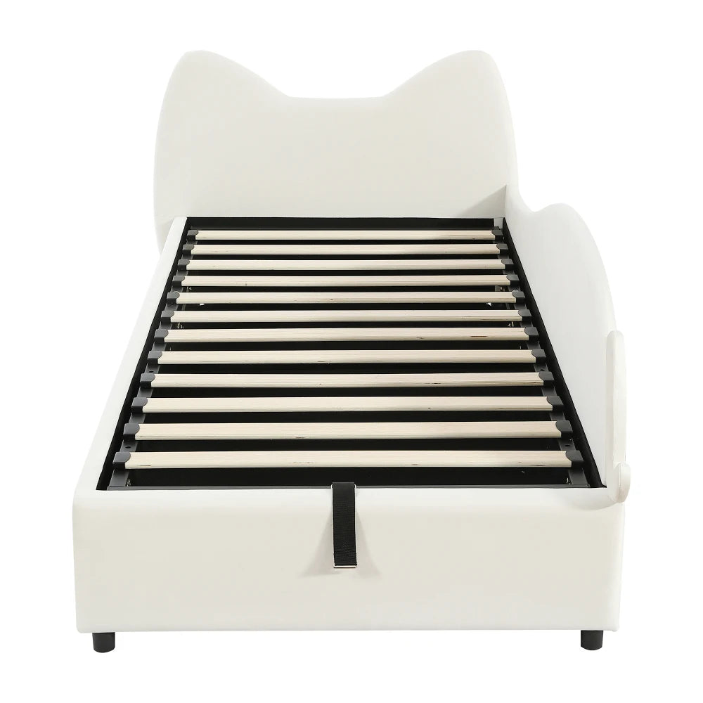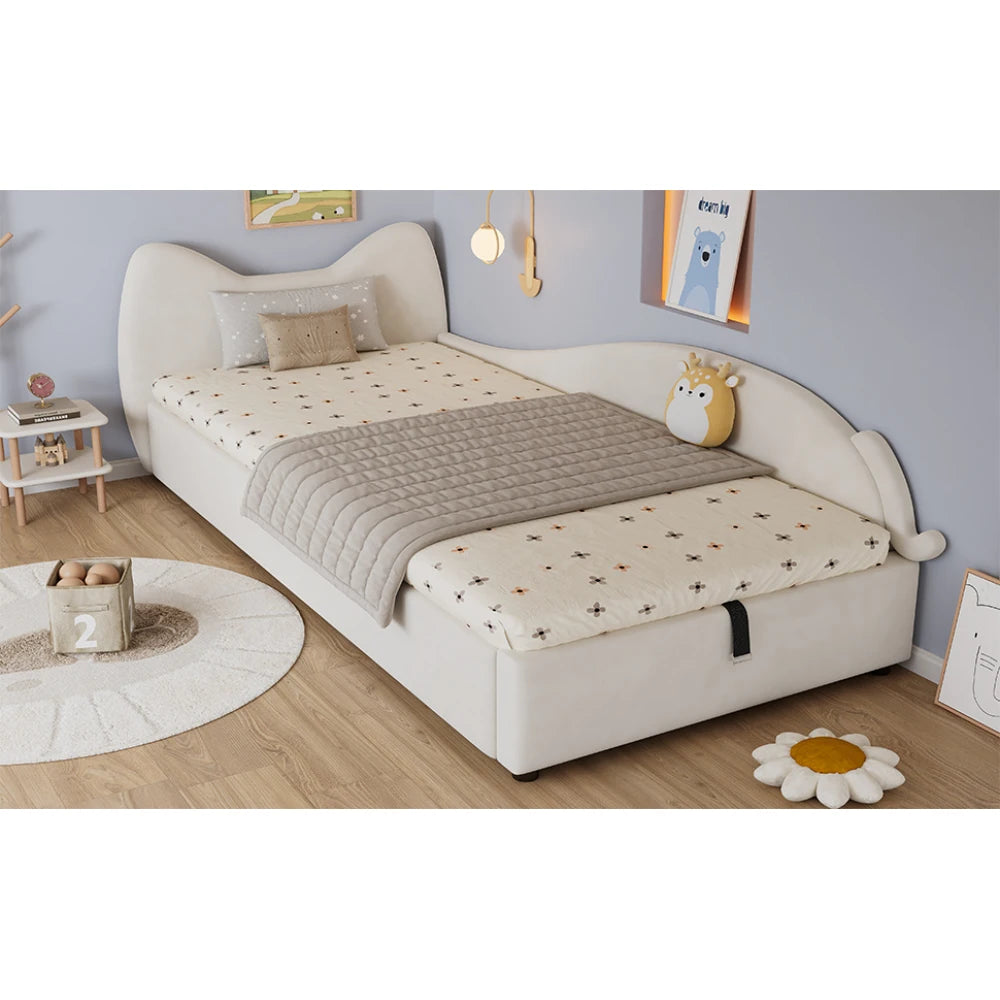 Polsterbett, Einzelbett, süßes Katzendesign, hydraulisches Bett mit Stauraum und Gürtelgriffen, stabiler Gitterrost, 90 x 200 cm