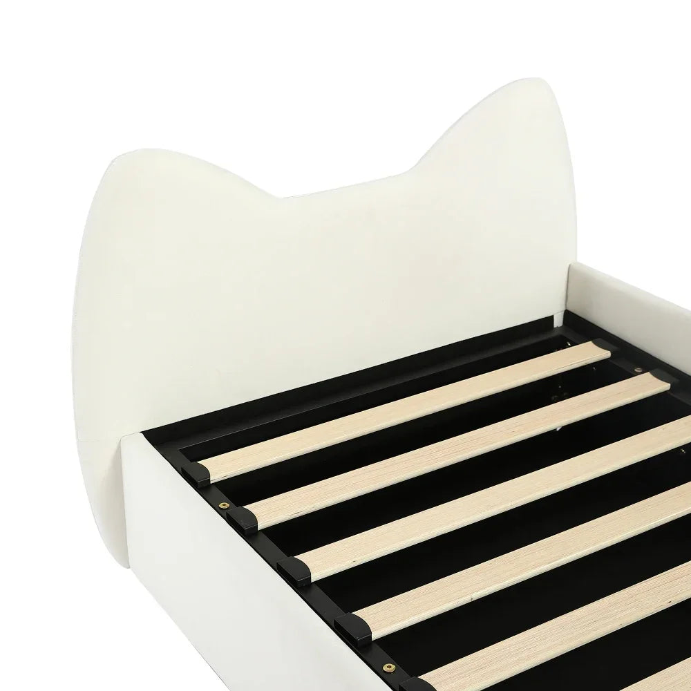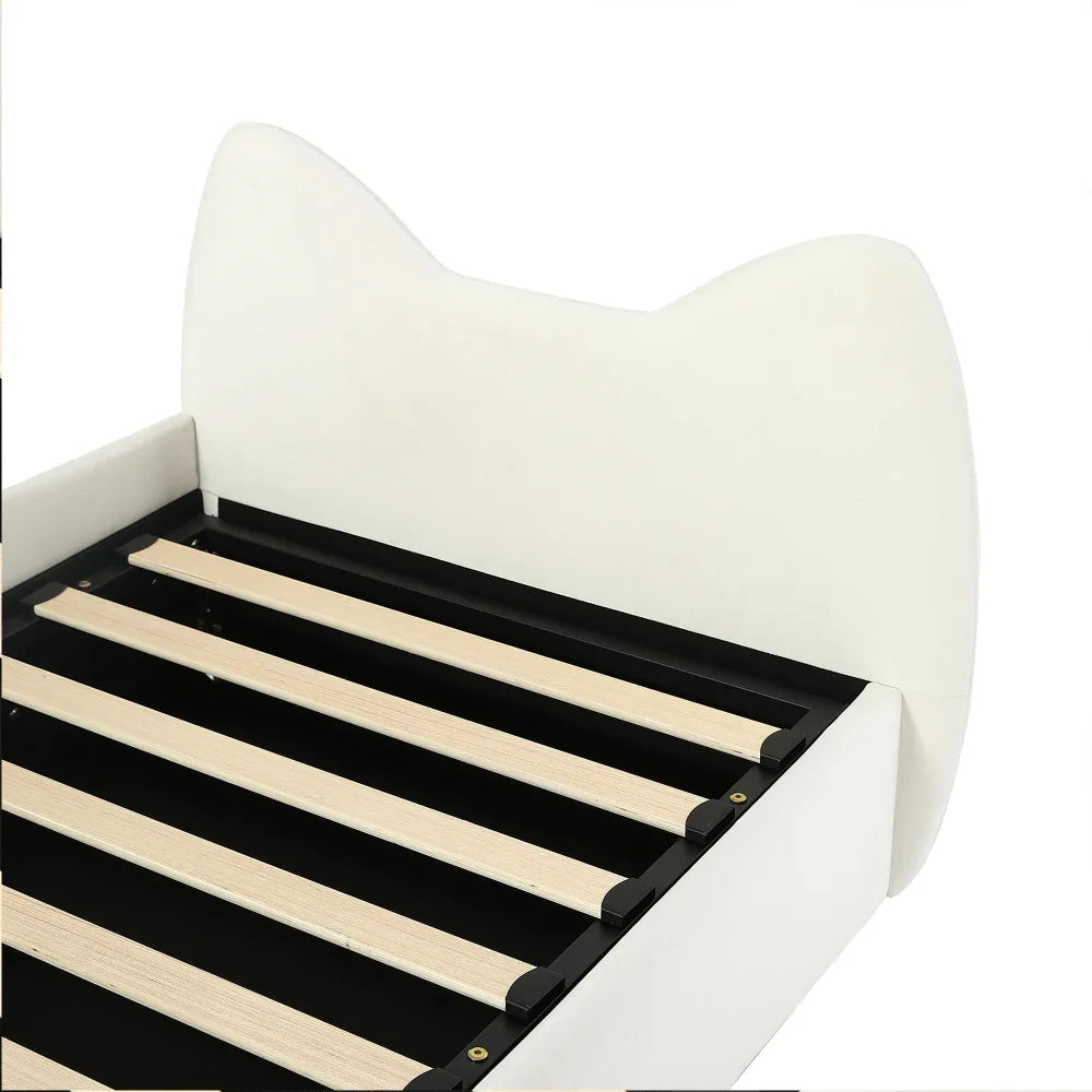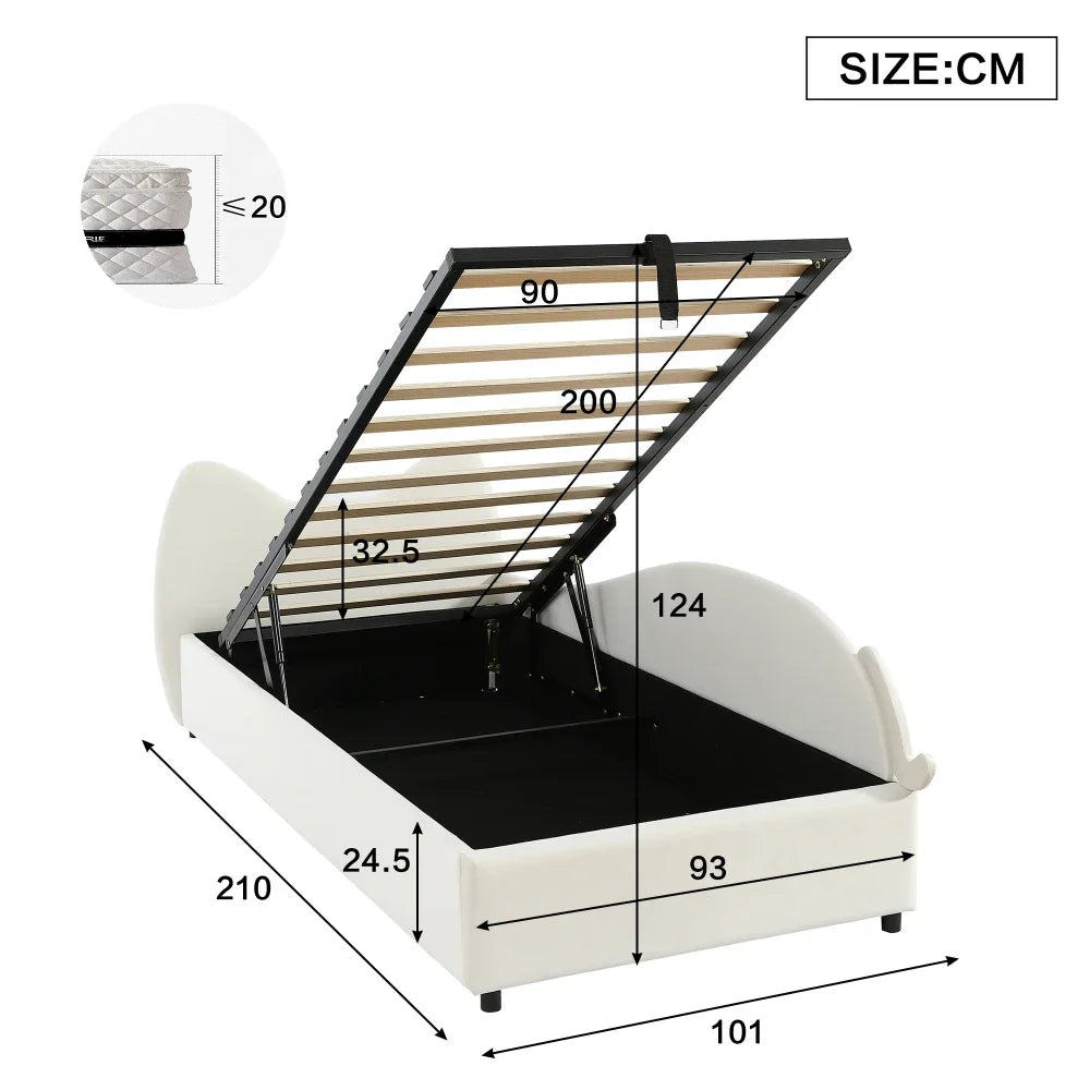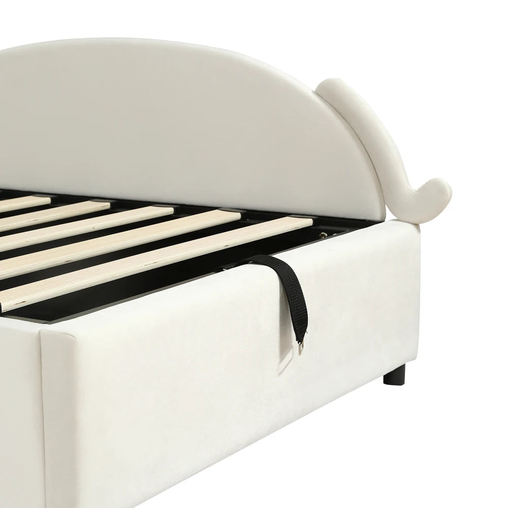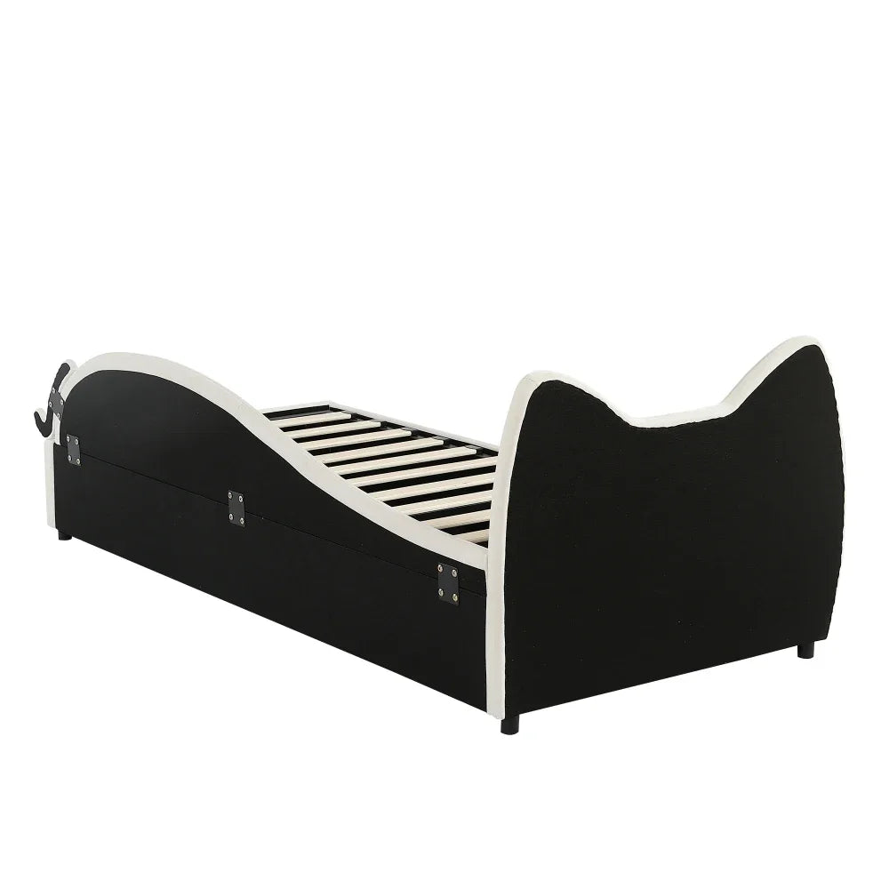 Polsterbett, Einzelbett, süßes Katzendesign, hydraulisches Bett mit Stauraum und Gürtelgriffen, stabiler Gitterrost, 90 x 200 cm