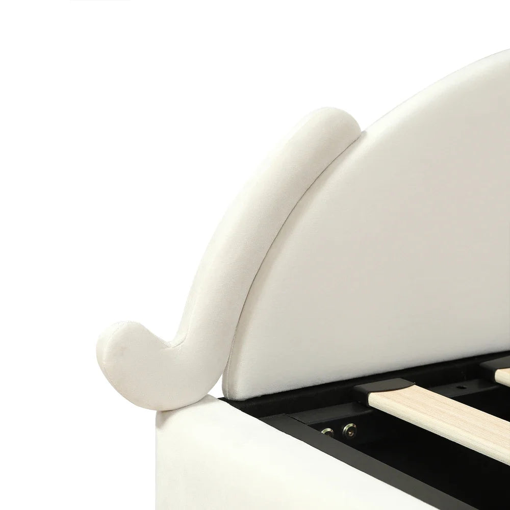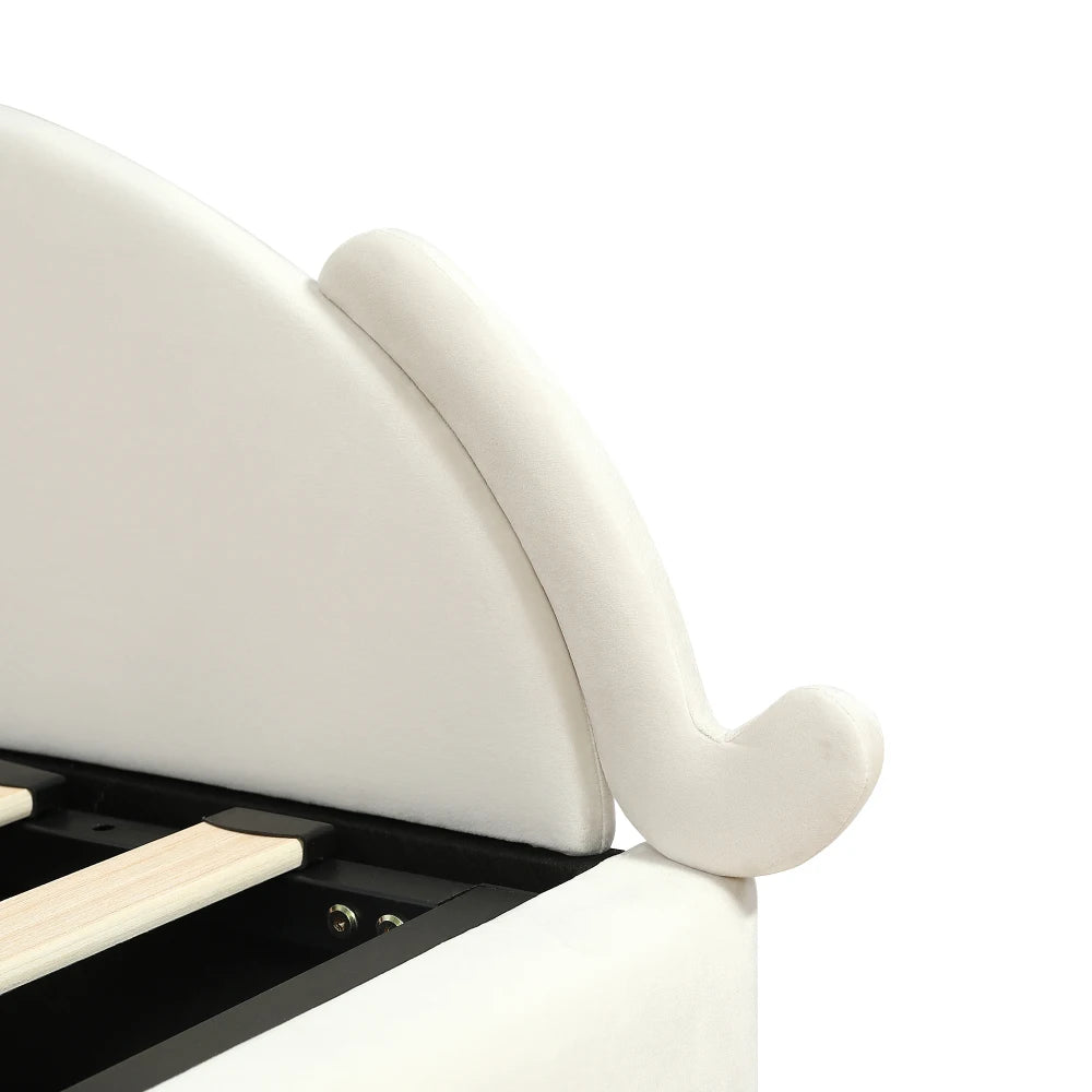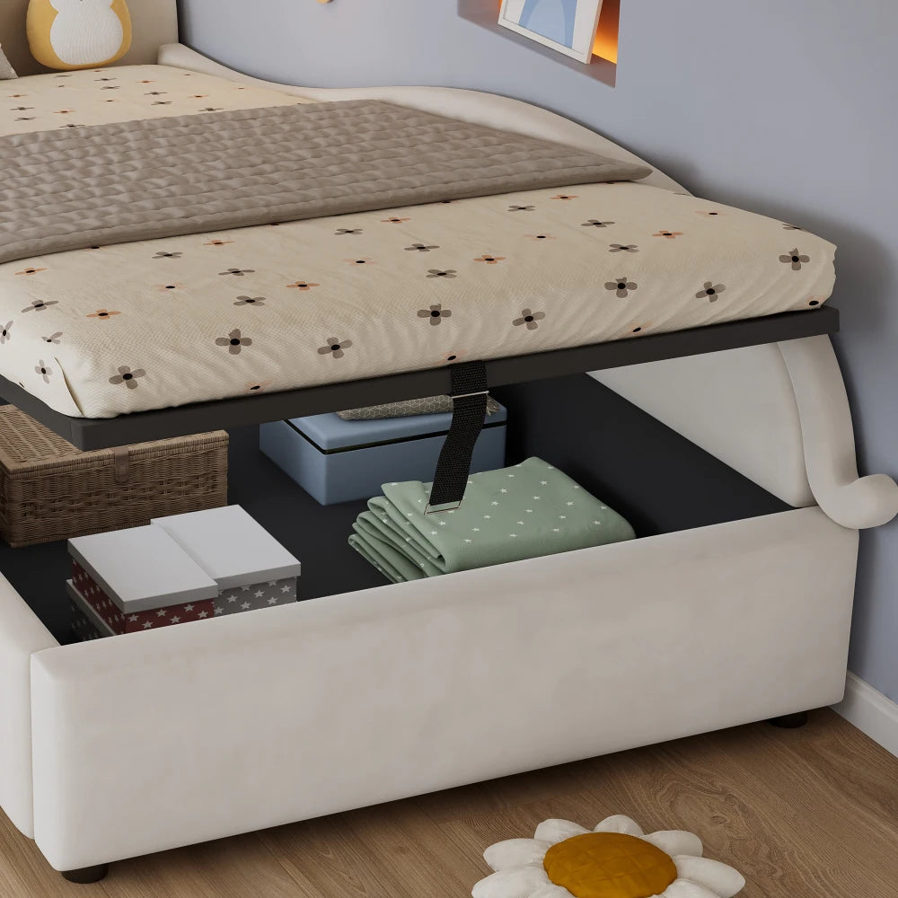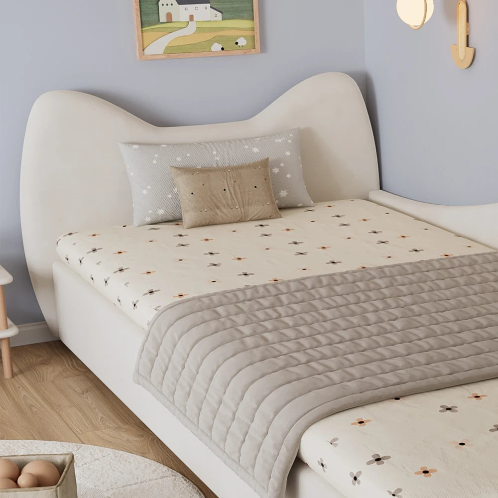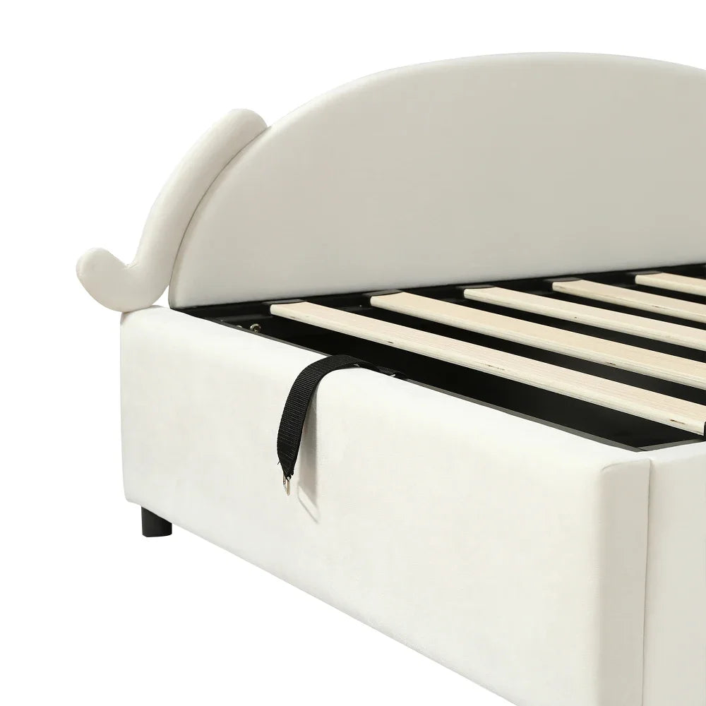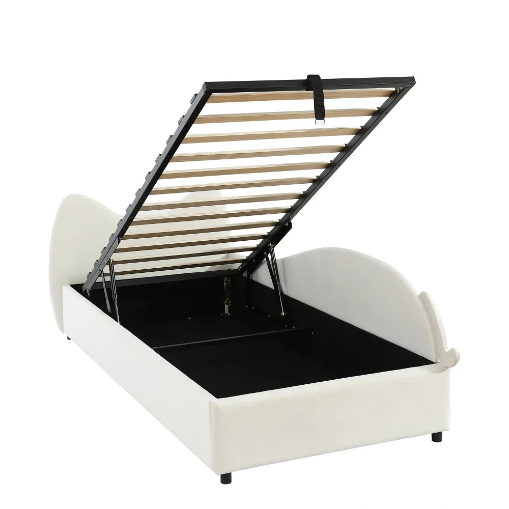 Polsterbett, Einzelbett, süßes Katzendesign, hydraulisches Bett mit Stauraum und Gürtelgriffen, stabiler Gitterrost, 90 x 200 cm