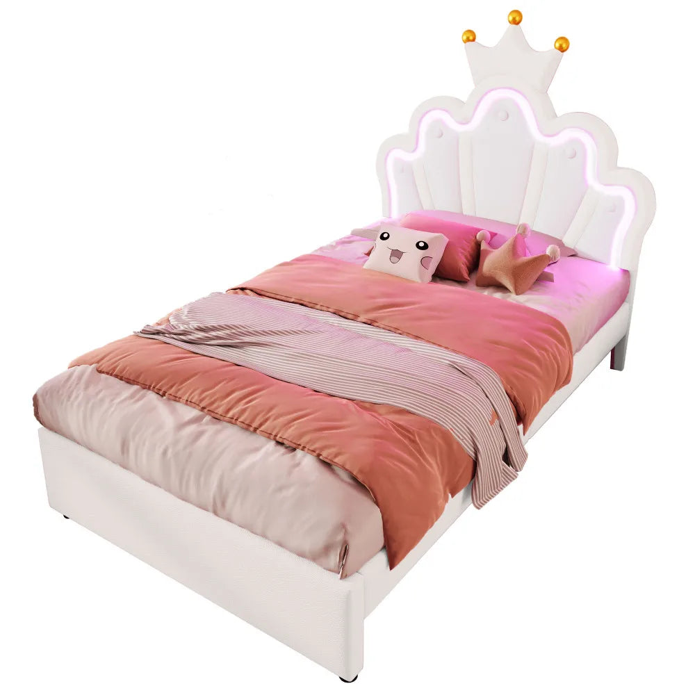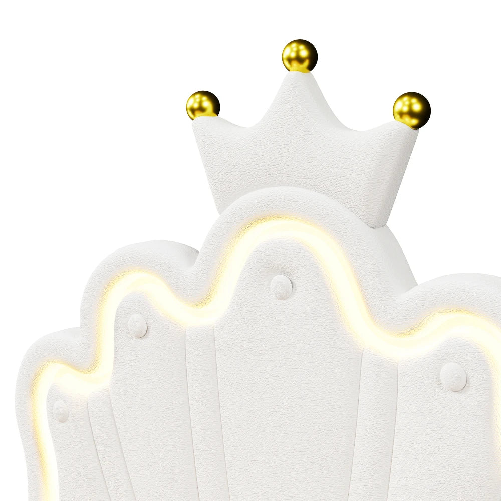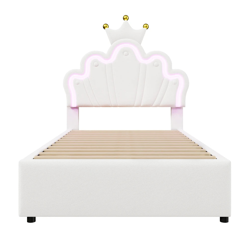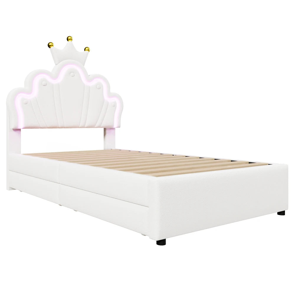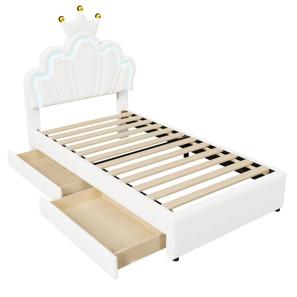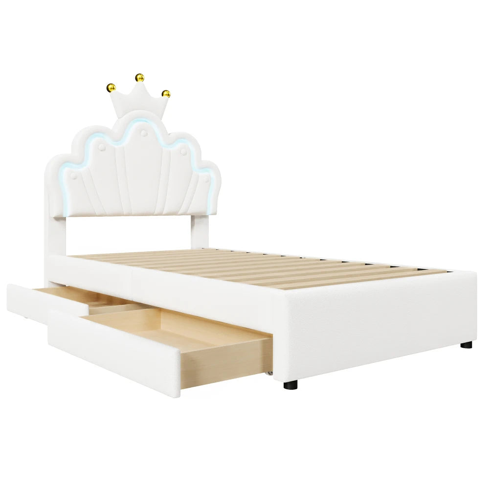 Polsterbett ohne Matratze, ferngesteuertes Umgebungslichtbett mit 2 Schubladen, kronenförmiges Prinzessinnenbett, verstellbarer Kopf, PU, Weiß