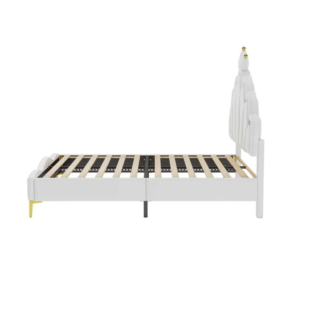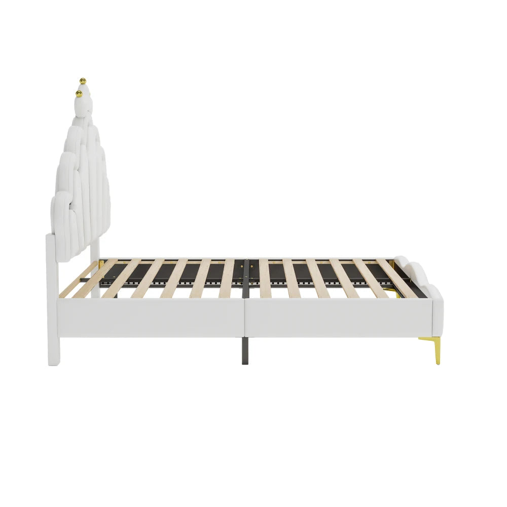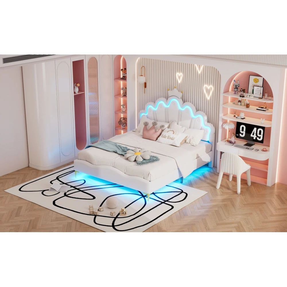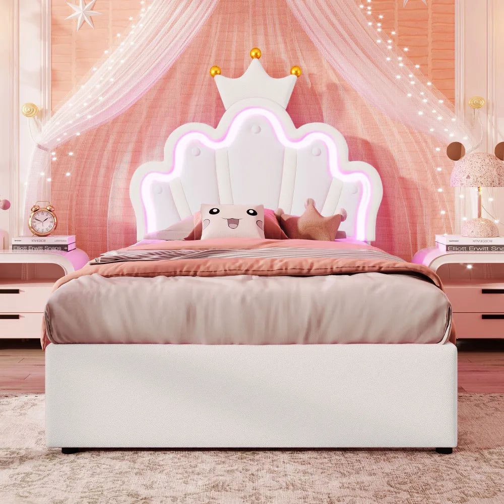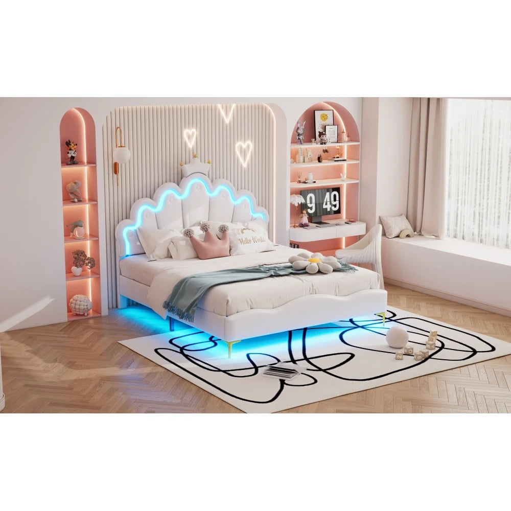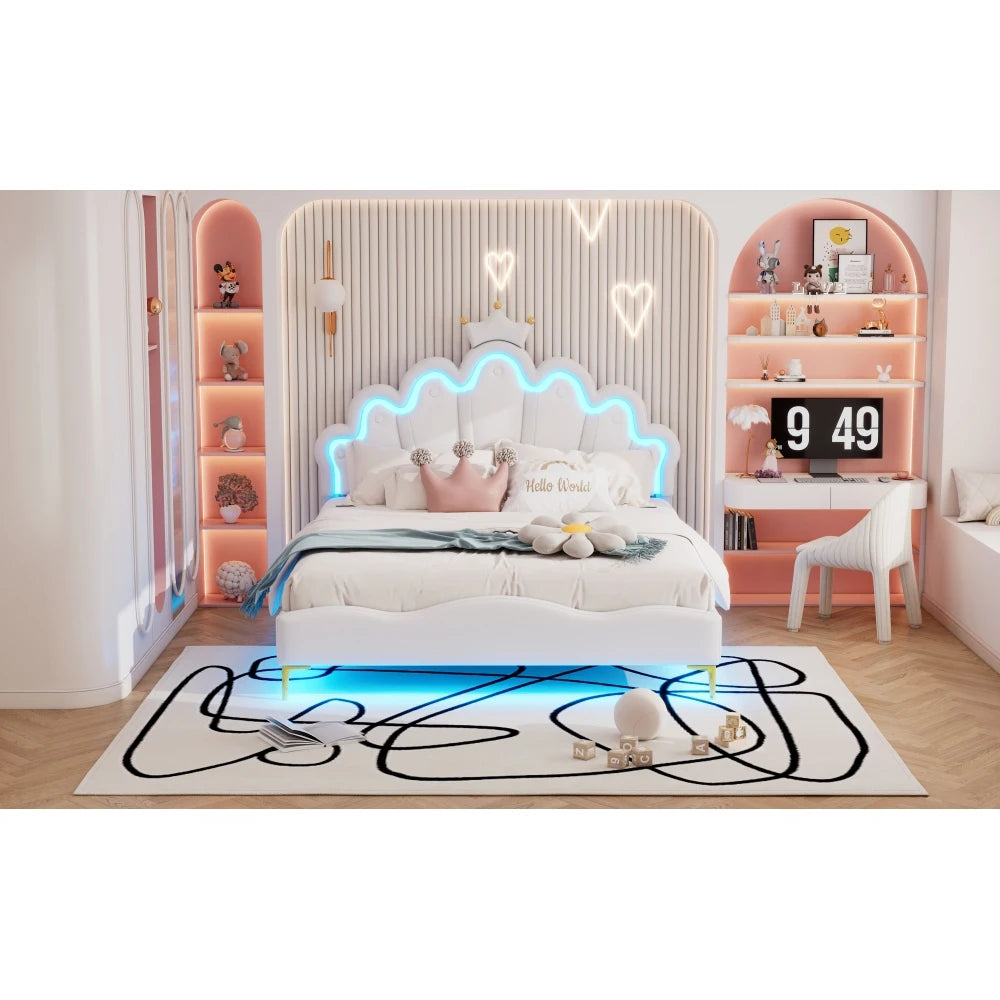 Polsterbett ohne Matratze, ferngesteuertes Umgebungslichtbett mit 2 Schubladen, kronenförmiges Prinzessinnenbett, verstellbarer Kopf, PU, Weiß