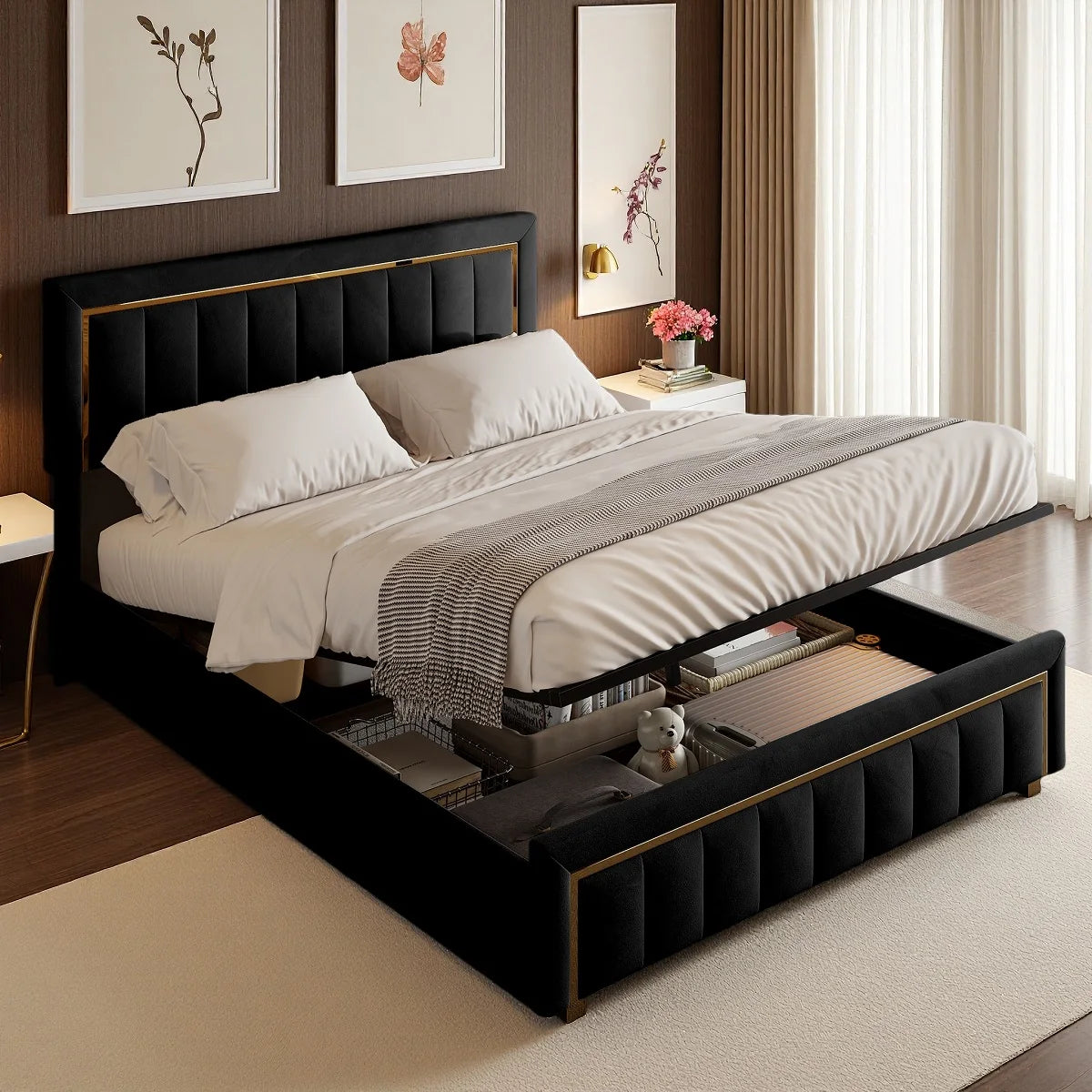 Polsterbett140 x 200cm,Doppelbett mit Hydraulisch und Lattenrost,Jugendbett mit hydraulischem Stauraum und Kopfteil,Samt,Schwarz