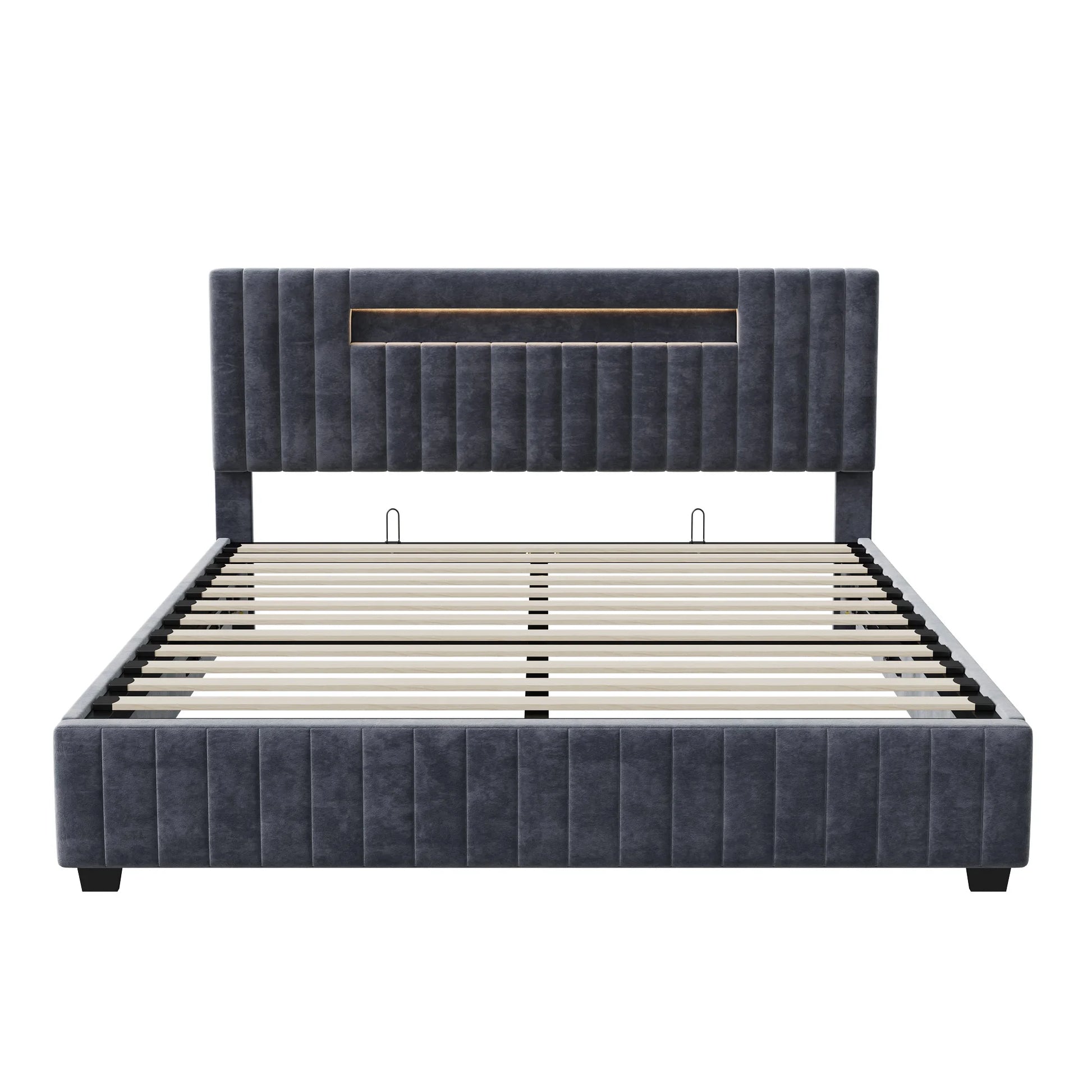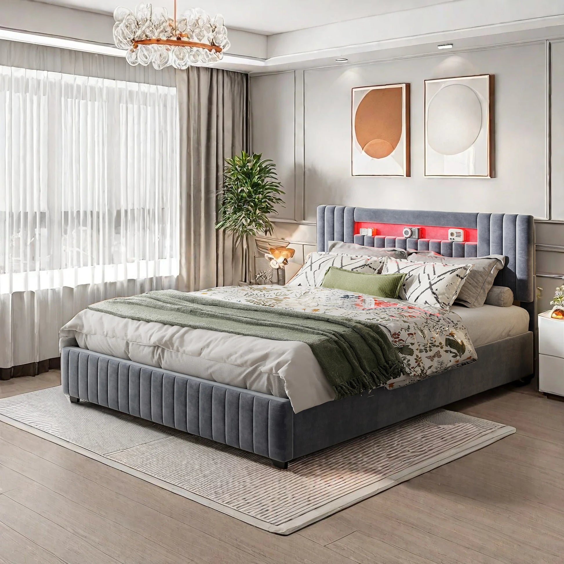 Rosahqnda 140x200 Bett mit Stauraum und Untergestell, gepolstertes Bett mit Stauraum, Doppelbett mit LED, Bettgestell aus Samt, mit Lattenrost, Grau