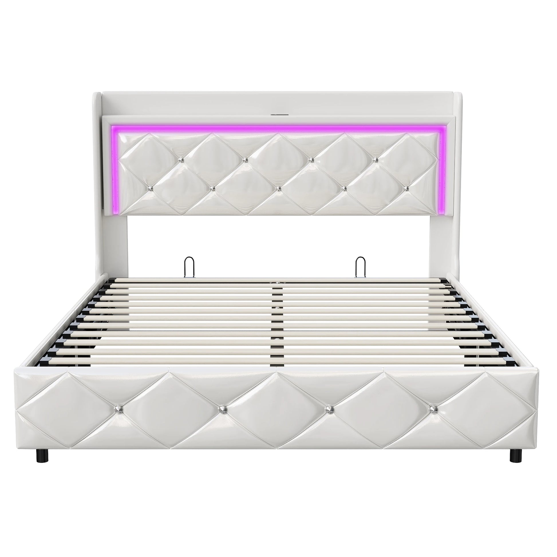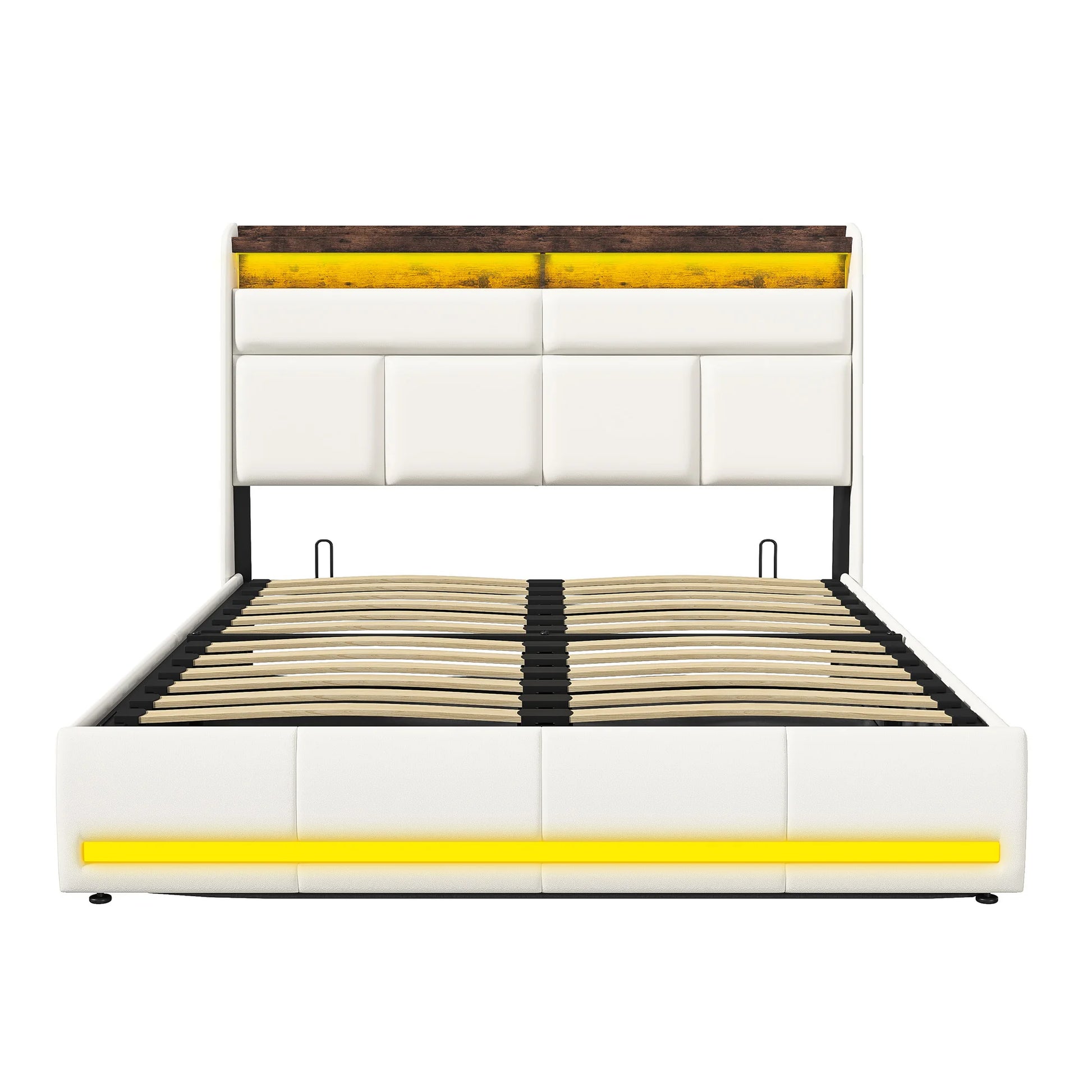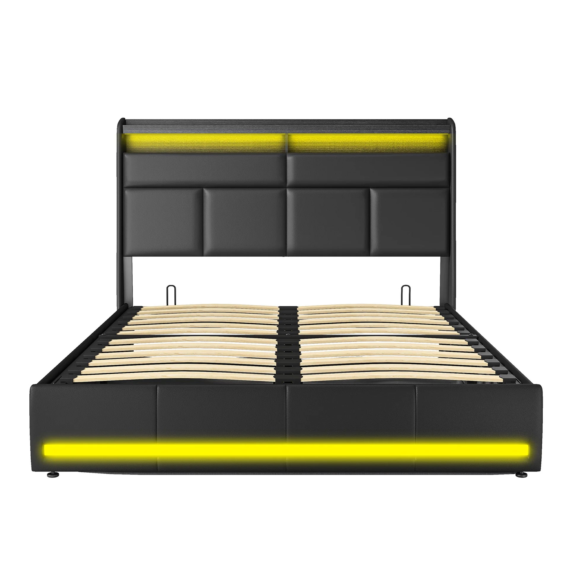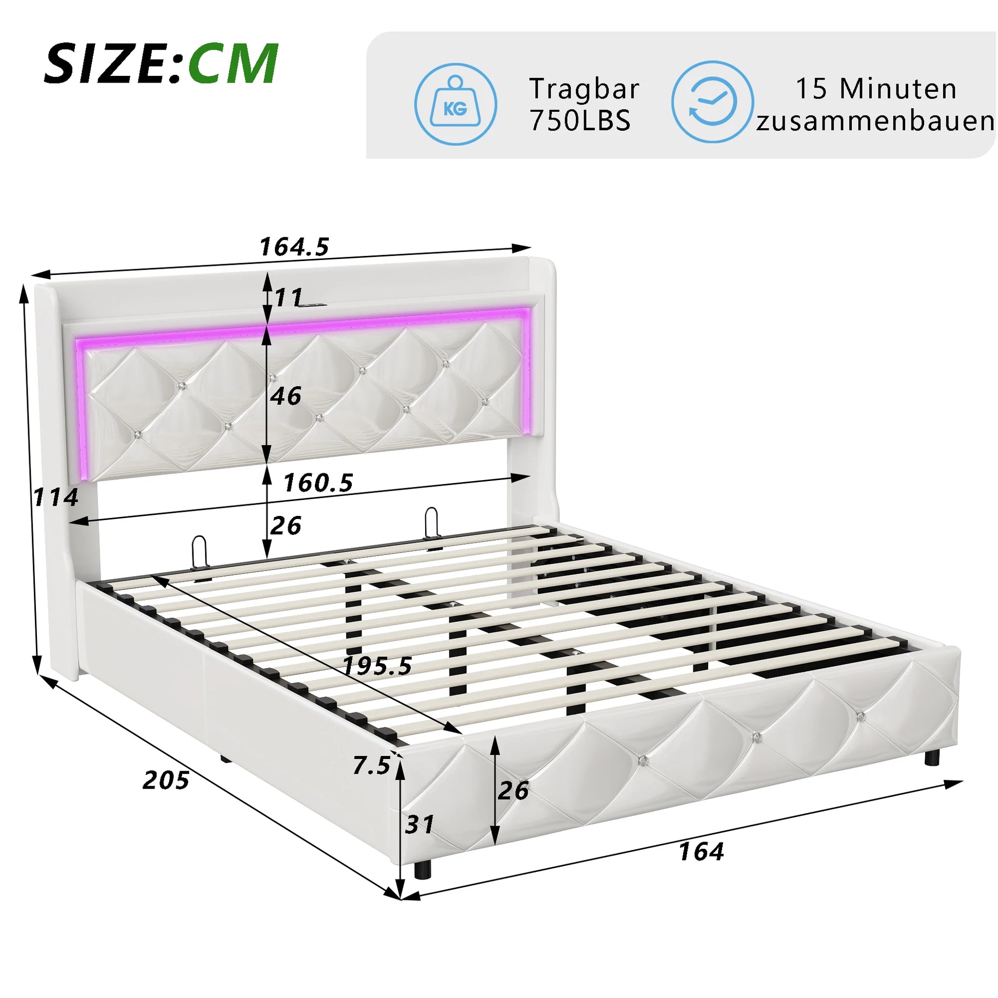 Rosahqnda Doppel-Jugendbettgestell 140–160 x 200 cm mit hydraulischem LED- und USB-Aufbewahrungsbett, Einzelbett, Gäste-/Master-Schlafzimmer, PU, weiß/schwarz