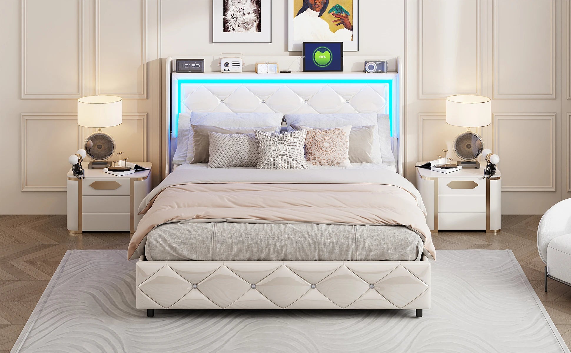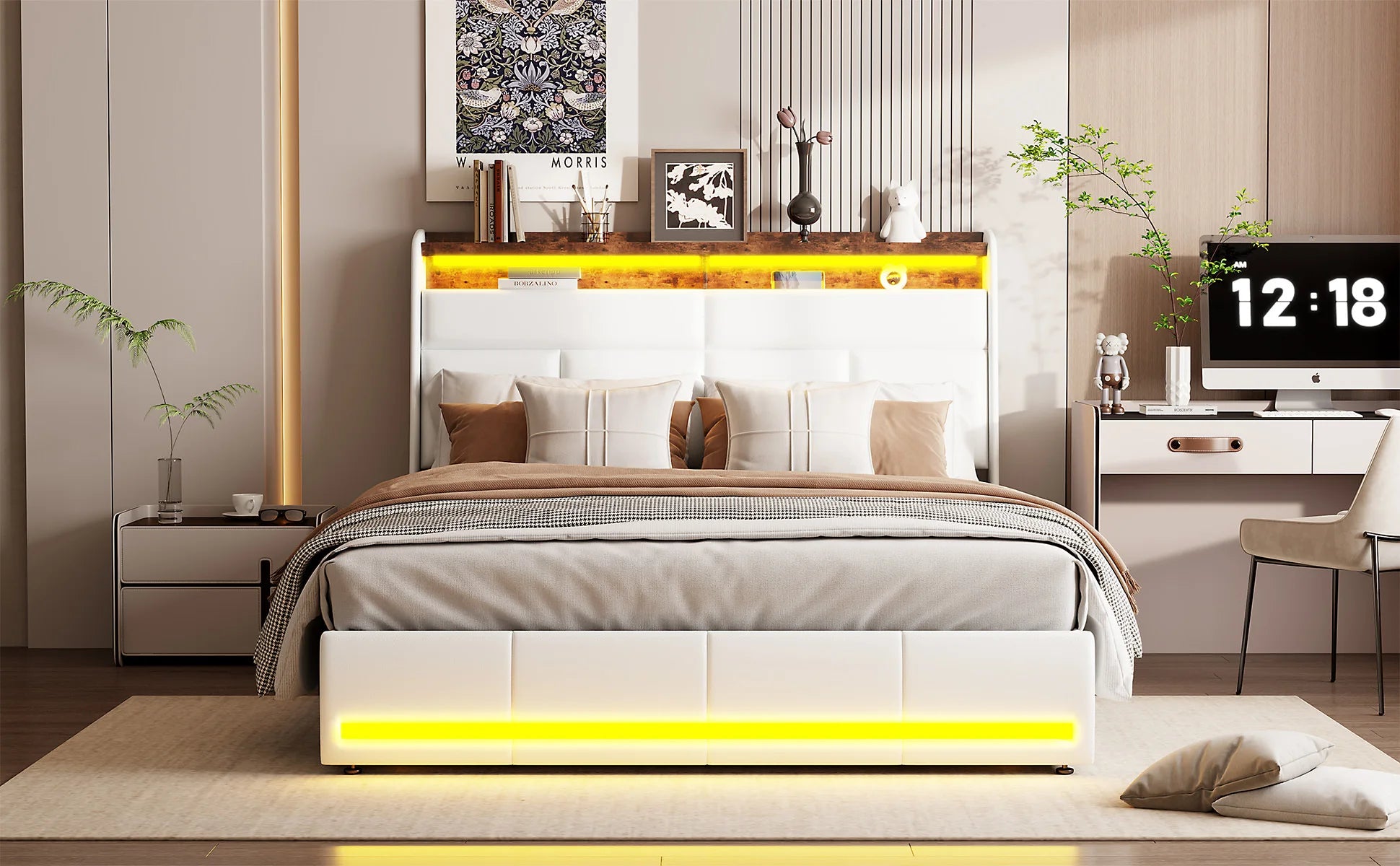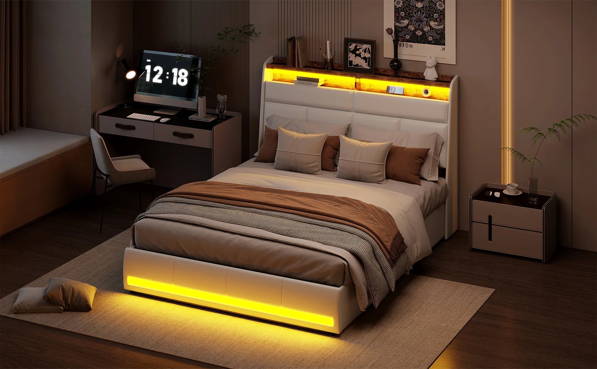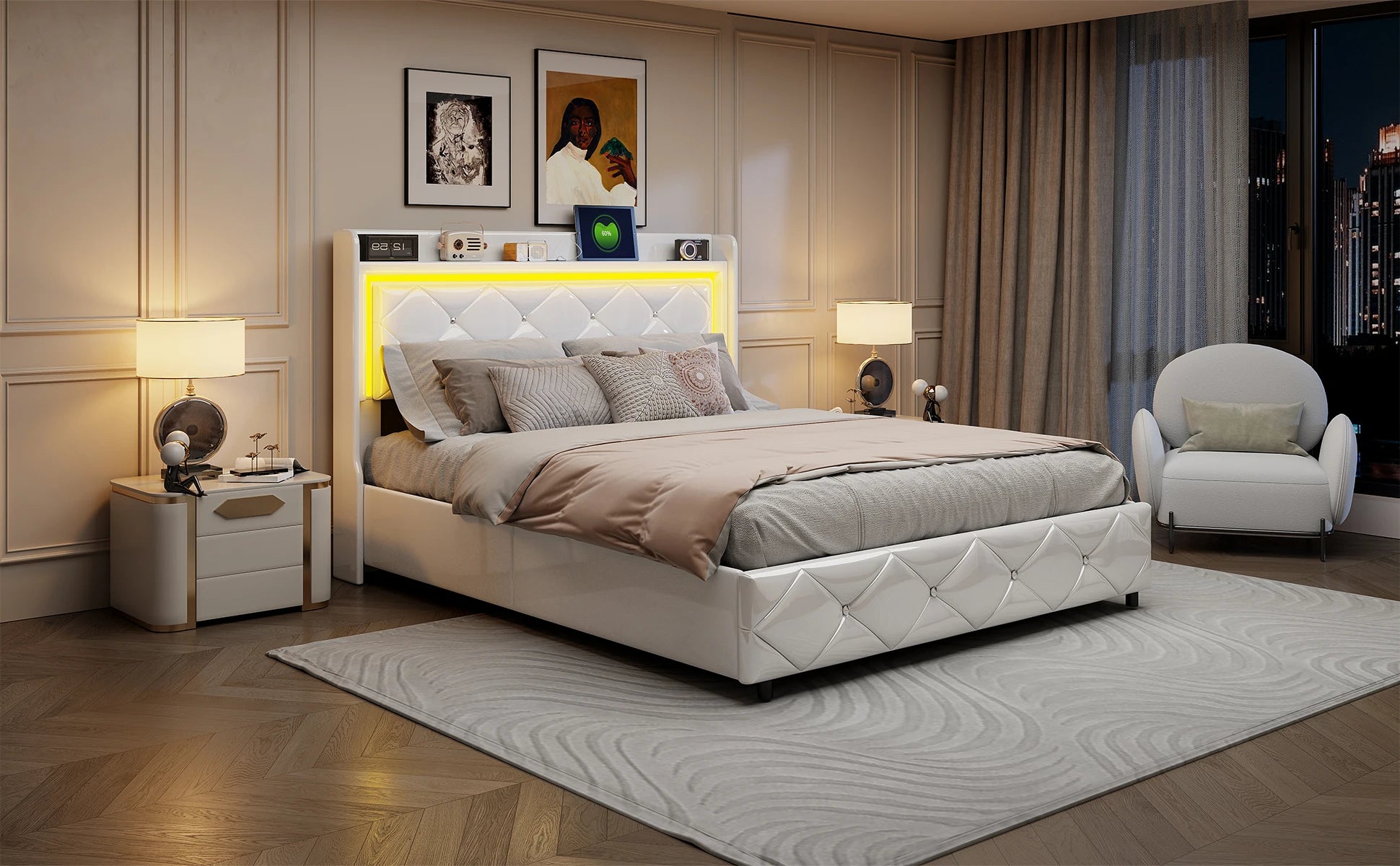 Rosahqnda Doppel-Jugendbettgestell 140–160 x 200 cm mit hydraulischem LED- und USB-Aufbewahrungsbett, Einzelbett, Gäste-/Master-Schlafzimmer, PU, weiß/schwarz