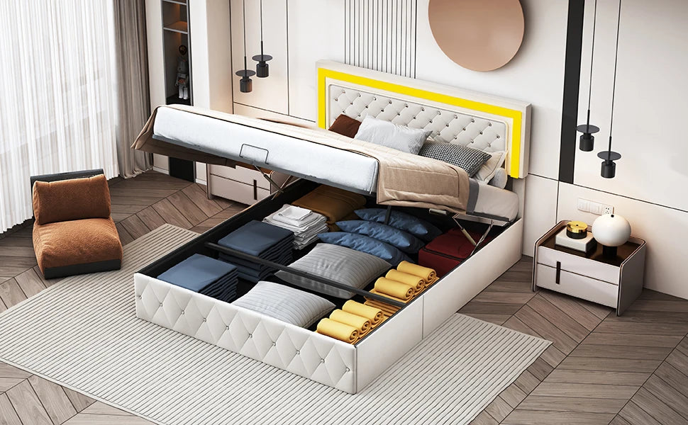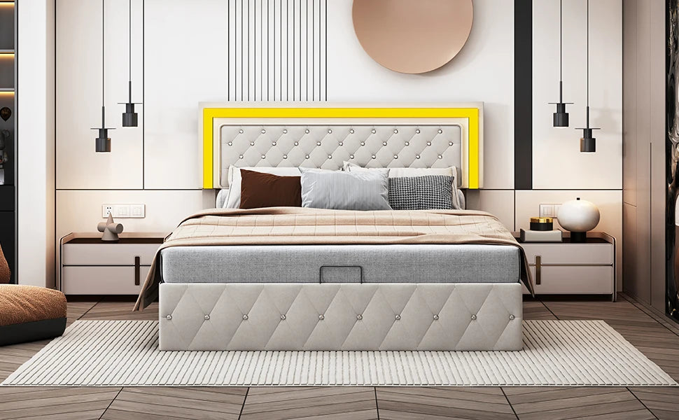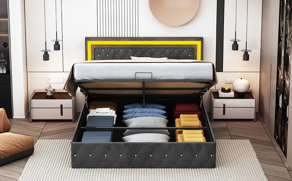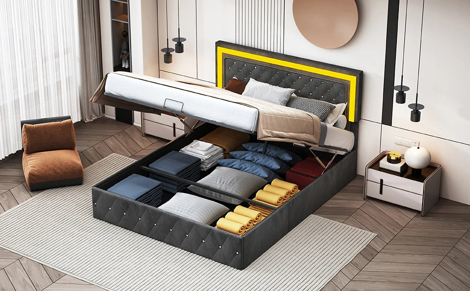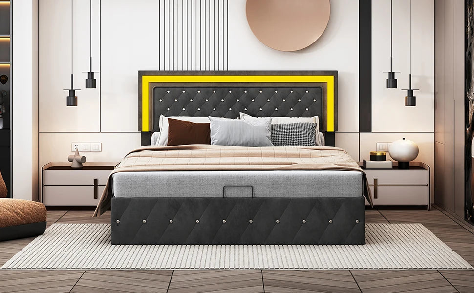 Rosahqnda Doppelbettgestell 140–160–180 x 200 cm, verstellbares LED-Kopfteil, hydraulisches Bett mit Stauraum, gepolstertes Jugendbett, Samt