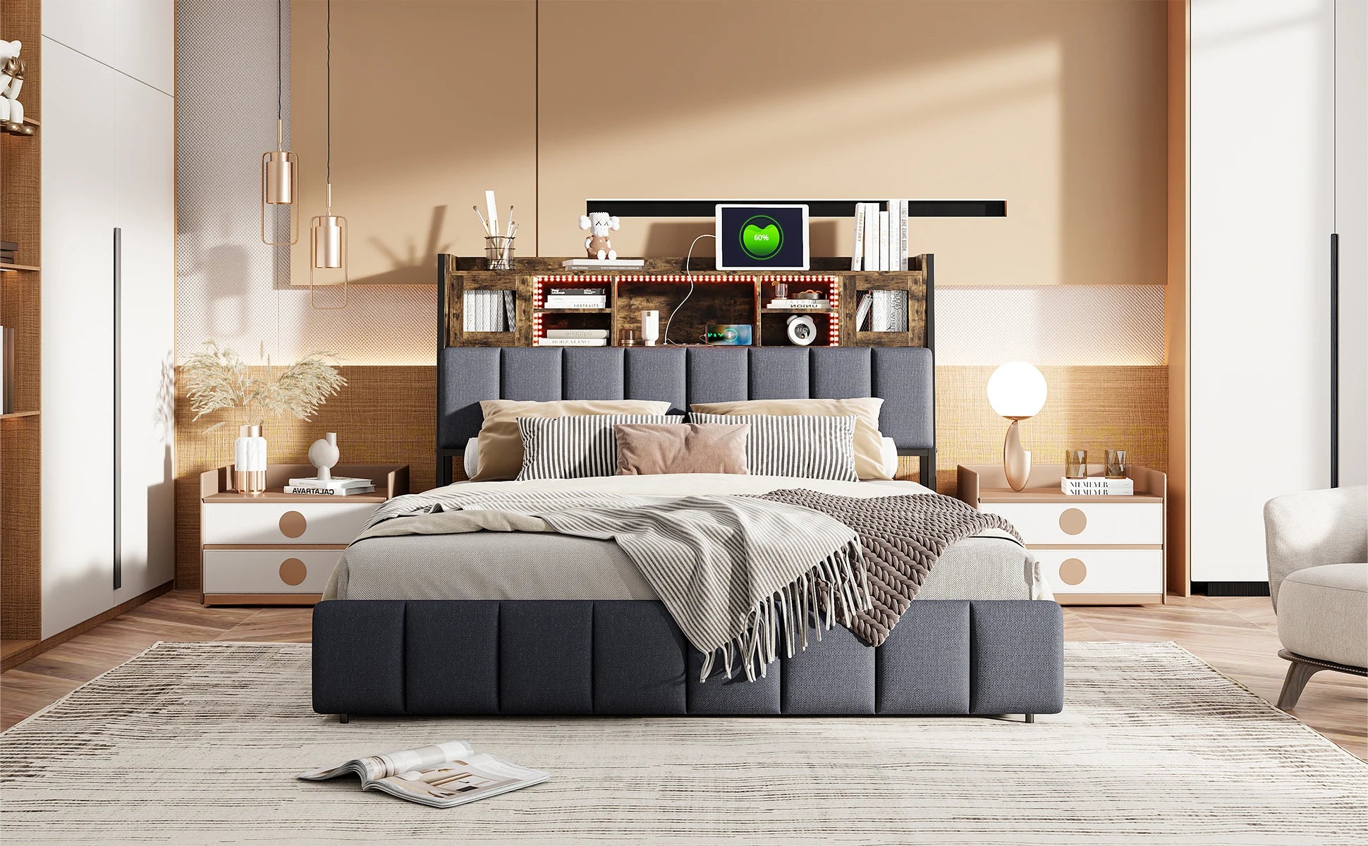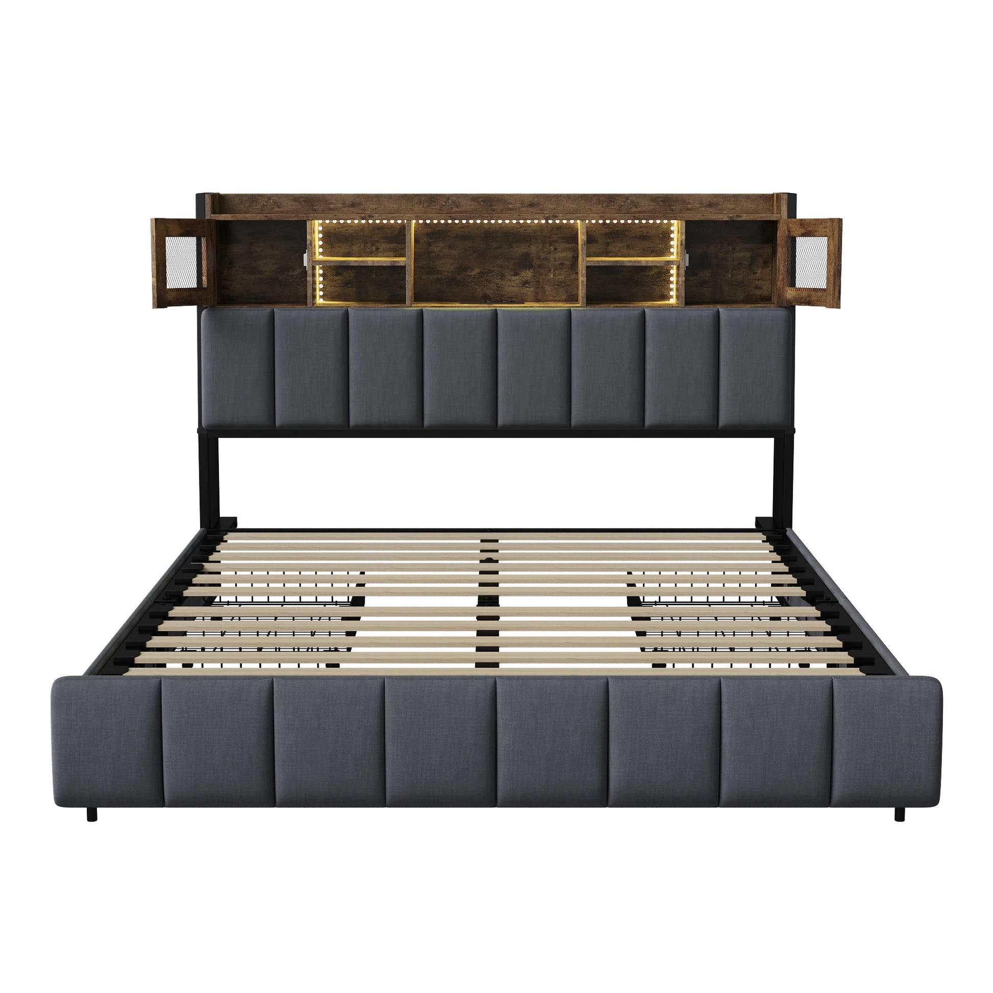 Rosahqnda Doppelbettgestell 140–160 x 200 cm mit LED, USB und Schubladen, gepolstertes Jugendbett, Wohnungsbett, Gästezimmer, Leinen, Grau