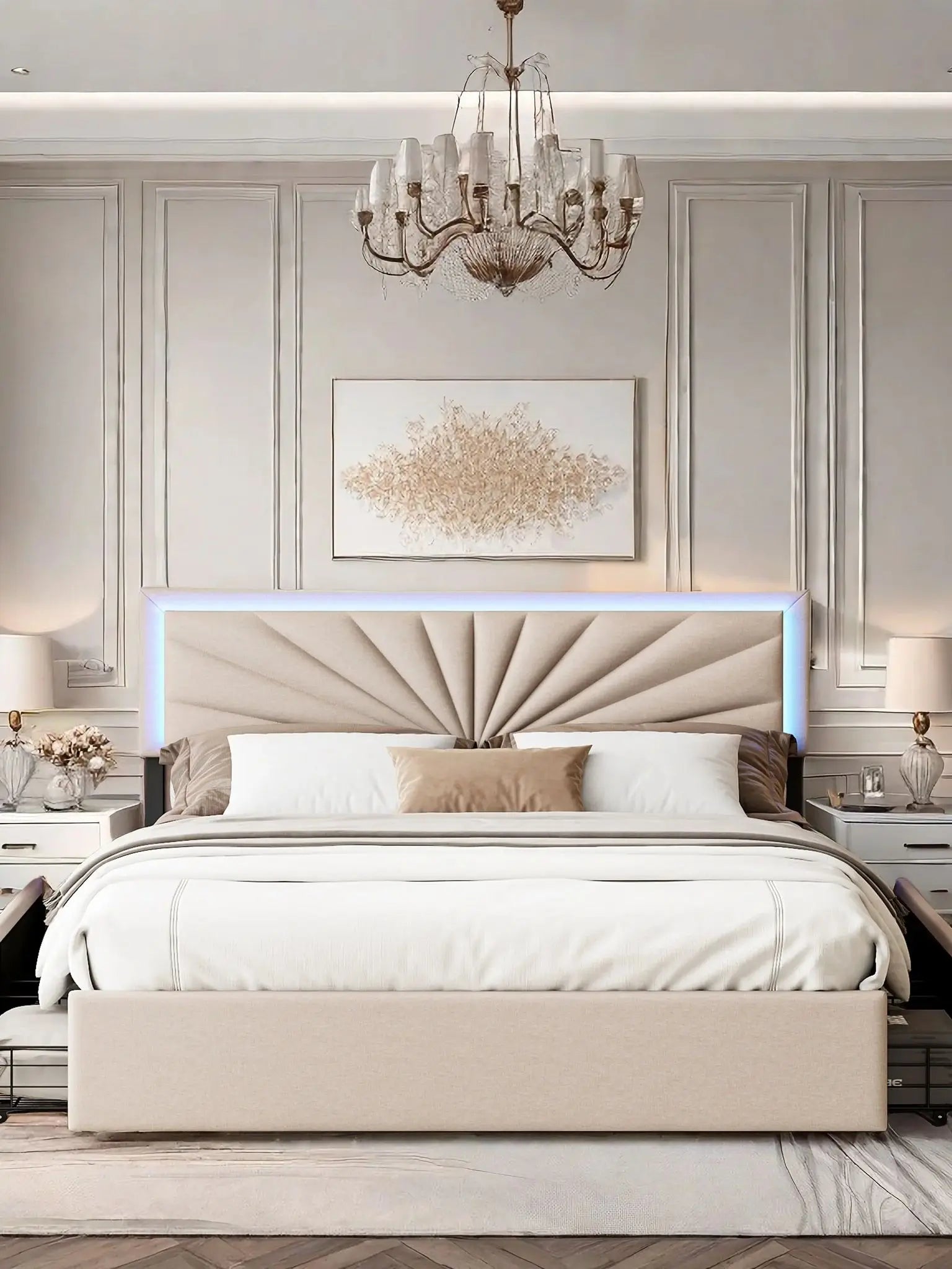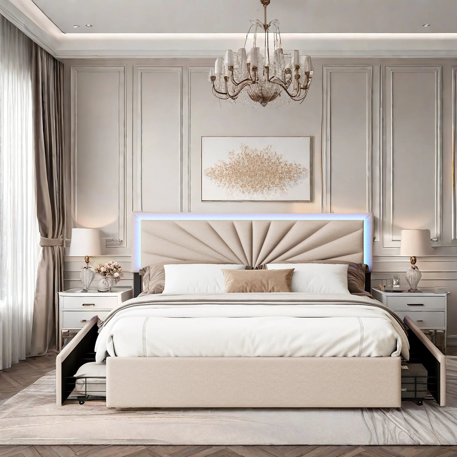 ROSAHQNDA Gepolstertes Doppelbett 140/160 x 200 cm, LED-Aufbewahrungsbett mit Schubladen, mit Kopfteil und Lattenrost, ohne Matratze