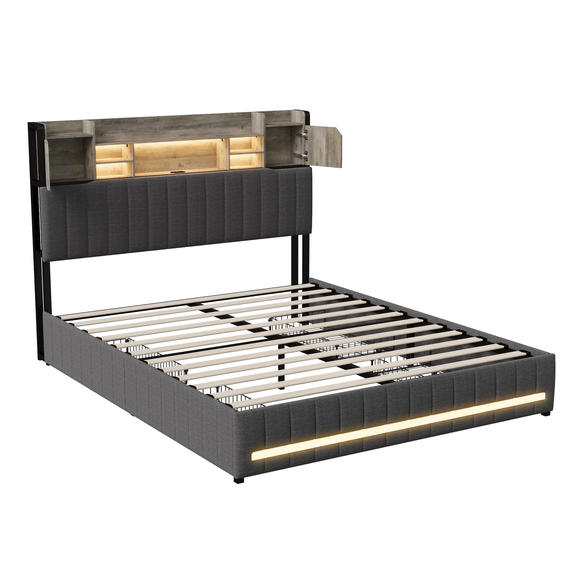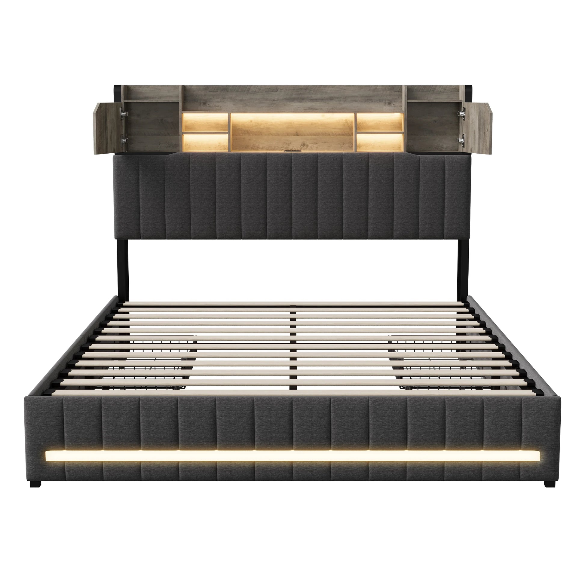 Rosahqnda gepolstertes Doppelbett mit LED-Kopfteil und USB-Anschluss, Stauraumbett mit 4 Schubladen, Leinen, ohne Matratze